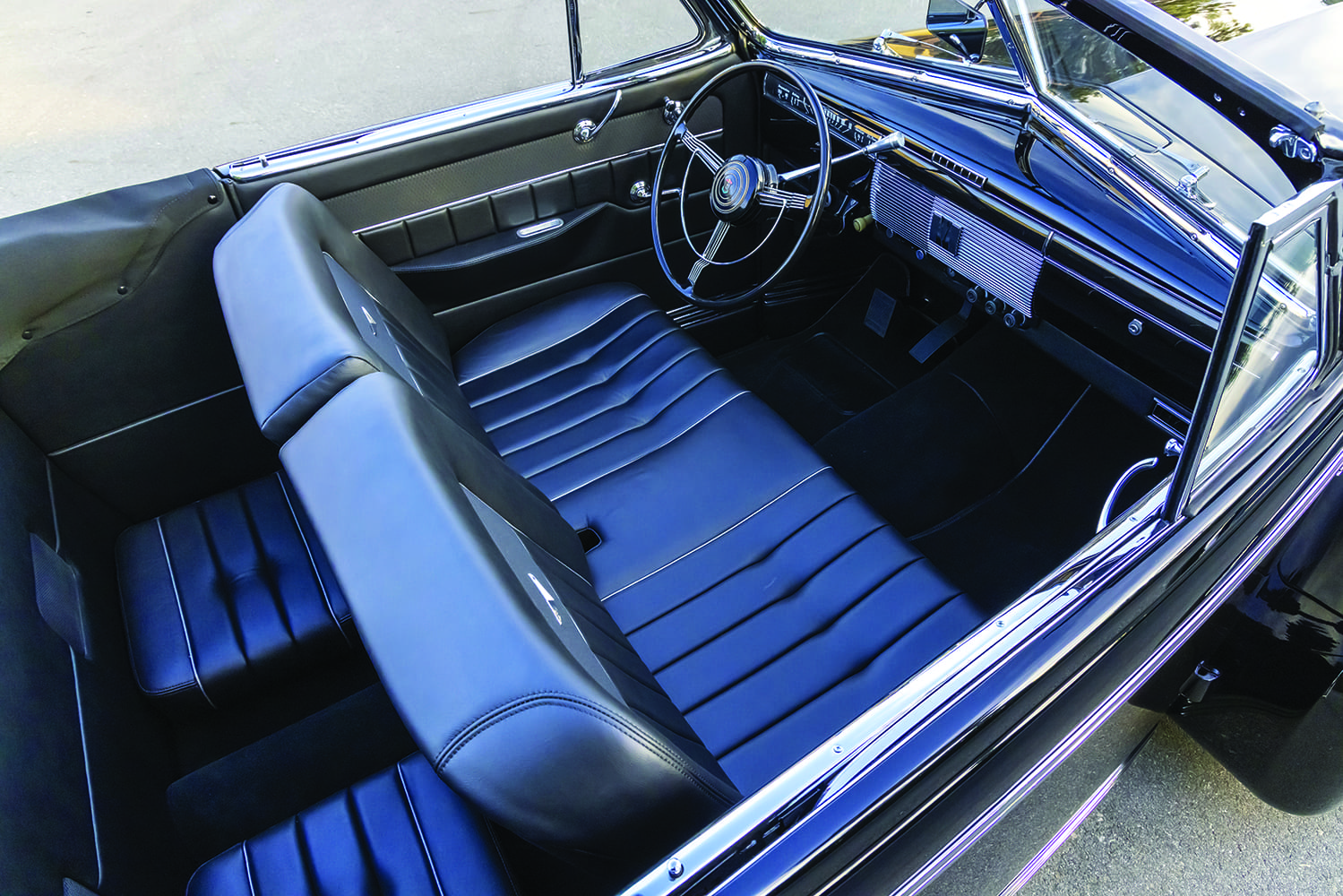Then Mark Lopez of Elegance Auto Interiors (EAI) took it from there, applying their handiwork to cover the front seats in black leather, cloth, and black carpeting. The black leather stitching from EAI is also visible on the door and kick panels, as well as the opposing jump rear seats and boot cover. Utilizing its now-chromed original top bows, the top was stitched together at EAI.