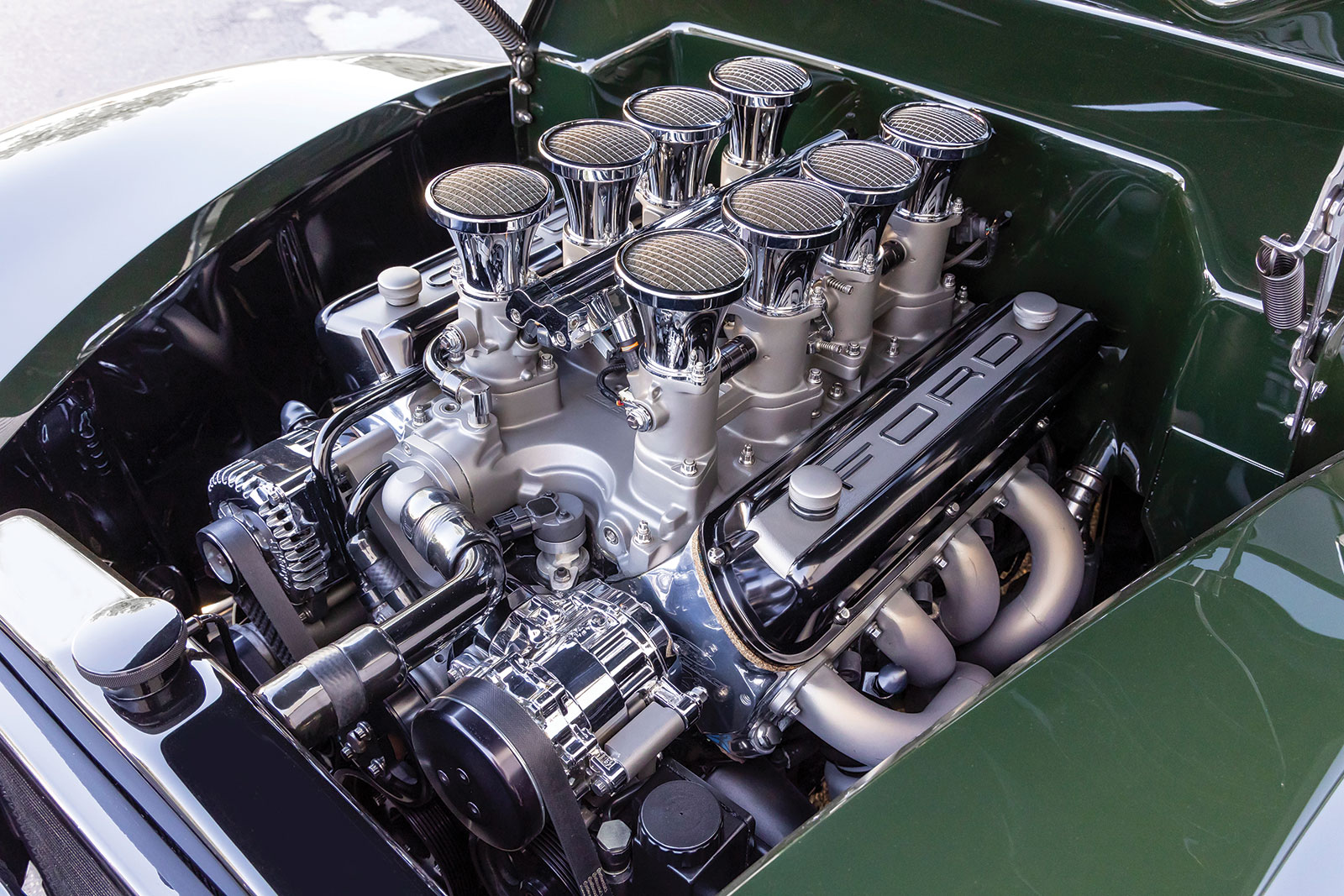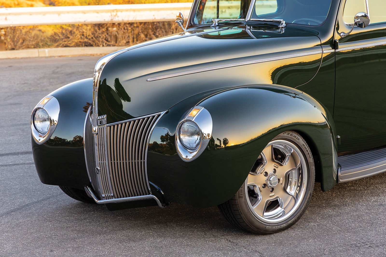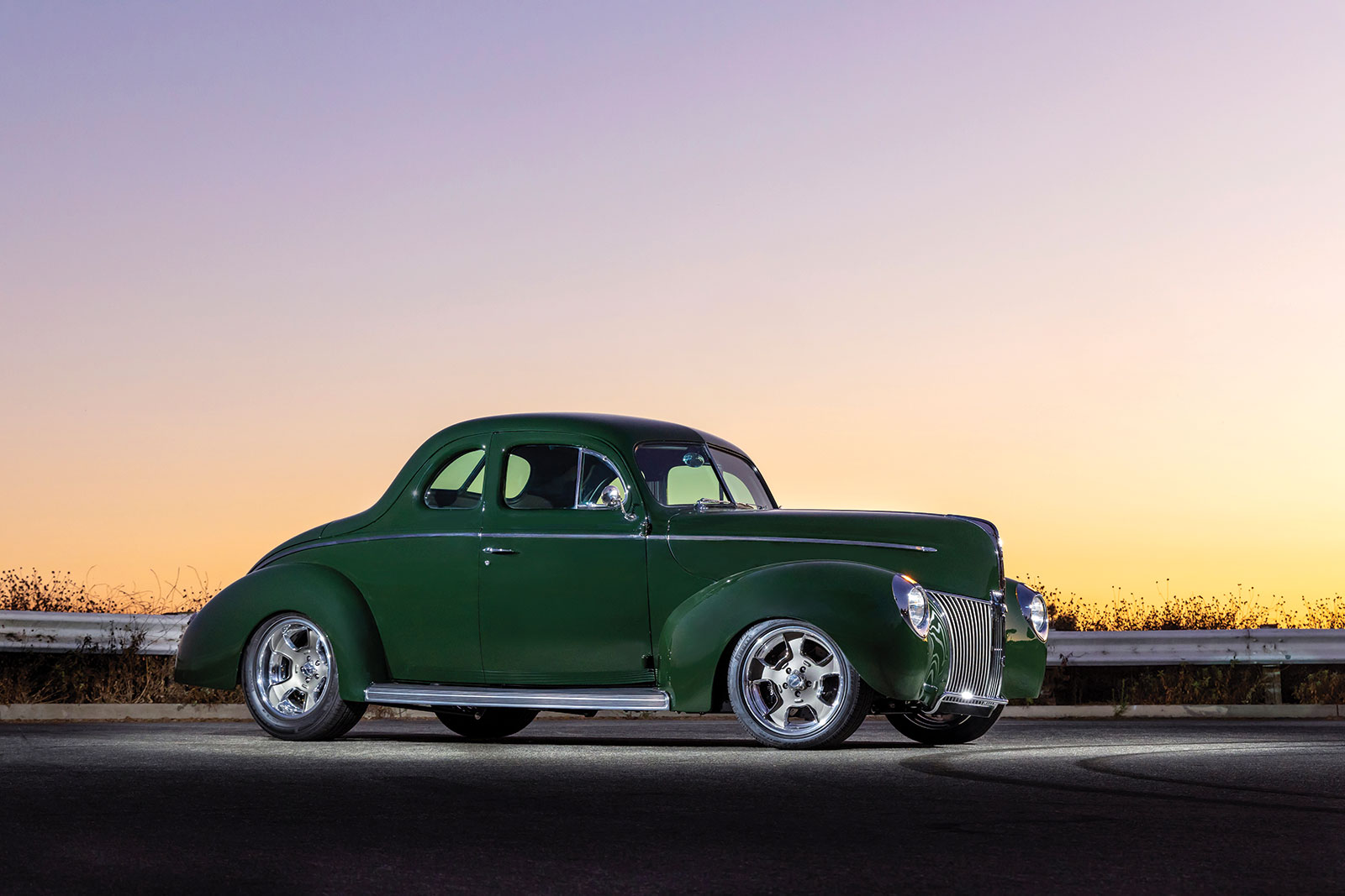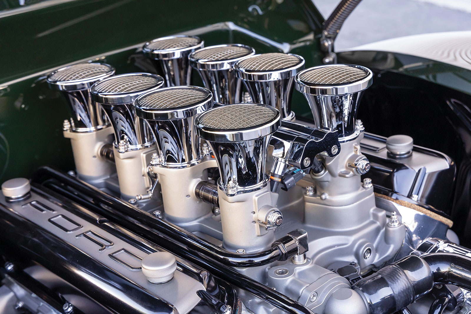 The body is a 1940 Ford coupe that has had the firewall, floorboards, and trunk floor modified along with a set of rear wheel tubs installed while at Wheeler’s. The bodywork was then performed by Palmer’s Customs and painted in a Porsche Brewster Green.