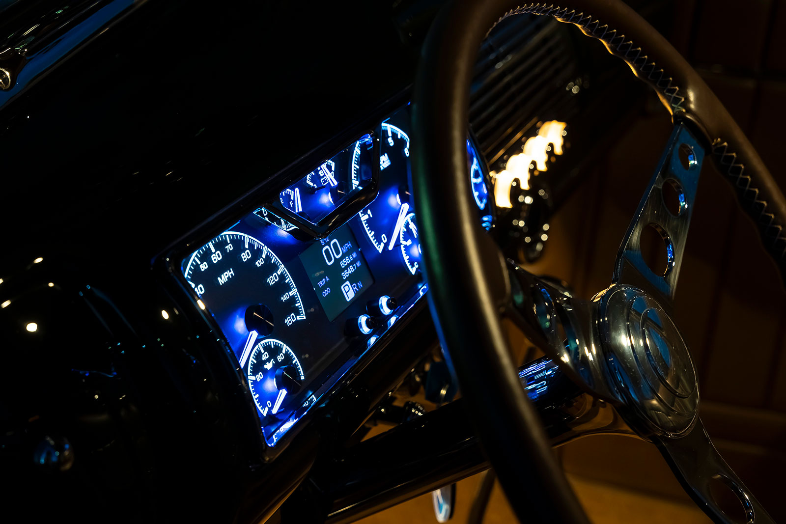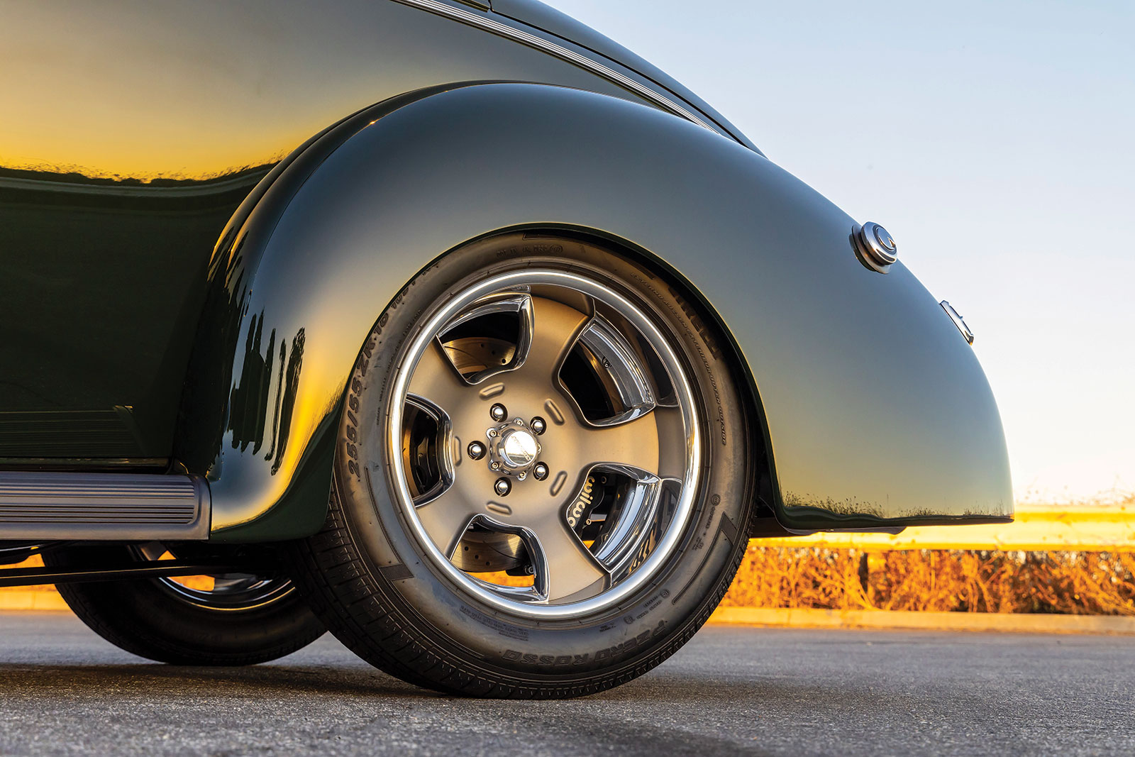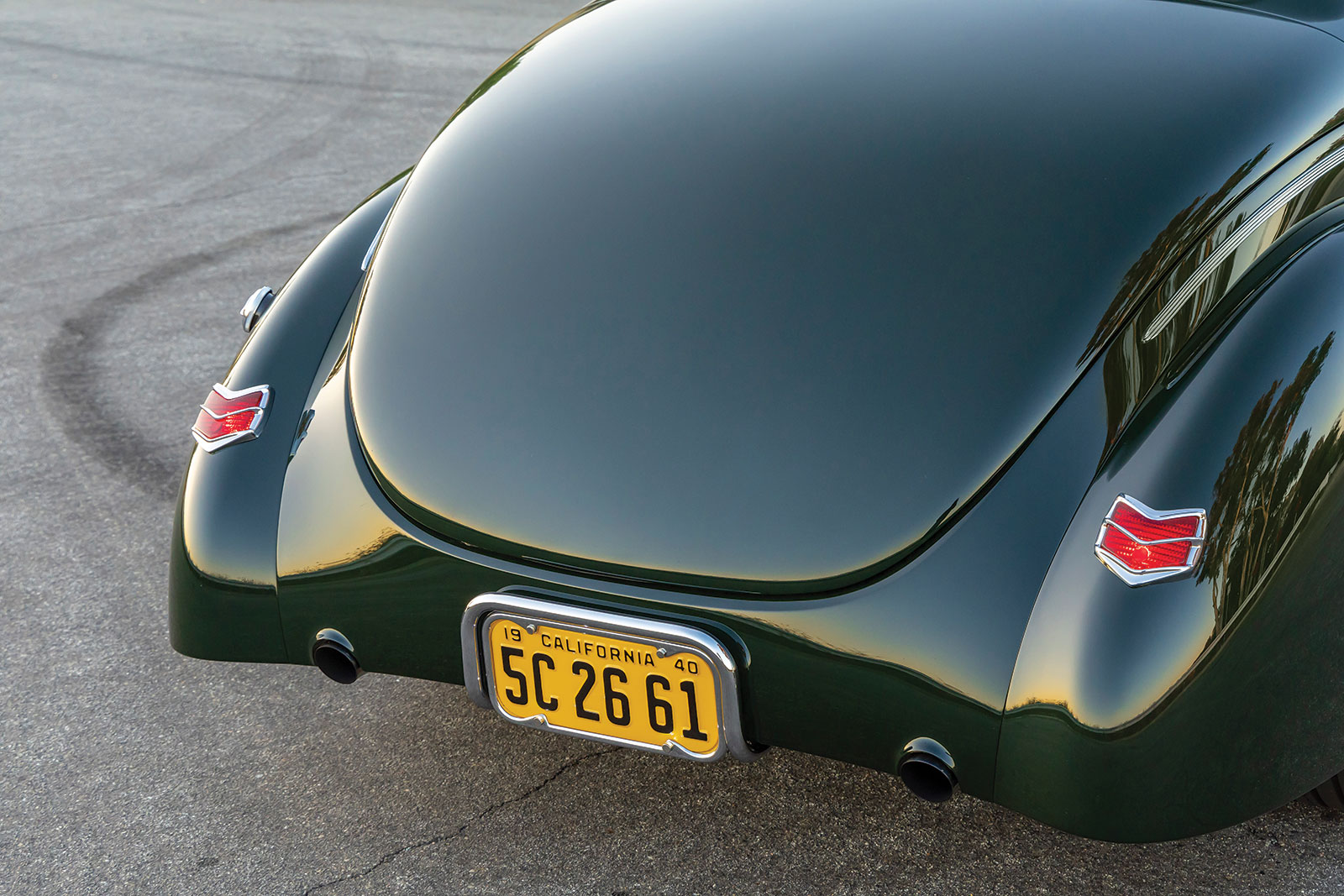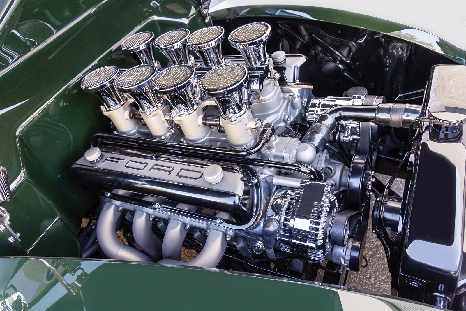 The body is a 1940 Ford coupe that has had the firewall, floorboards, and trunk floor modified along with a set of rear wheel tubs installed while at Wheeler’s. The bodywork was then performed by Palmer’s Customs and painted in a Porsche Brewster Green.