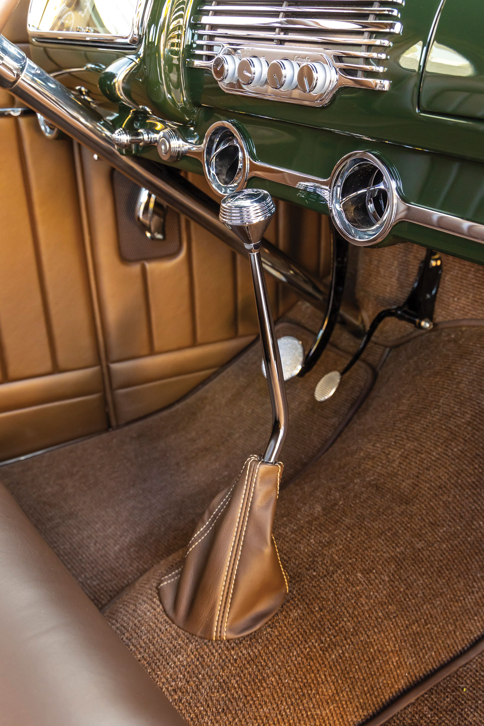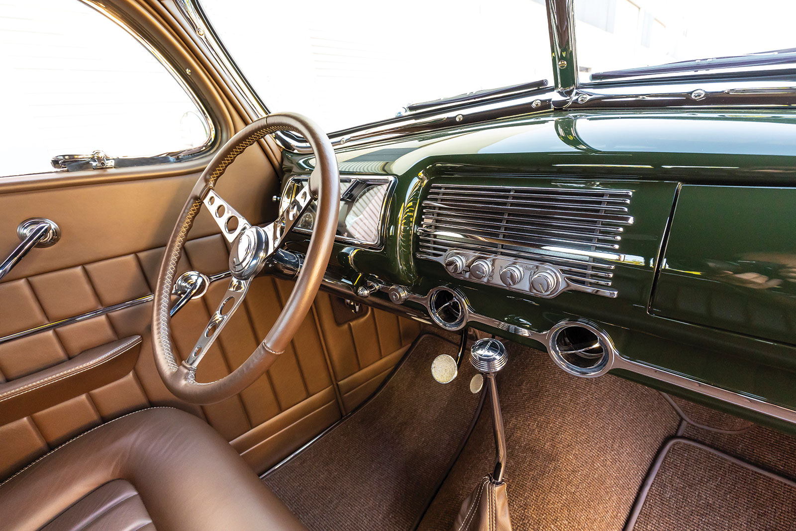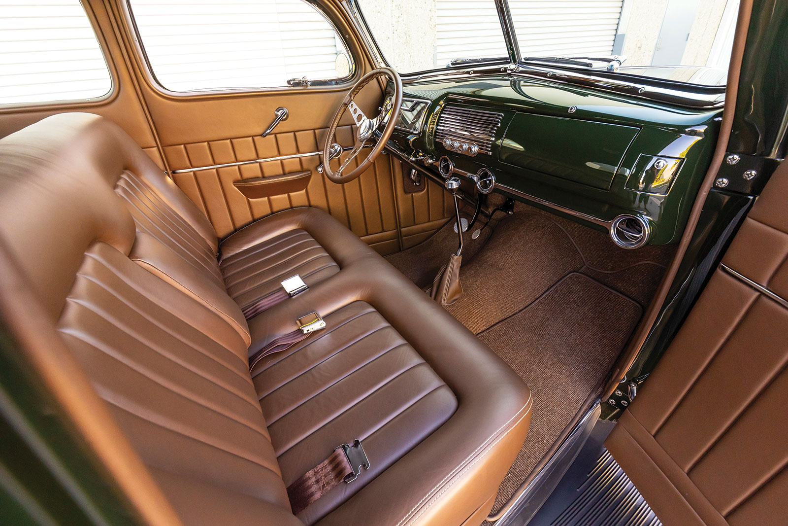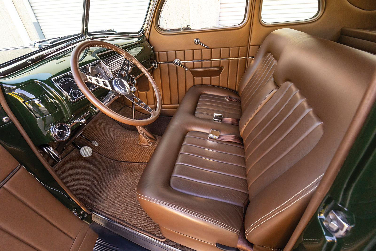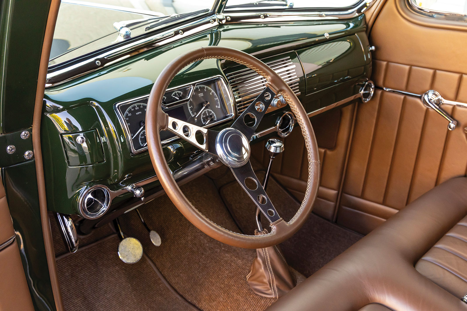 Once inside the coupe you will see a stock 1940 dashboard that now features a custom lower section, which houses the Vintage Air registers as well as the ignition key and headlight switch. The Vintage Air controls are mounted directly in the center of the dash below what would have been the speaker grille section. If you are wondering about the instruments, wonder no more as they are directly from Dakota Digital and are wired using an American Autowire kit, as is the rest of the hot rod. More hot rod industry hardware includes the use of a LimeWorks Speed Shop steering column with a three-spoke leather-wrapped wheel from Juliano’s Hot Rod Parts. The seating is a bench by way of Glide Engineering that was stitched, as was the remainder of the interior, while at Gabe’s Street Rod Custom Interiors. The interior leather is colored in an Espresso brown following through to the headliners, doors, and other related panels, while a tight weave brown carpeting is used. A “spoon” early-style throttle along with more traditional fare, such as the round brake pedal, are all pressed into service.