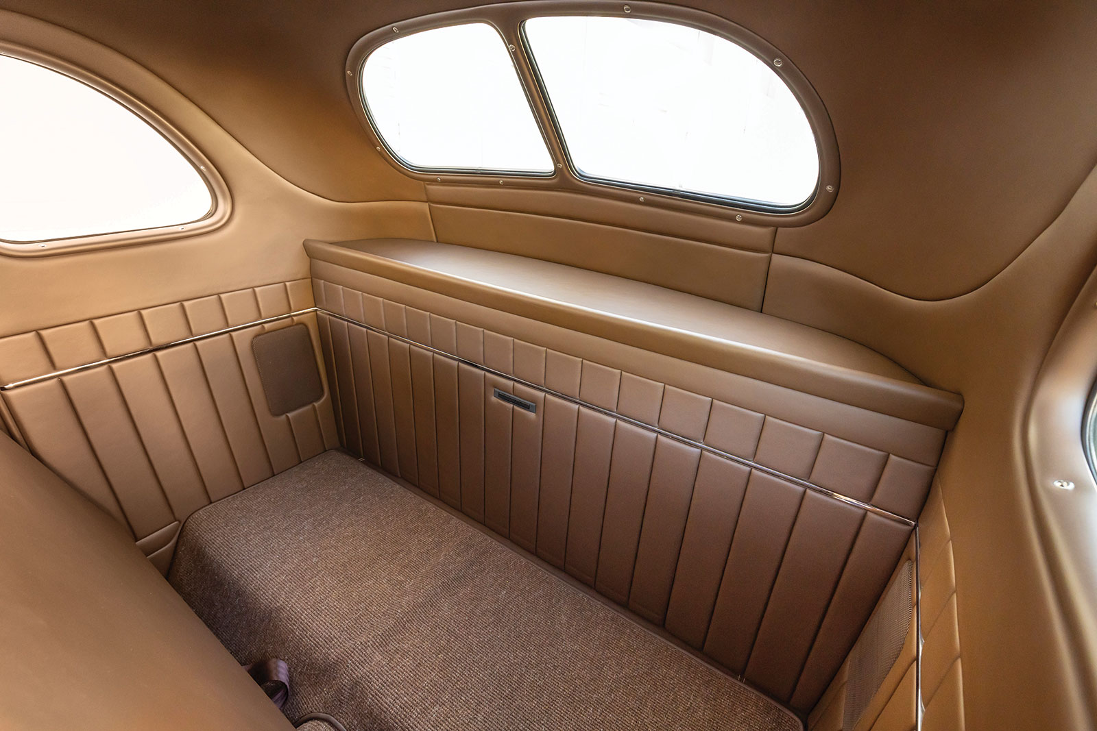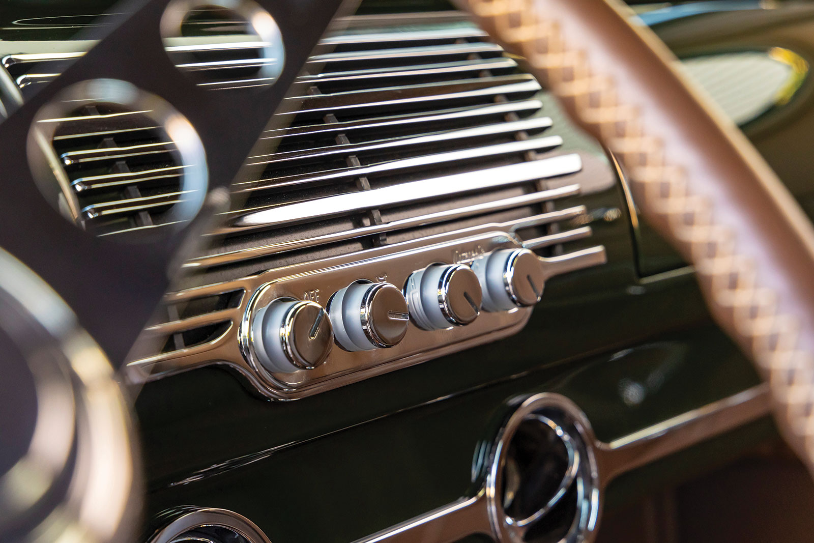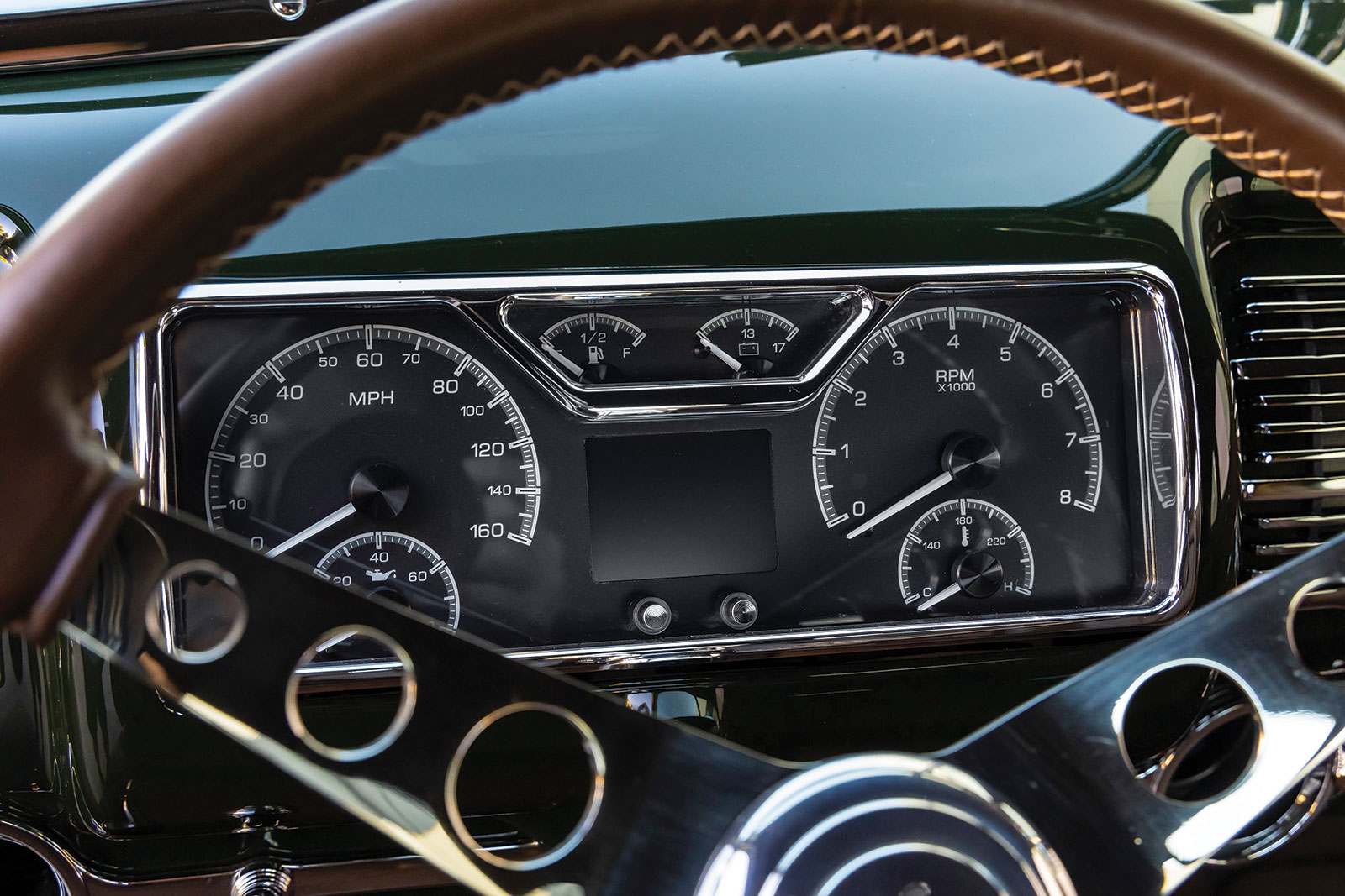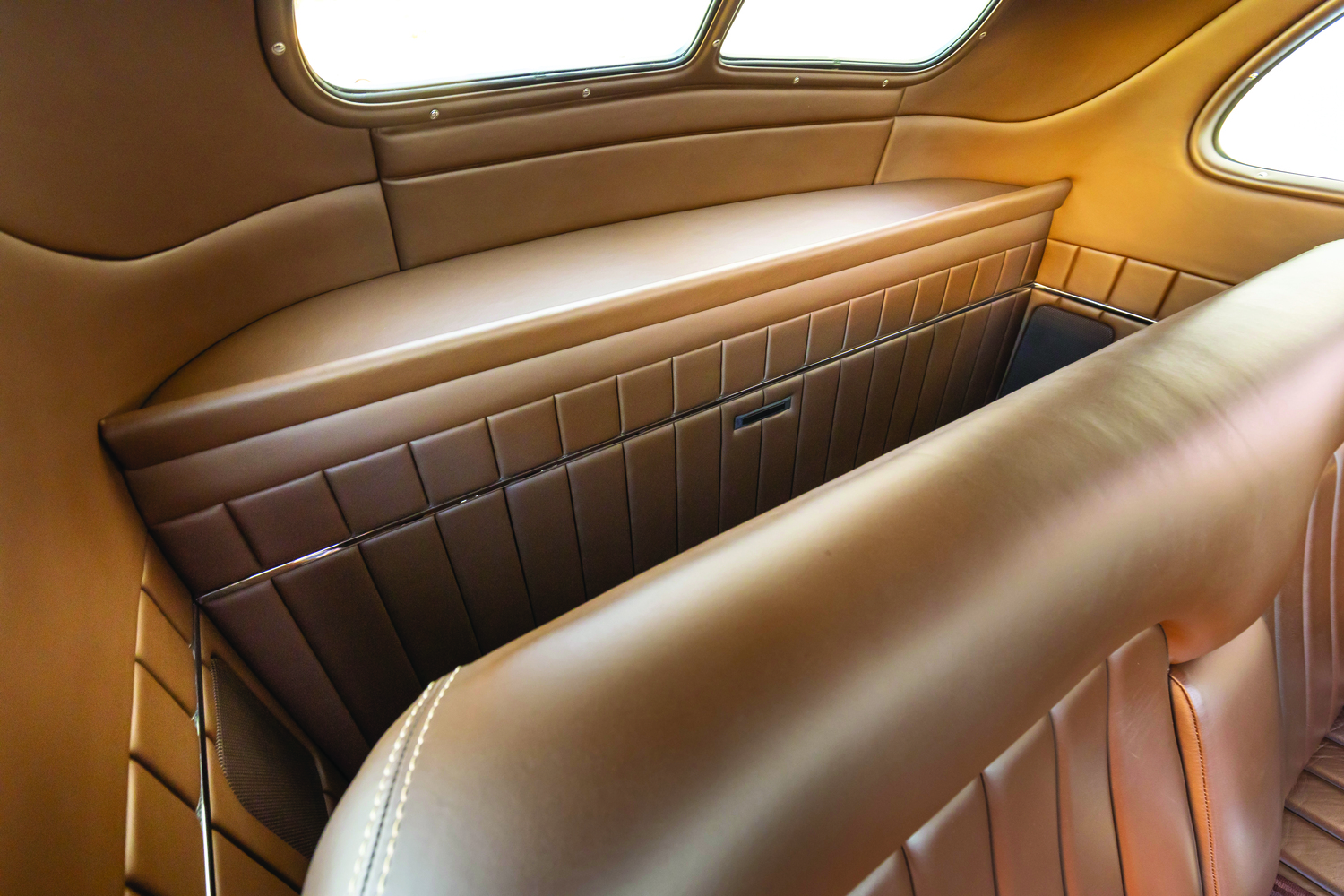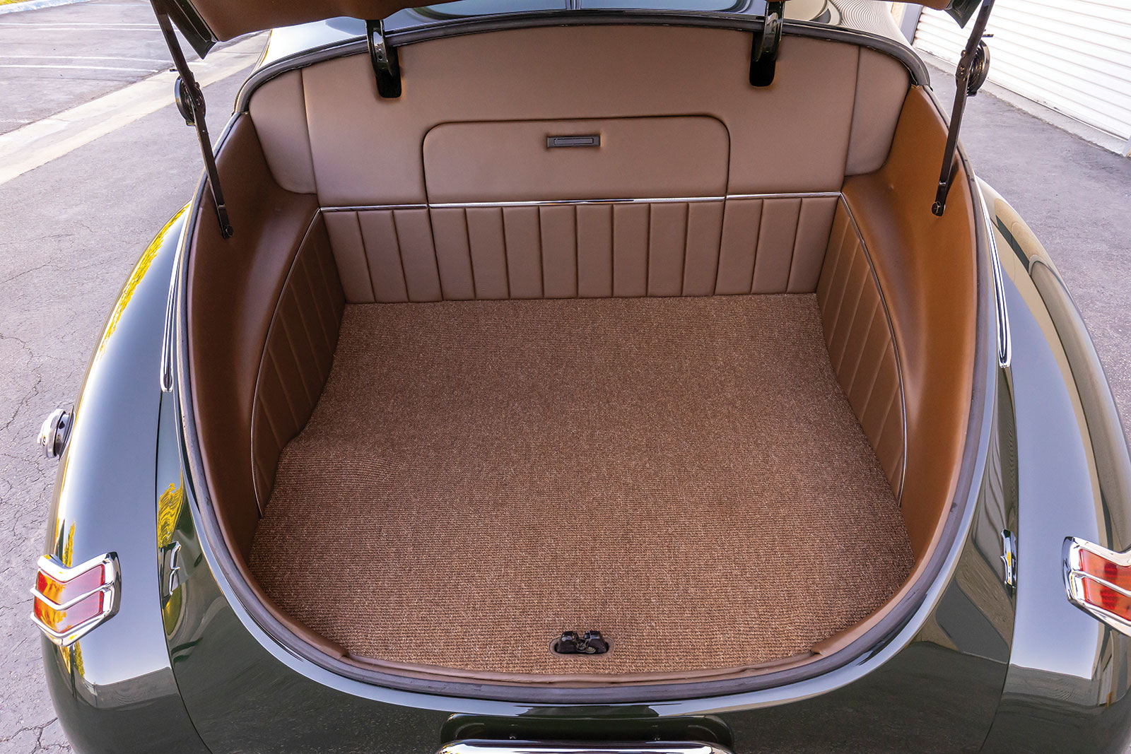 Once inside the coupe you will see a stock 1940 dashboard that now features a custom lower section, which houses the Vintage Air registers as well as the ignition key and headlight switch. The Vintage Air controls are mounted directly in the center of the dash below what would have been the speaker grille section. If you are wondering about the instruments, wonder no more as they are directly from Dakota Digital and are wired using an American Autowire kit, as is the rest of the hot rod. More hot rod industry hardware includes the use of a LimeWorks Speed Shop steering column with a three-spoke leather-wrapped wheel from Juliano’s Hot Rod Parts. The seating is a bench by way of Glide Engineering that was stitched, as was the remainder of the interior, while at Gabe’s Street Rod Custom Interiors. The interior leather is colored in an Espresso brown following through to the headliners, doors, and other related panels, while a tight weave brown carpeting is used. A “spoon” early-style throttle along with more traditional fare, such as the round brake pedal, are all pressed into service.