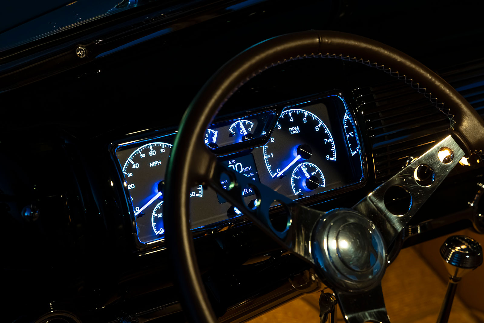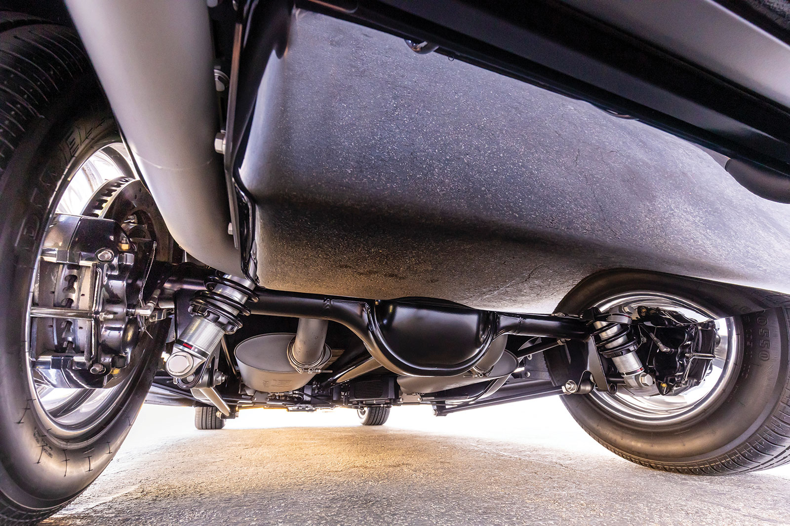 Gary and Bryan Wheeler of Wheeler’s Speed Shop met up and once they were on the same page the project began. The chassis is based on Total Cost Involved with a custom kickup in the back to make the ride height even lower. The front is a Total Cost Involved custom Independent Front Suspension with Total Cost Involved spindles, front sway bar, rack-and-pinion, and adjustable Ridetech coilovers. The front and rear brakes are based on Wilwood 13-inch drilled-and-slotted rotors and four-piston calipers all activated by an ABS electronic system and a pedal assembly from Wheeler’s. In the back a Total Cost Involved four-link and Panhard bar are used along with a Ford 9 inch rear end with 4.11 gears plus 31-spline Strange Engineering axles. A set of Magnitude Schott wheels are used that measure 17×7 and 18×10 all wrapped with Pirelli P Zero Rosso tires that shakes out at 205/50R17 and 255/55R18. A unique feature about these specific Pirelli tires is that they are made for use with differing tire sizes from front to rear.