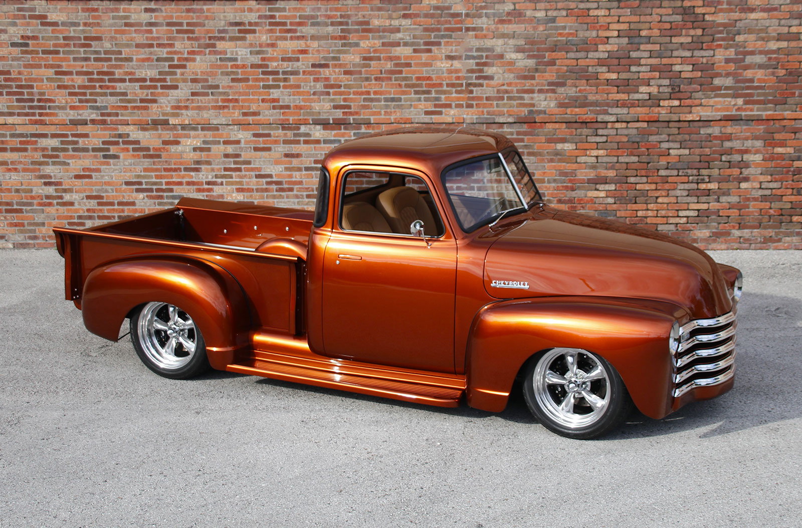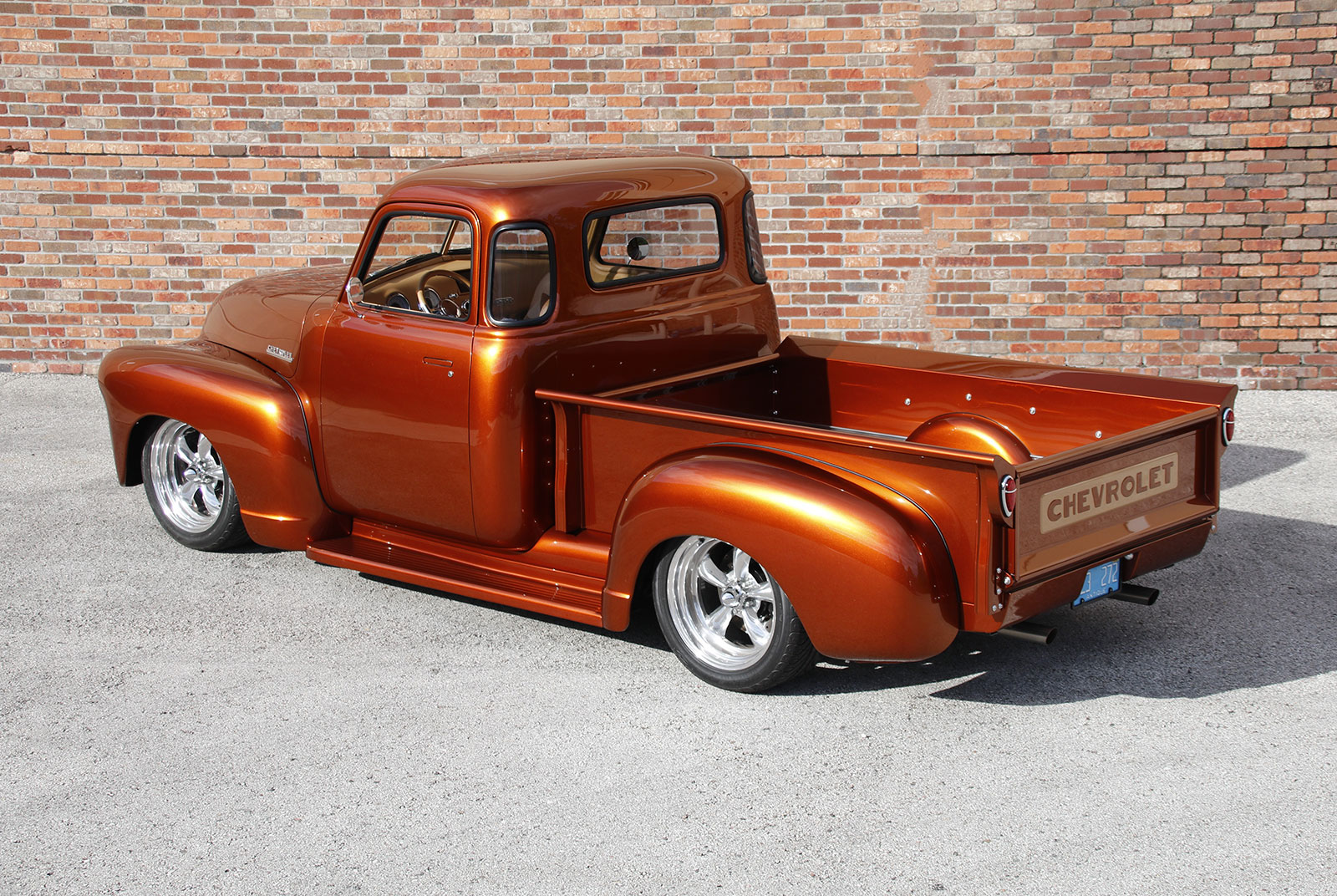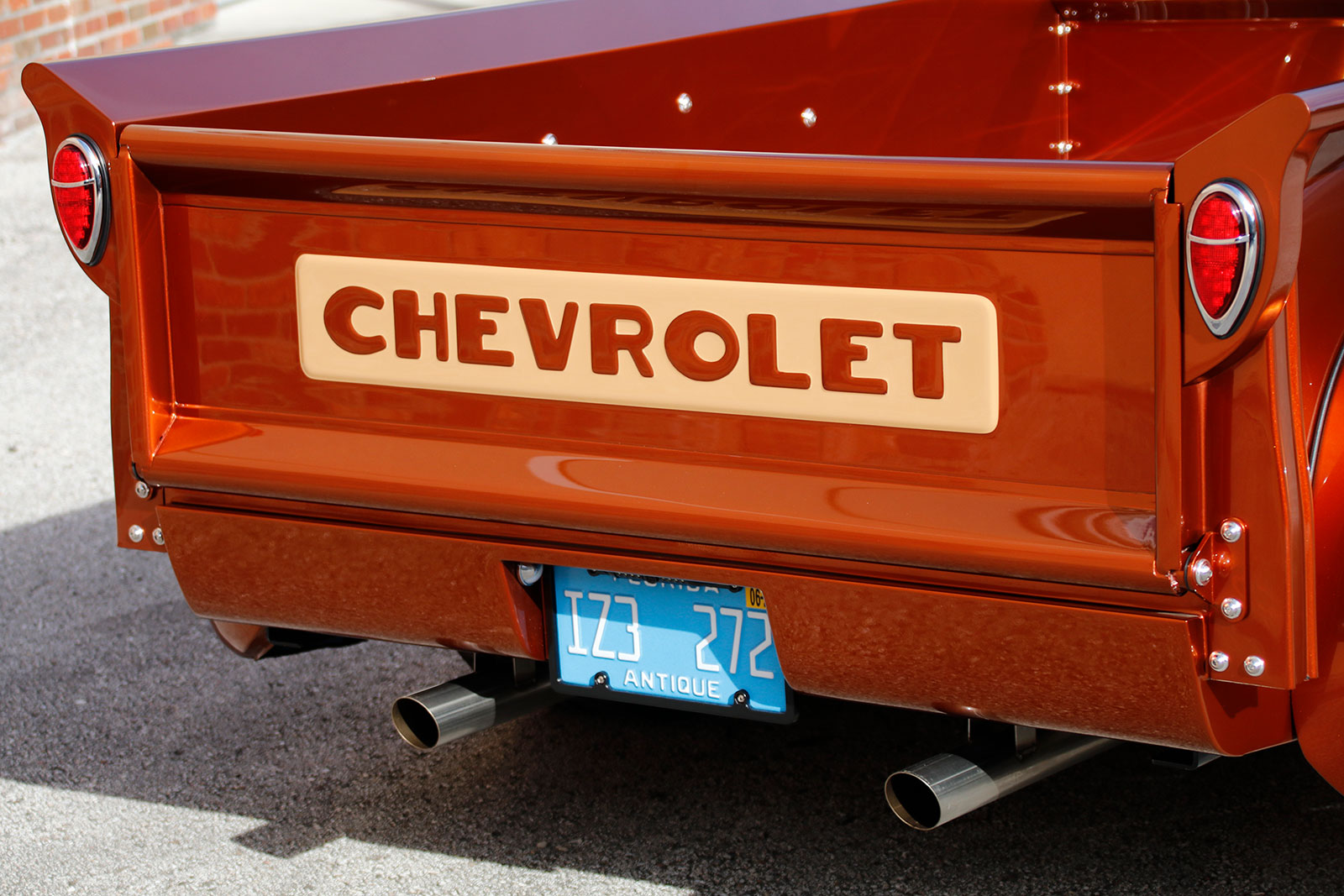 The paint comes from the PPG Vibrance line in Nutmeg. Tom wanted to share that Dave Clark was his point man on the project and did a top-notch job on the truck. Doors, hood, fender fitment, Hagan recessed light installation, and gaps are spot-on. The attention to detail was all part of Tom’s Chevy Advanced Design concept coming together nicely. Jeff Saldino, owner of Jeff’s Restorations, suggested reversing out the “Chevrolet” on the tailgate for a different look.