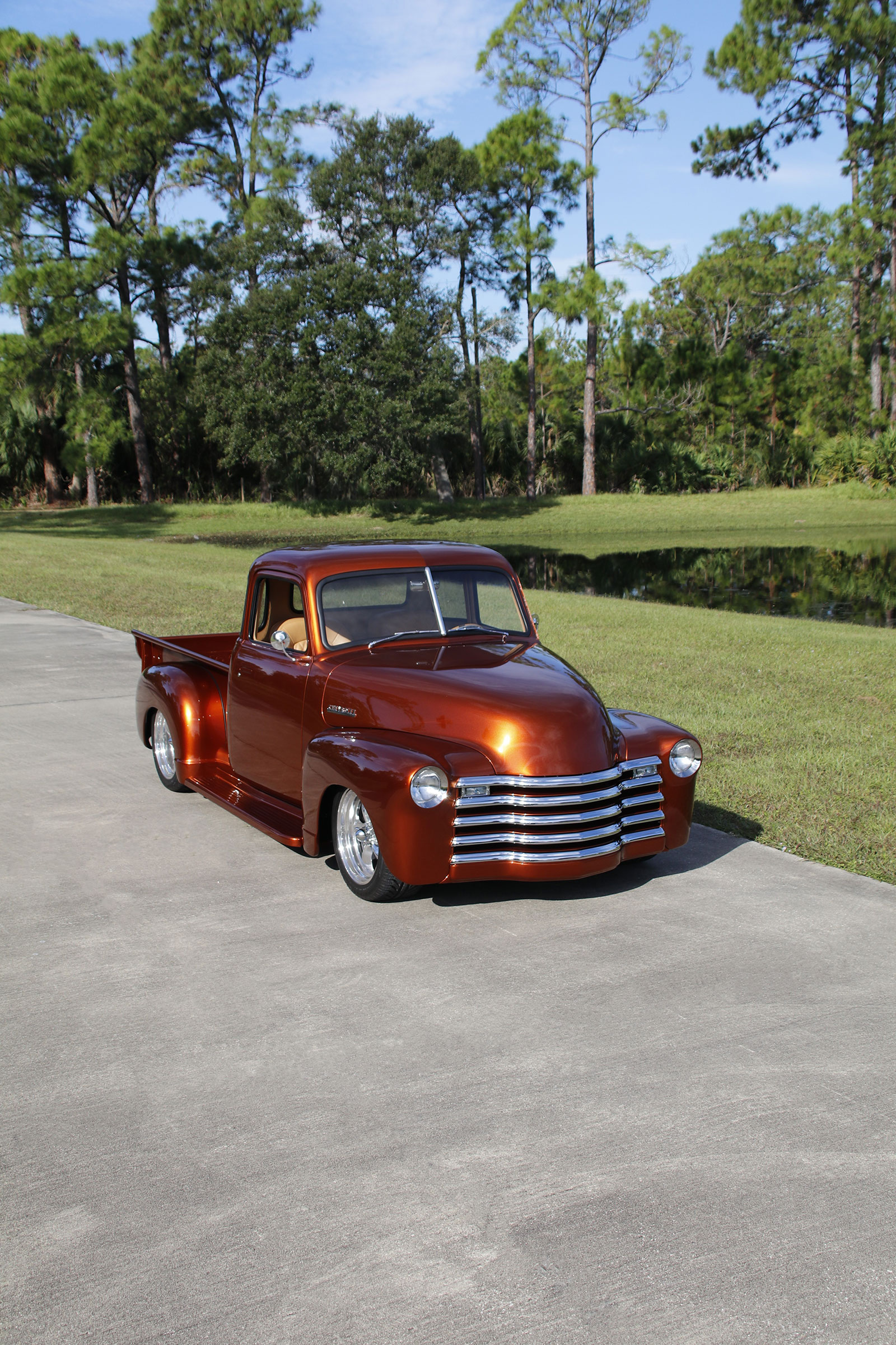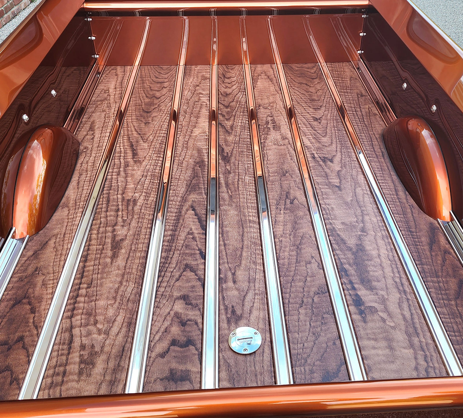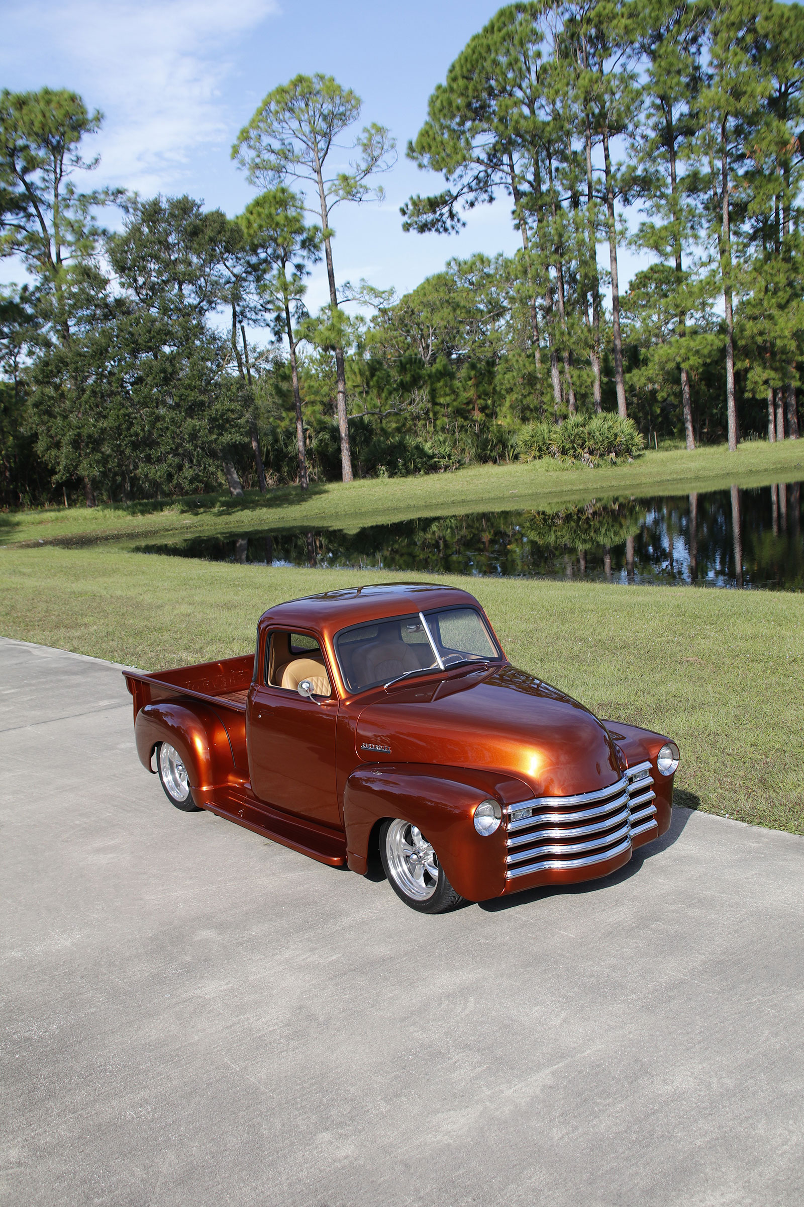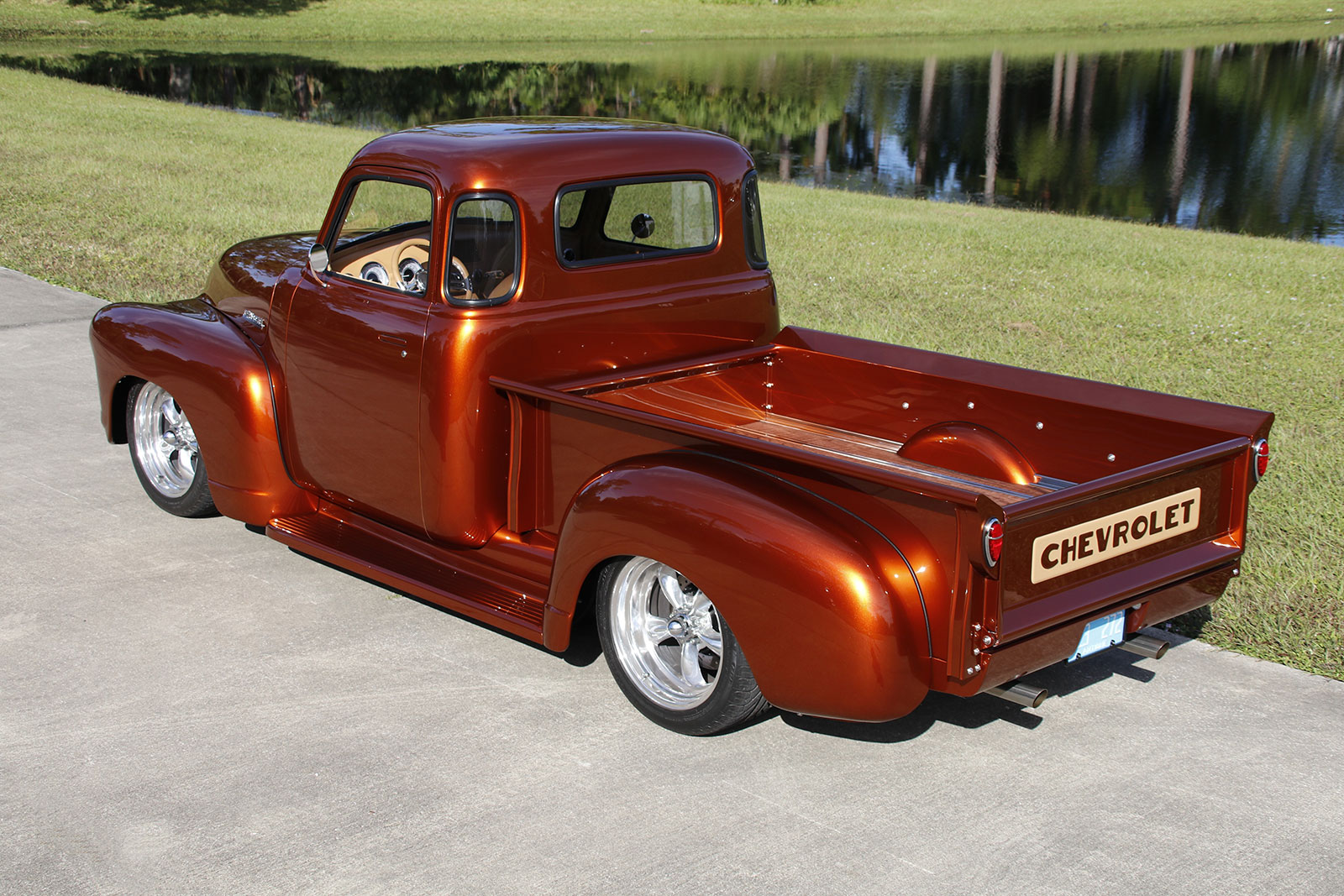 The paint comes from the PPG Vibrance line in Nutmeg. Tom wanted to share that Dave Clark was his point man on the project and did a top-notch job on the truck. Doors, hood, fender fitment, Hagan recessed light installation, and gaps are spot-on. The attention to detail was all part of Tom’s Chevy Advanced Design concept coming together nicely. Jeff Saldino, owner of Jeff’s Restorations, suggested reversing out the “Chevrolet” on the tailgate for a different look.