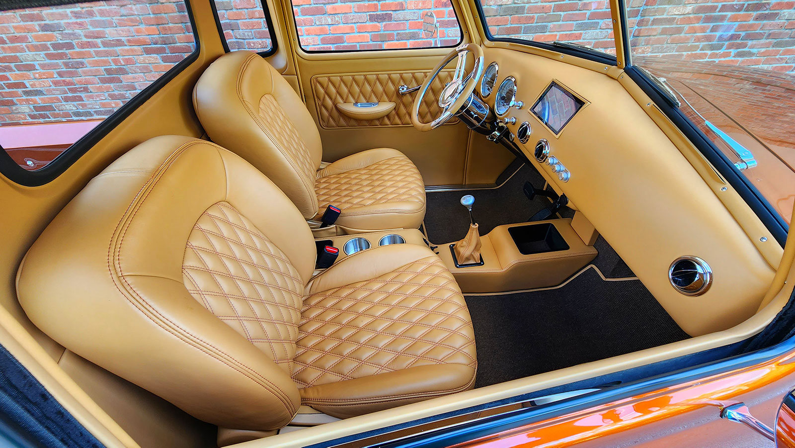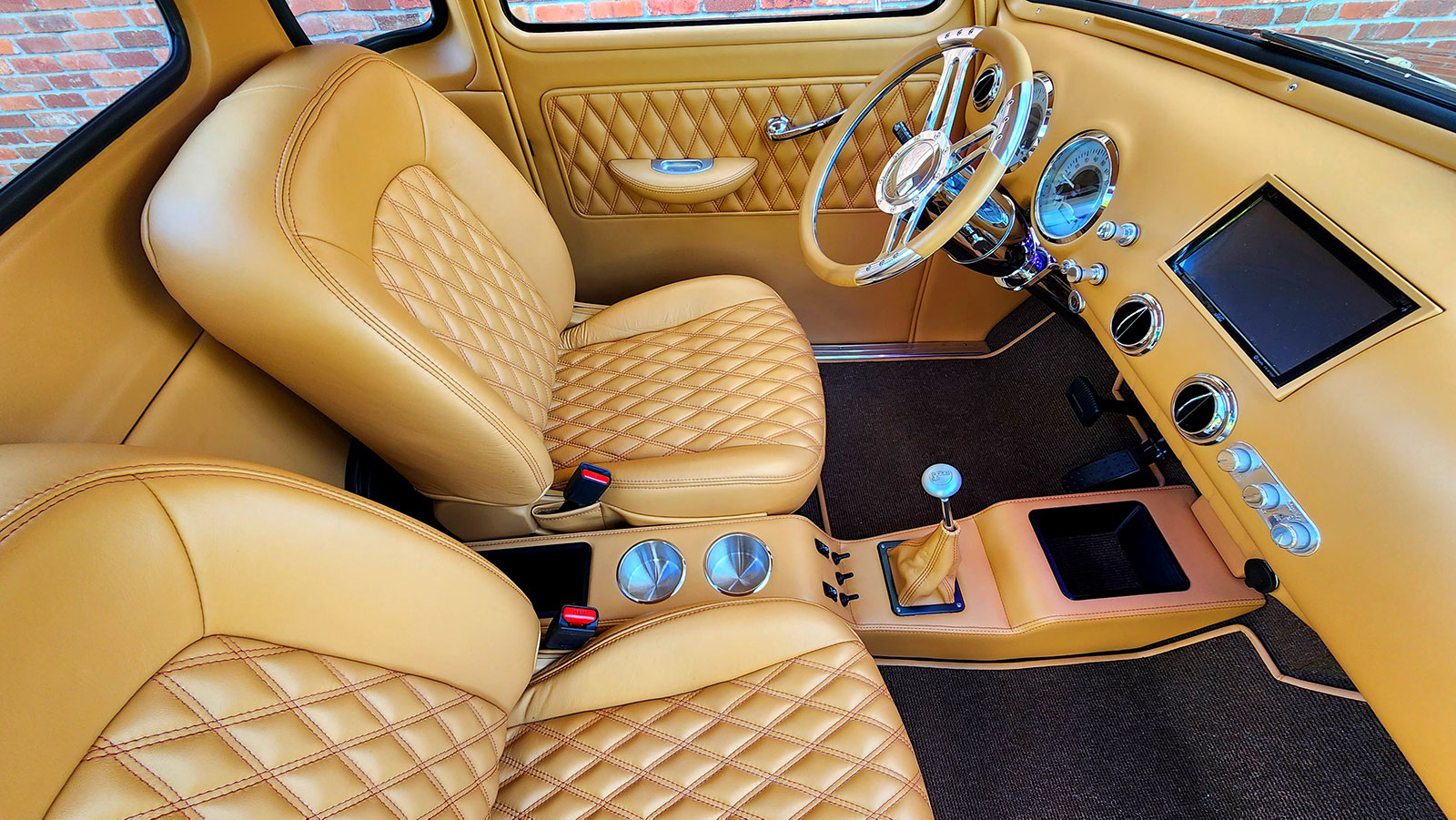 Tom was also instrumental in the design of the interior. He loves double-stitched diamond patterns and while he can’t sew he did the door panels and aspects of the interior. The foundation for the headliner is a piece of ABS vacuum formed but then trimmed to fit. He did all the final trimwork. Del Lyons, of The Upholstery Man shop in South Daytona, is responsible for the final stitchwork you see throughout.
