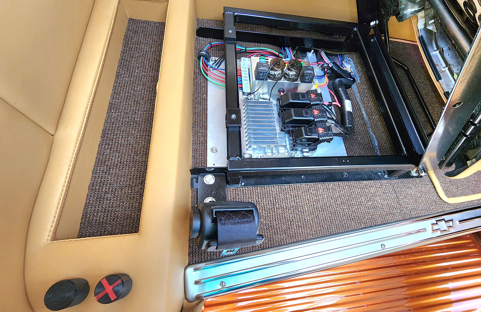 The bucket seats were from a wrecked ’18 Nissan placed on hinged seat risers that allow access underneath to the ECM and Ron Francis fuse panel. Tom cut the seats down some 3 inches to keep each of the seat backs below the rear window. He also built a custom center console that houses a Lokar floor shifter.