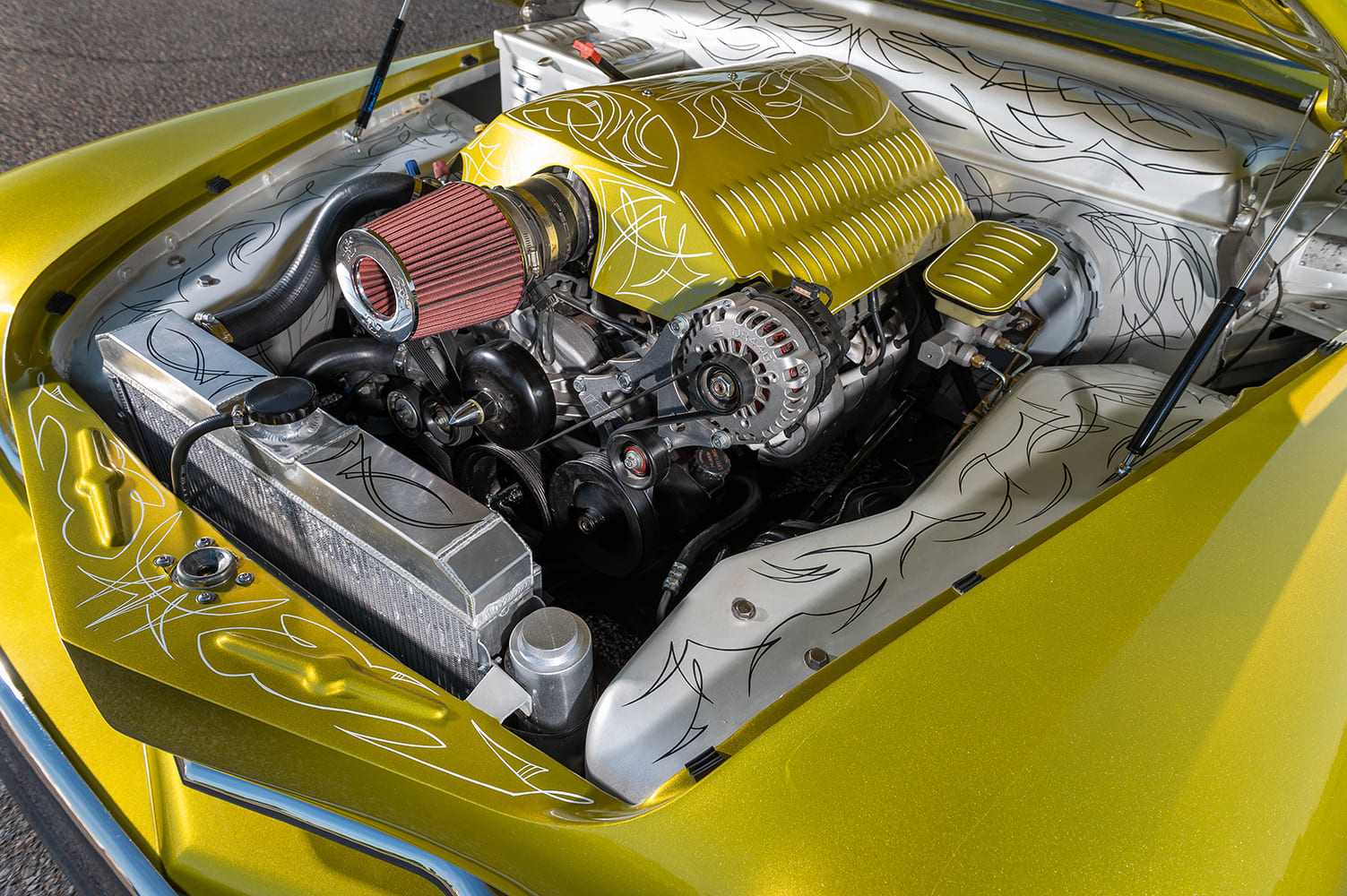 Beneath that stunning gold exterior lies a powertrain that no one expected but everyone respects. Butch installed a 5.3L LS V-8 from a 2003 Chevy truck, paired with a GM 4L60 transmission. That combination drives a reliable Chevy 10-bolt rearend, ensuring modern dependability for a classic silhouette.