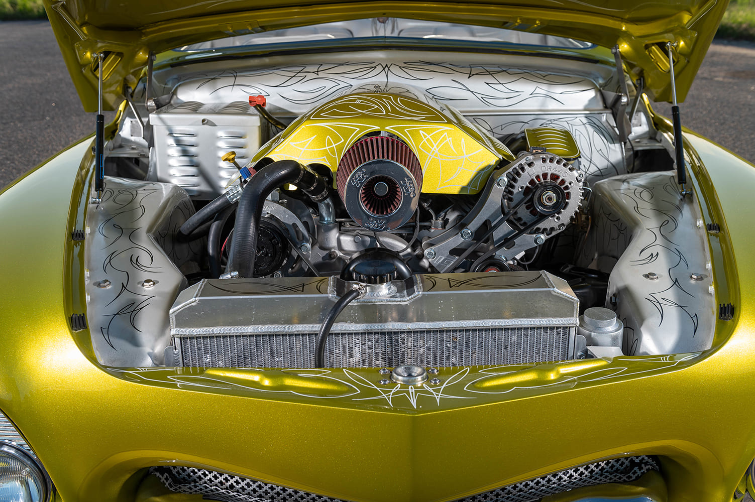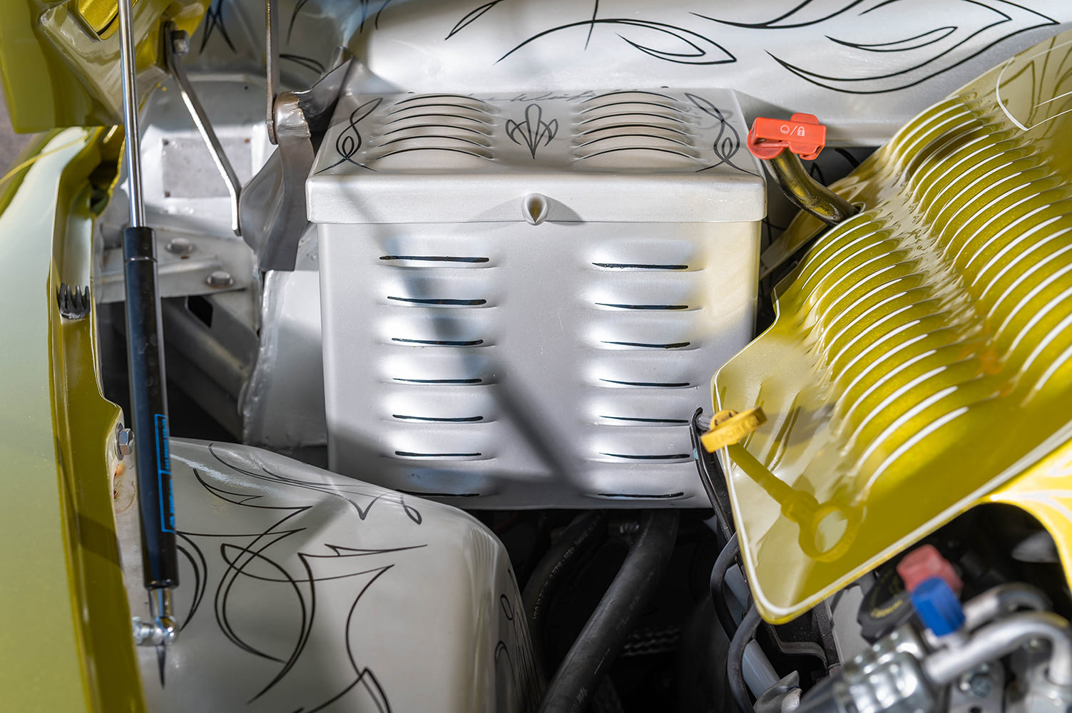 Charlie’s Plating masterfully did all chrome, while every piece of stainless trim was hand-built by Butch himself. Even the glass was custom handled by Bear Glass in Winfield, Kansas, with the wing windows deleted and all windows, doors, and trunk now operating electrically. The paint? A jaw-dropping custom Candy Line Gold, laid down flawlessly by Chris Carlson Hot Rods. Norma Jeane doesn’t just roll, she radiates.