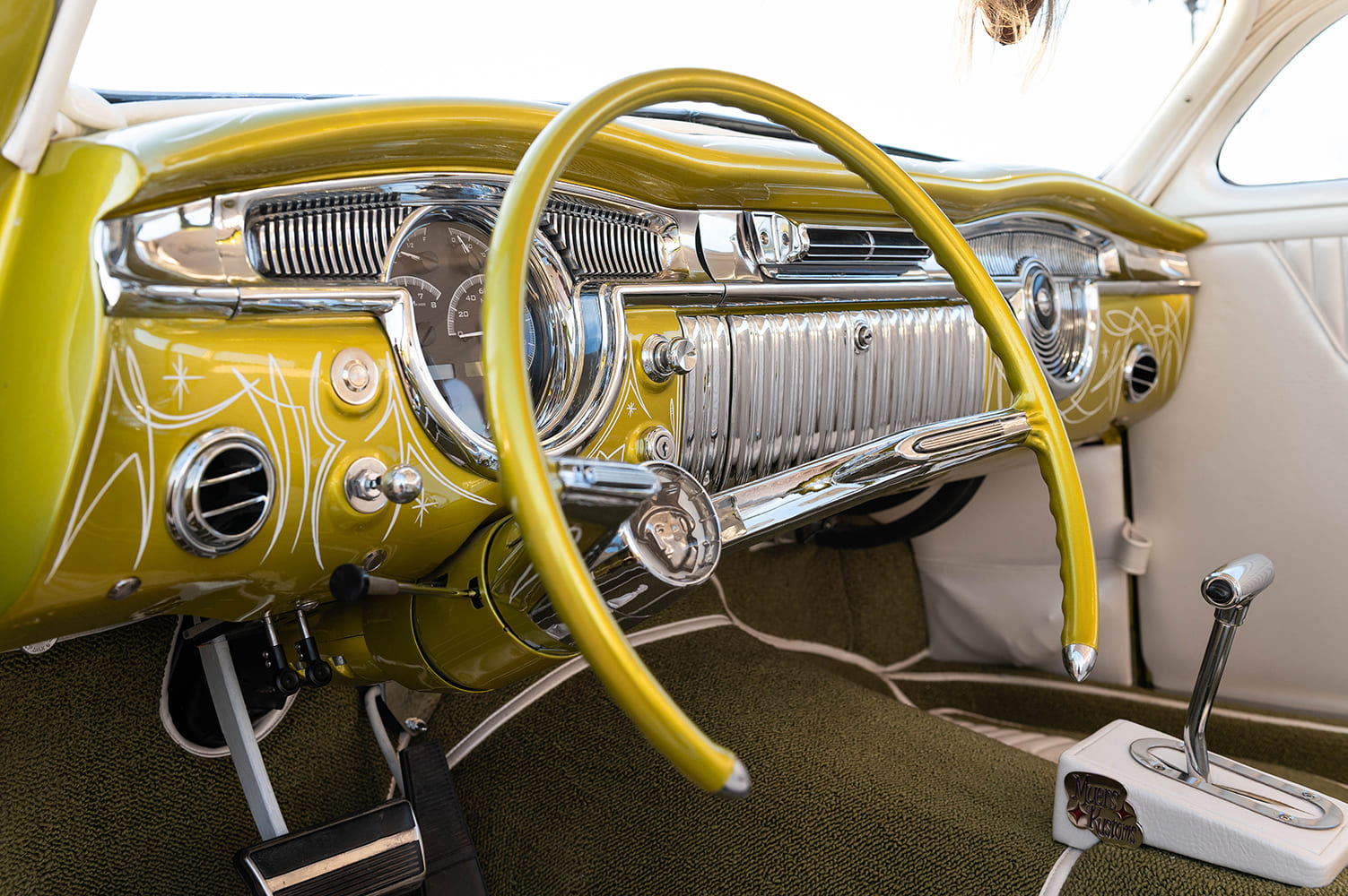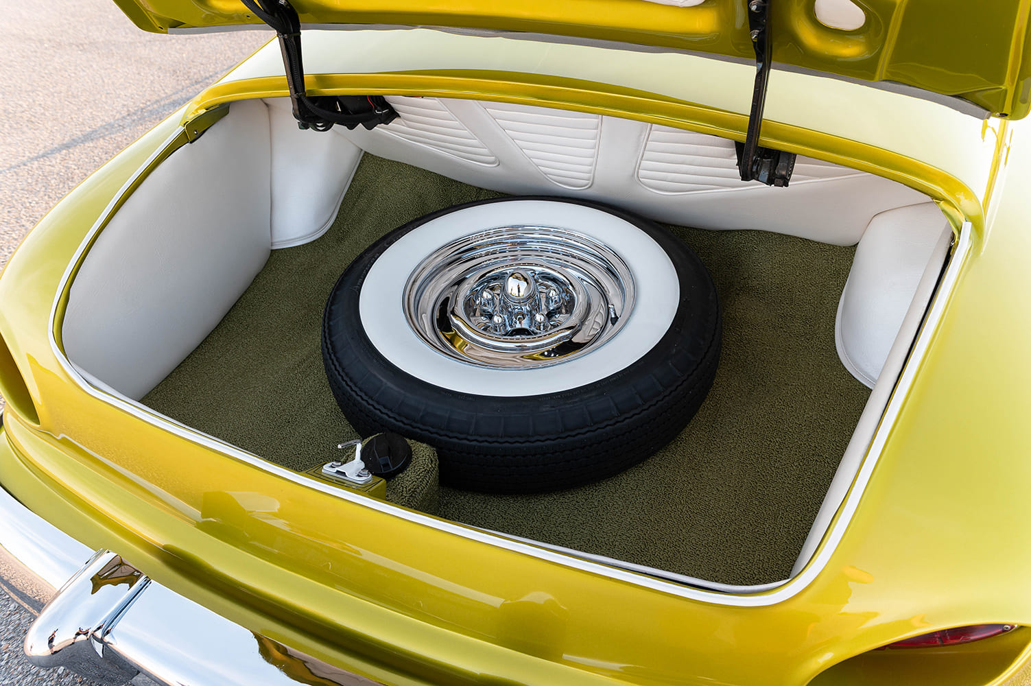 The rolling stock on Norma Jeane is pure class, featuring 15×6 Wheelsmith chrome reverse wheels with Spider Caps, wrapped in 15-inch Coker tires with 3-inch whitewalls.  It’s a combo that screams vintage cool while staying true to the car’s custom ethos.