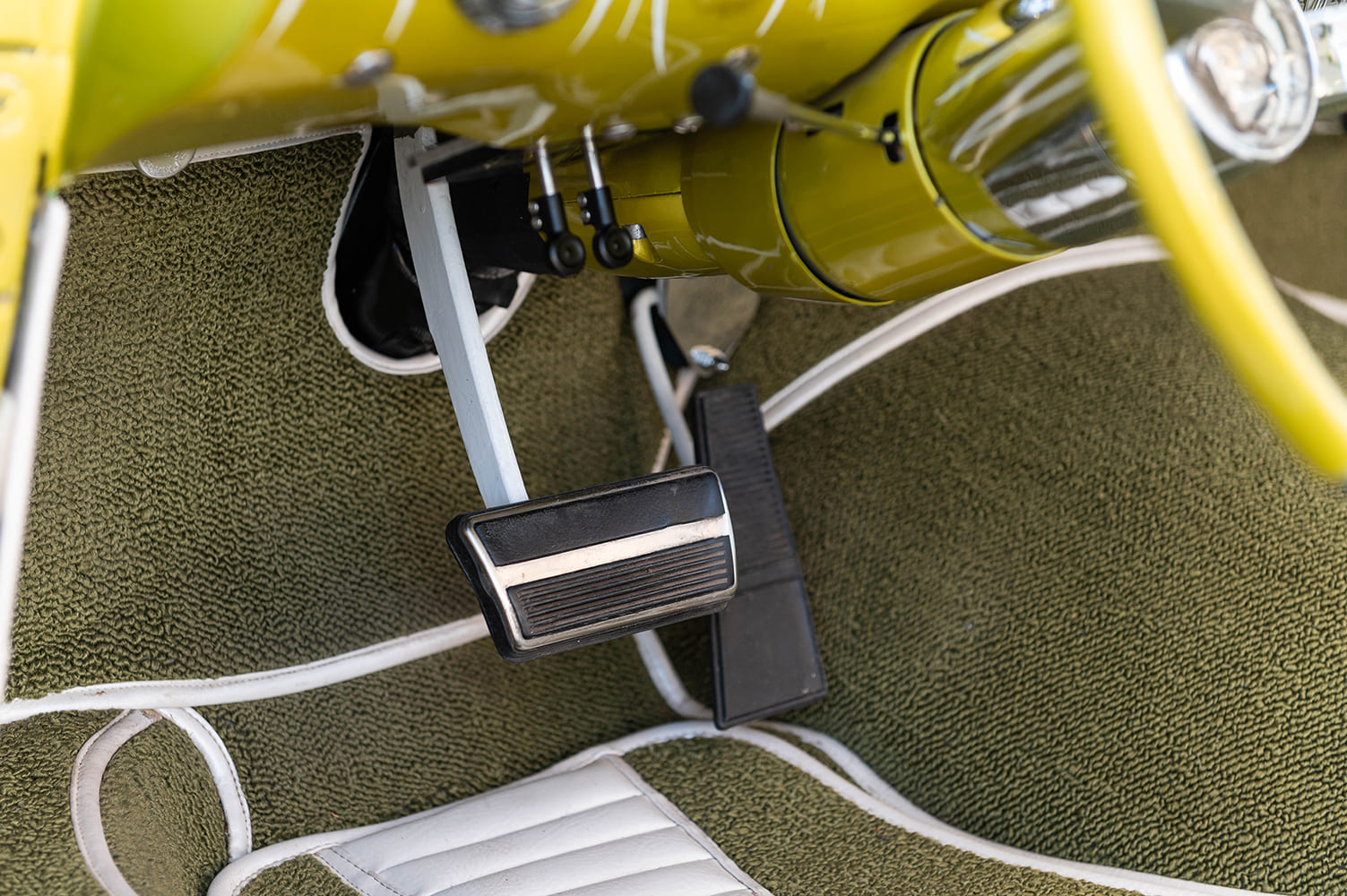 To get the stance just right, Butch used a frame from a 1979 Oldsmobile Delta 88, outfitted with a custom four-link air ride in the rear. The frontend retained the original Delta 88 suspension but got a height adjustment via drop spindles. Braking duties are handled by stock Oldsmobile disc brakes, which are simple, effective, and period-correct for the frame.