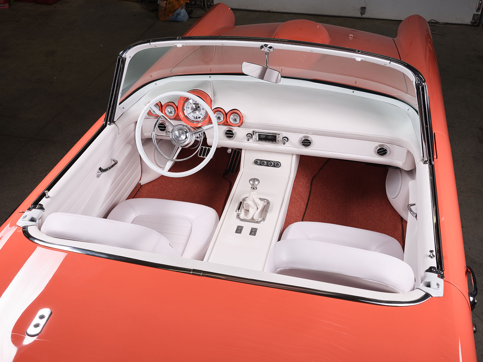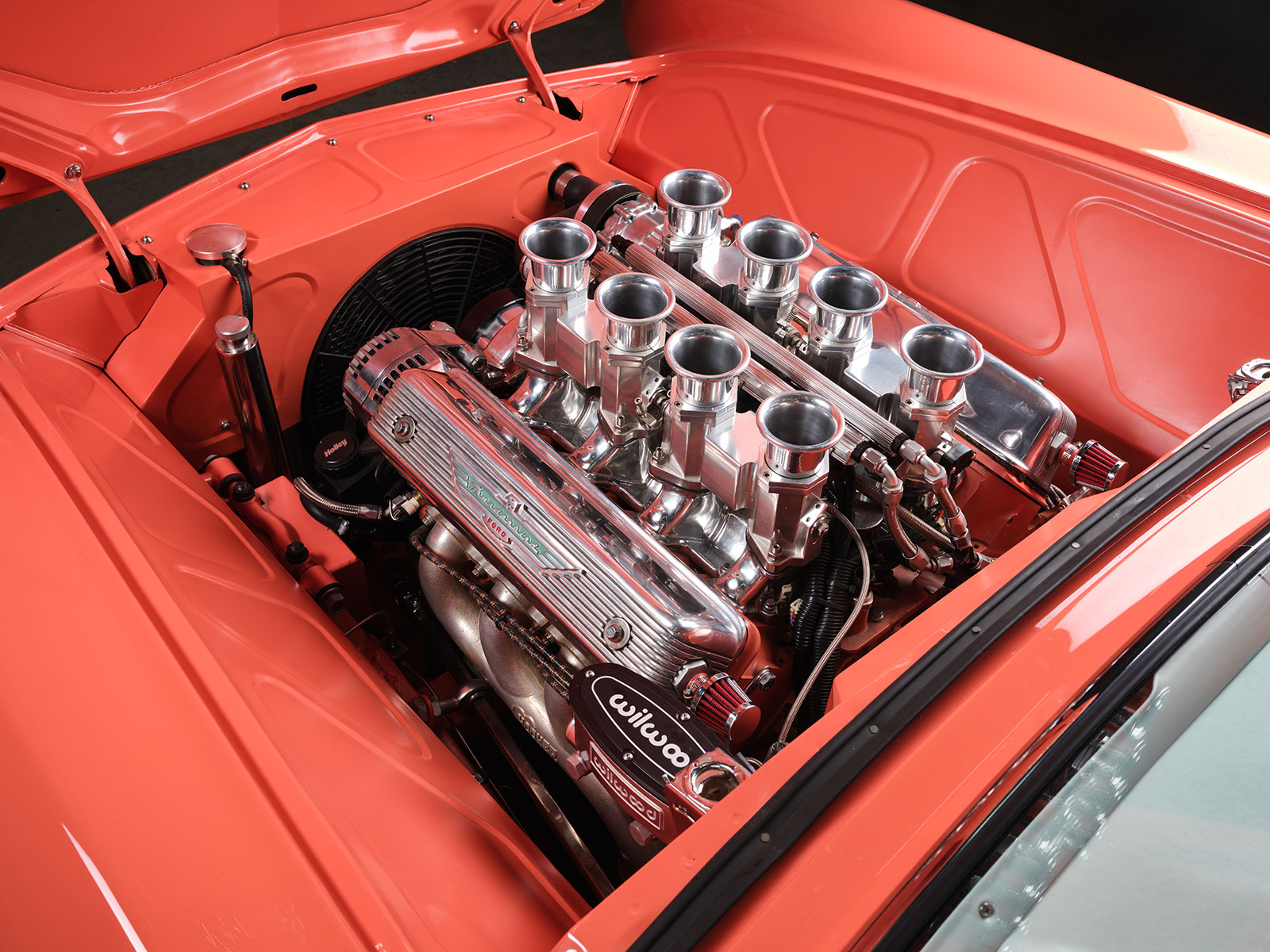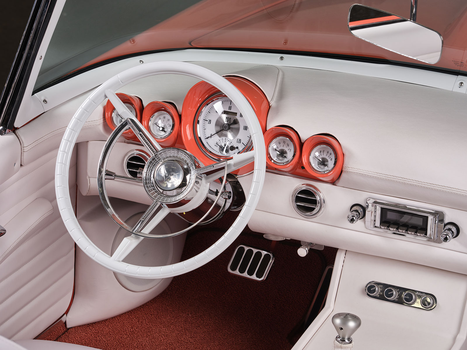Afterward, Dave passed the four colors by Rick, his wife, and daughter and then received the go-ahead to mix up the custom Glasurit Coral color. From here Brian Diveley managed the bodywork and the final spray of the chosen hue. For the most part the body is a stock 1955 Ford Thunderbird but there are a few alterations. For instance, Dave then removed the rear fender skirt and made a template of the front wheel opening and transferred its shape to the rear. The goal was to increase the opening to show off the rear 20×10 Raceline custom wheels. Additionally required in back were the mini-tubs that were added to provide the necessary room for the large wheel and tire combo with 295 Toyo Proxes rears with 235s in front. The centerline of the front axle was correspondingly moved forward slightly to give the Thunderbird a longer appearance. The wheels were patterned after the factory hubcap look but are in a two-piece aluminum wheel. The factory side vents are from an ’02 Thunderbird that rest inside custom bezels that Dave crafted to give a more sleek side appearance. More of Dave’s handiwork comes in the form of the grille and hood scoop. The hood scoop was raised about 1-1/4 inches and stretched to clear the Imagine Injection eight-stack EFI. More sheetmetal and trim touches include the front and rear bumpers that were flipped, narrowed, and smoothed. The stock headlight bezels were set aside and Dave made custom bezels with filled seems that are more compact than the factory ones. Likewise note that the factory running/turn signal lights were moreover removed. The factory gas filler door was smoothed over and then relocated behind the license plate. More subtle touches include the factory tail light lens set aside and custom bezels that allow for flush lenses with a chrome trim ring.