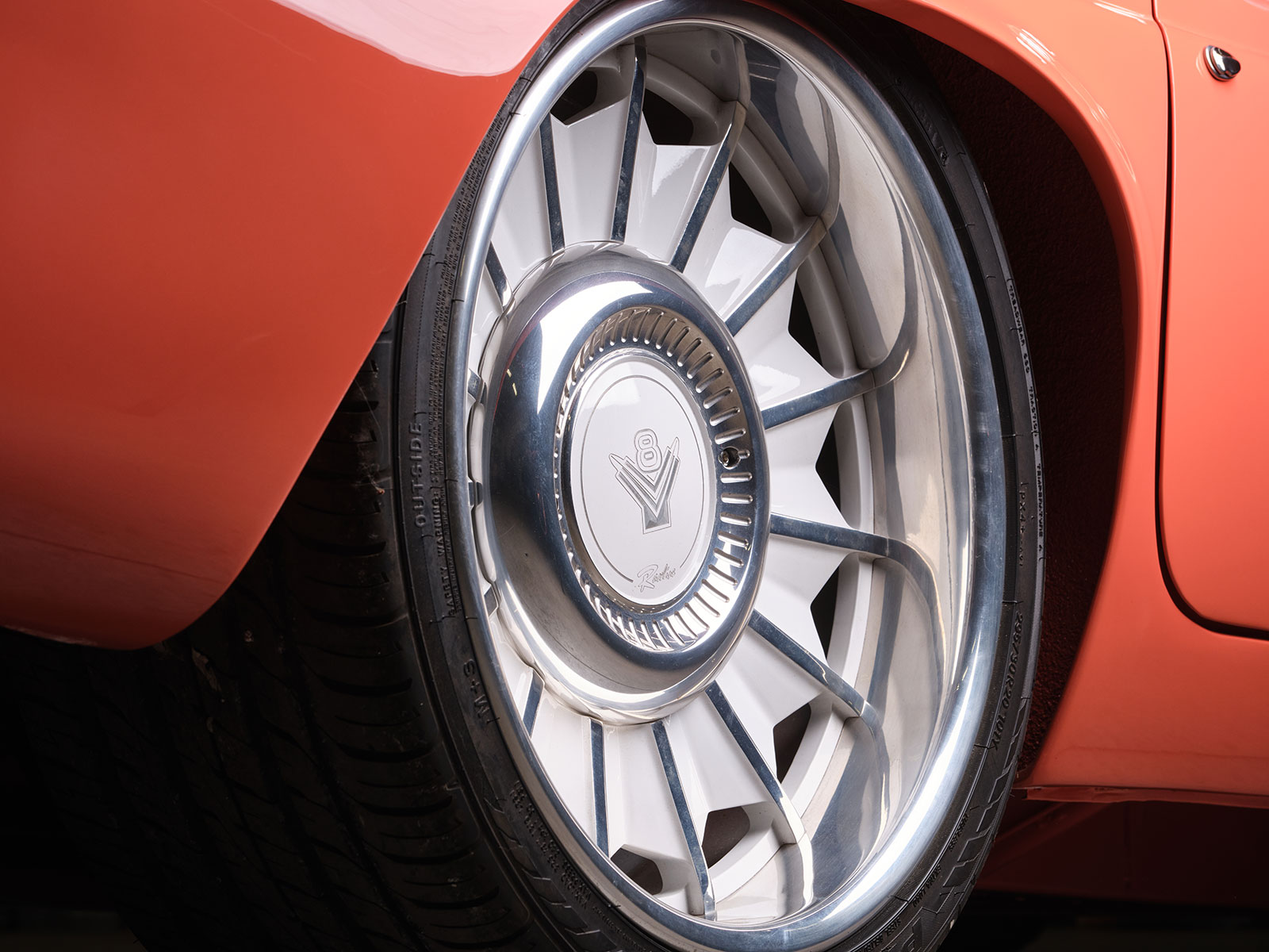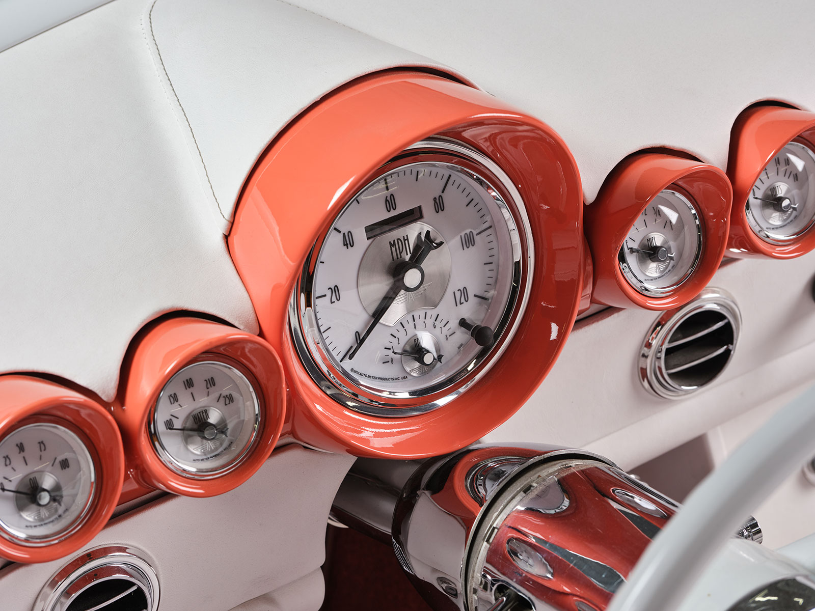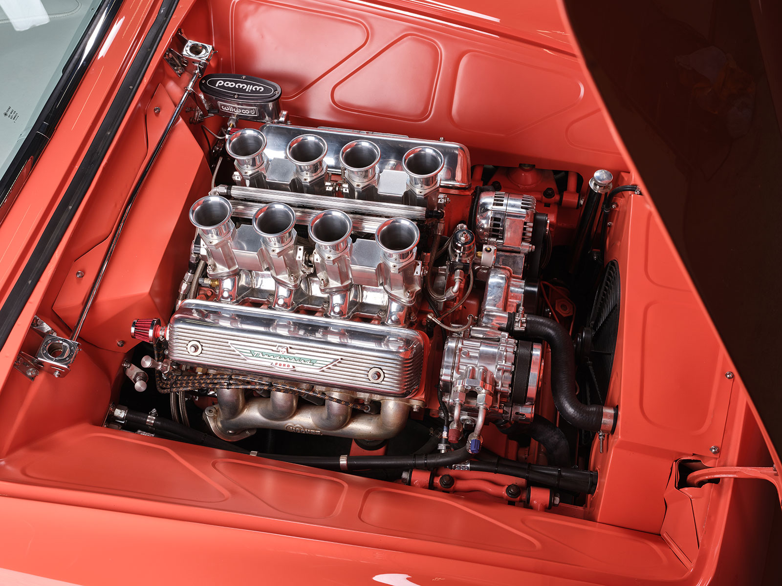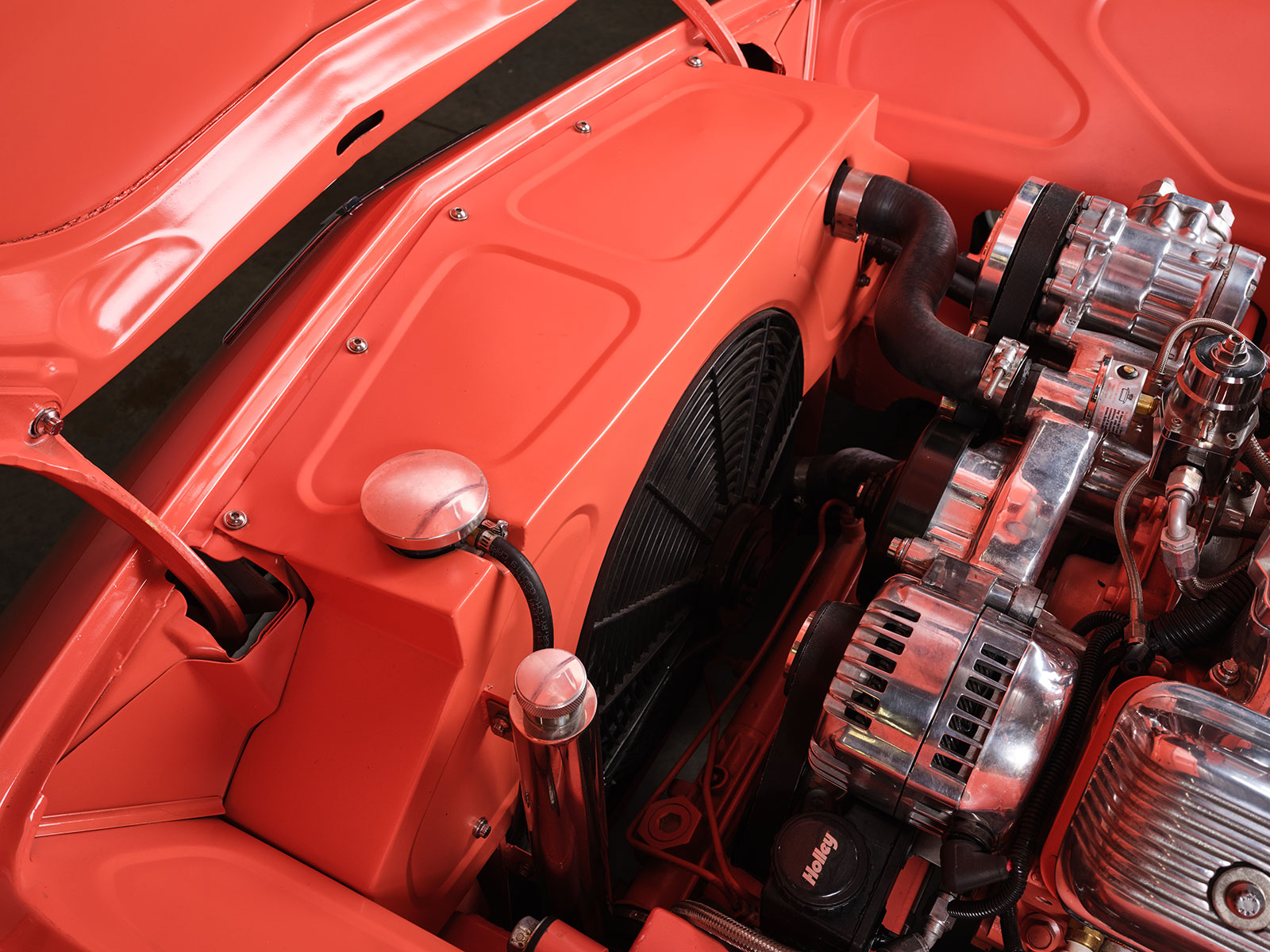 Afterward, Dave passed the four colors by Rick, his wife, and daughter and then received the go-ahead to mix up the custom Glasurit Coral color. From here Brian Diveley managed the bodywork and the final spray of the chosen hue. For the most part the body is a stock 1955 Ford Thunderbird but there are a few alterations. For instance, Dave then removed the rear fender skirt and made a template of the front wheel opening and transferred its shape to the rear. The goal was to increase the opening to show off the rear 20×10 Raceline custom wheels. Additionally required in back were the mini-tubs that were added to provide the necessary room for the large wheel and tire combo with 295 Toyo Proxes rears with 235s in front. The centerline of the front axle was correspondingly moved forward slightly to give the Thunderbird a longer appearance. The wheels were patterned after the factory hubcap look but are in a two-piece aluminum wheel. The factory side vents are from an ’02 Thunderbird that rest inside custom bezels that Dave crafted to give a more sleek side appearance. More of Dave’s handiwork comes in the form of the grille and hood scoop. The hood scoop was raised about 1-1/4 inches and stretched to clear the Imagine Injection eight-stack EFI. More sheetmetal and trim touches include the front and rear bumpers that were flipped, narrowed, and smoothed. The stock headlight bezels were set aside and Dave made custom bezels with filled seems that are more compact than the factory ones. Likewise note that the factory running/turn signal lights were moreover removed. The factory gas filler door was smoothed over and then relocated behind the license plate. More subtle touches include the factory tail light lens set aside and custom bezels that allow for flush lenses with a chrome trim ring.