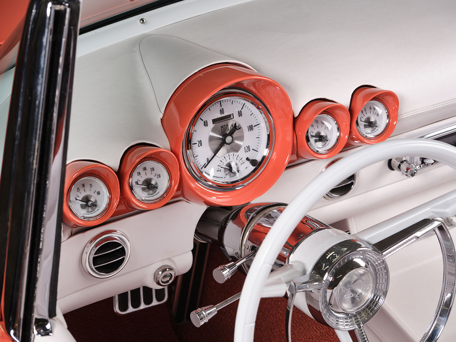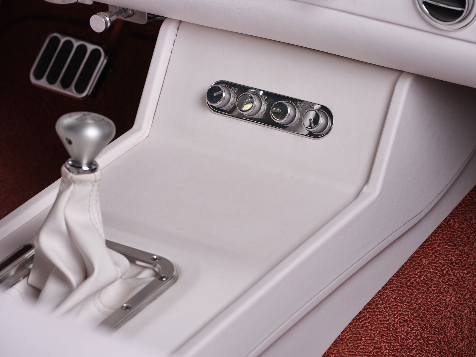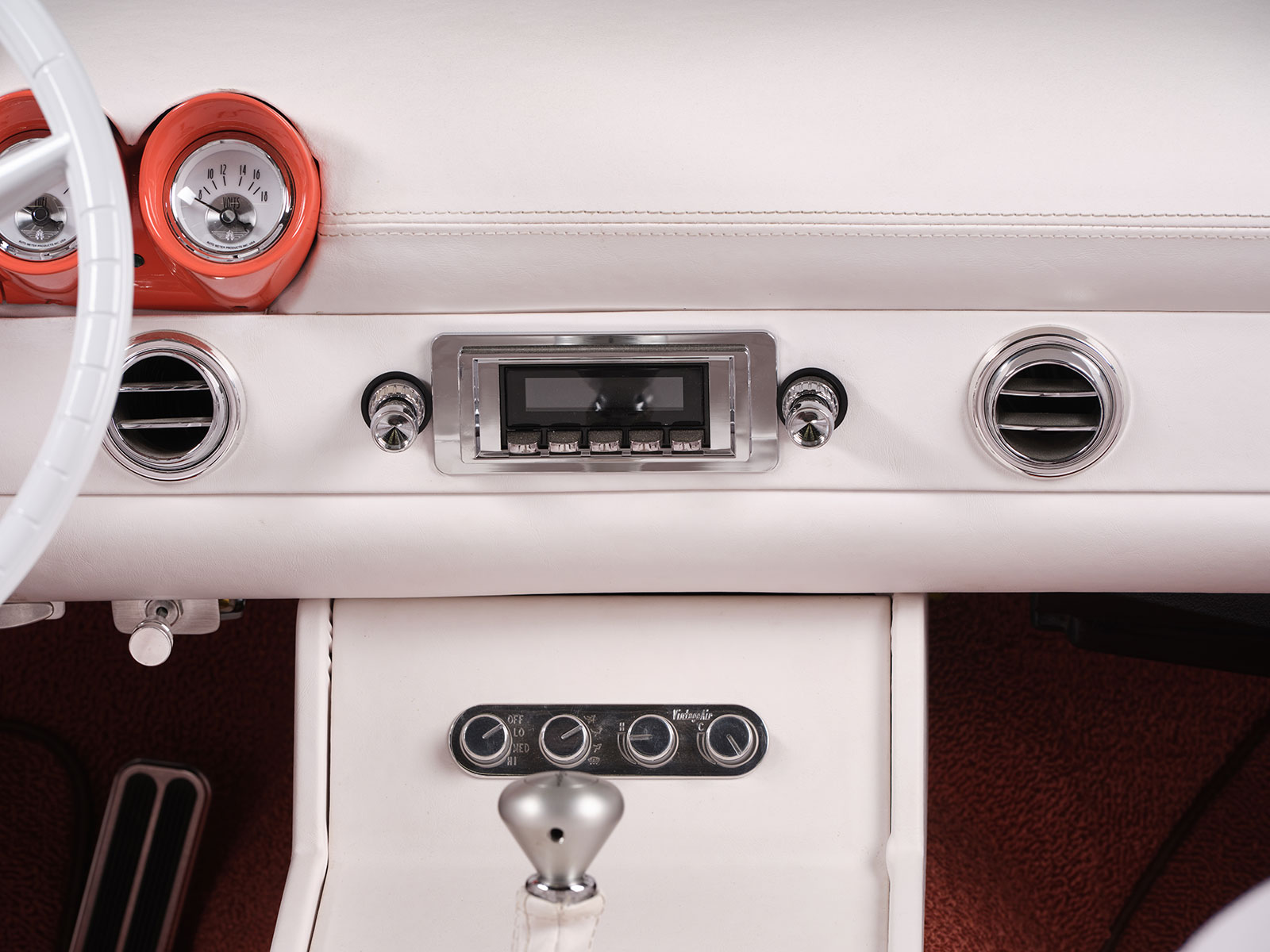 Inside the bold choice of a white interior stands out but one should look closely and you will see a ’60 Chevy Impala gauge panel filled with AutoMeter gauges. The dash is additionally a combination of paint and custom upholstery work by Auto Additions. They similarly handled the stitching over the Mustang bucket seats and the white carpeting. More interior appointments include the chrome Classic Performance Products steering column with a smaller-diameter version of the original factory Thunderbird steering wheel. More accessories include the Vintage Air AC system with its control panel located within the custom center console. Likewise, the console houses the automatic Lokar shifter with Lokar billet shift boot ring and integral vertical gear selector indicator. Power window actuators are correspondingly mounted into the center console. Bringing all the electrics together is an American Autowire system neatly positioned by Dave.