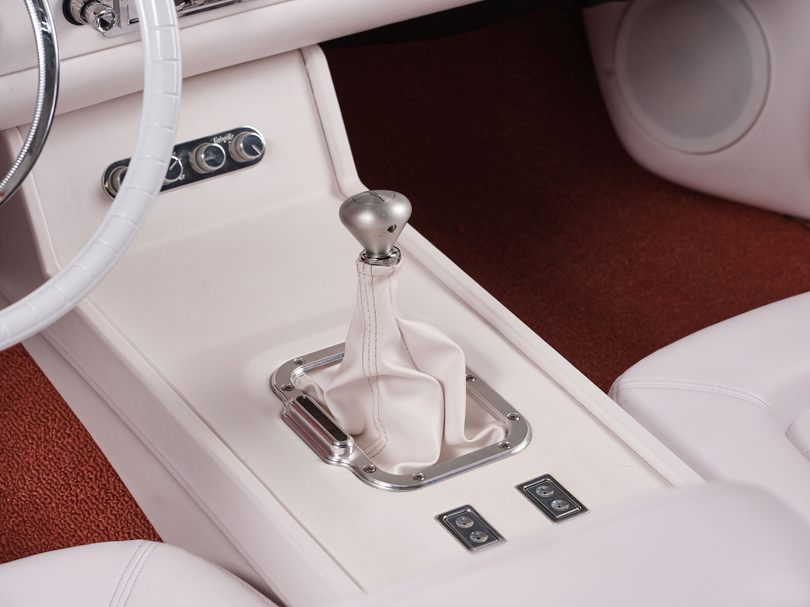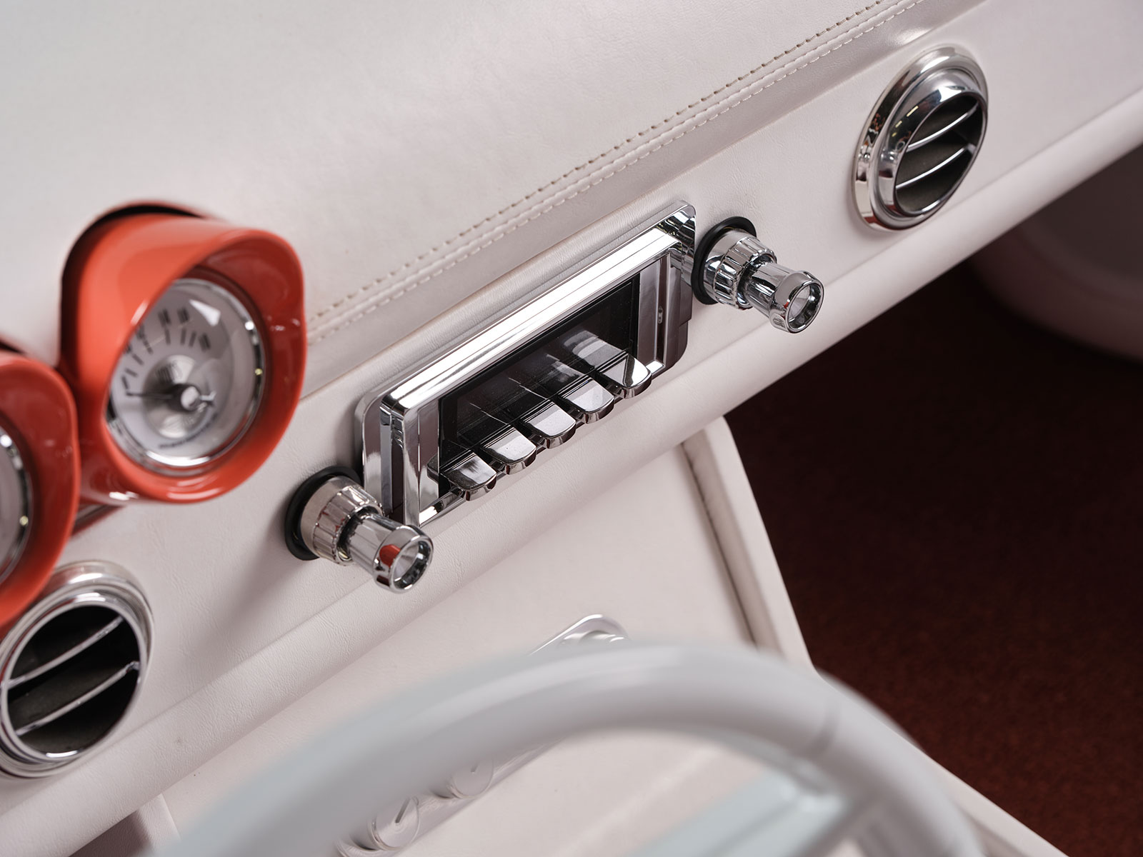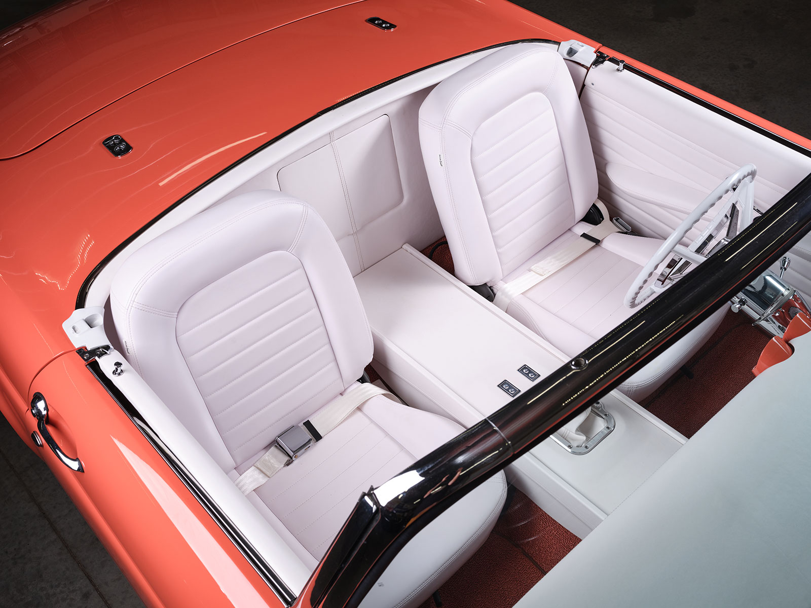 Inside the bold choice of a white interior stands out but one should look closely and you will see a ’60 Chevy Impala gauge panel filled with AutoMeter gauges. The dash is additionally a combination of paint and custom upholstery work by Auto Additions. They similarly handled the stitching over the Mustang bucket seats and the white carpeting. More interior appointments include the chrome Classic Performance Products steering column with a smaller-diameter version of the original factory Thunderbird steering wheel. More accessories include the Vintage Air AC system with its control panel located within the custom center console. Likewise, the console houses the automatic Lokar shifter with Lokar billet shift boot ring and integral vertical gear selector indicator. Power window actuators are correspondingly mounted into the center console. Bringing all the electrics together is an American Autowire system neatly positioned by Dave.