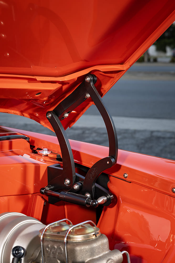 Next, the crew at Jay’s moved onto dropping in a GM Connect & Cruise package consisting of a 2010 Chevy LS3 engine and 6L90E transmission. The newer powerplant was modestly upgraded, but the goal was to give Craig the peace of mind of knowing that car would start right up any time he wanted to drive it. Long-distance trips would never be an issue again. Simply installing a new engine just wouldn’t do. Instead, the entire engine bay was bodyworked, prepped for paint, and dressed up with fresh hardware in the way of a Holley accessory drive system, and Eddie Motorsports hood hinges help make a lasting first impression.