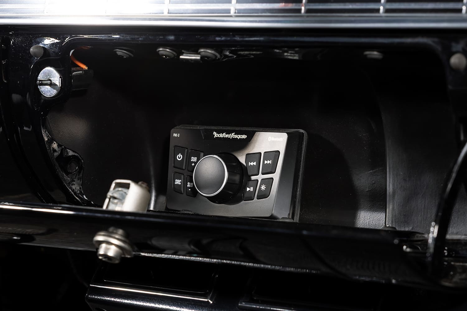 Stereo: JL Audio with hidden Rockford Fosgate controller in glovebox