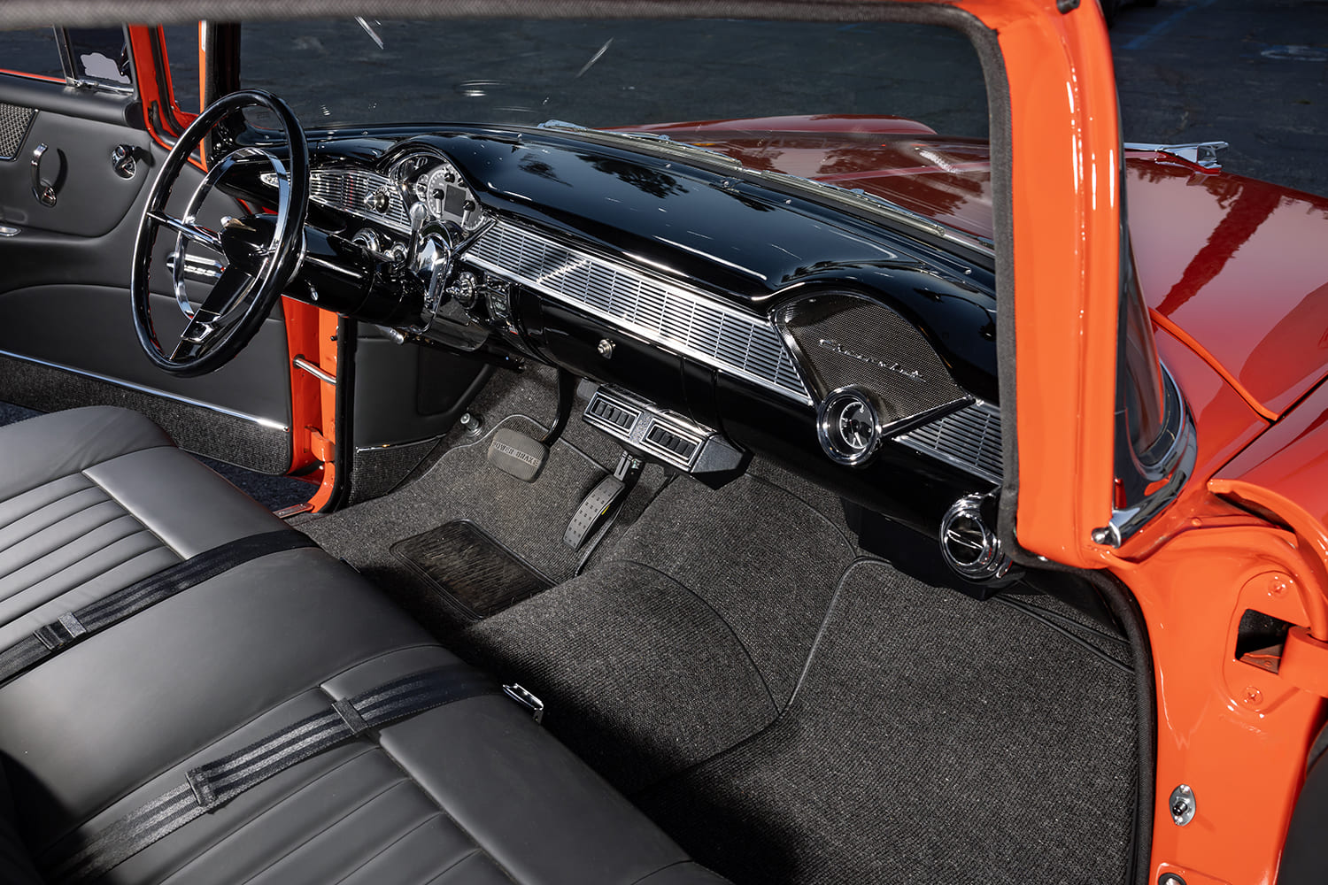 Speaking of lasting impressions, Craig wanted to boldly style the exterior of his Chevy. To do that, he selected PPG Matador Red paint—a memorable hue, for sure—as well as fresh chrome plating handled by Ontario Polishing. Inside the confines of the cabin, the factory seats, along with the custom door panels, were reshaped, expertly detailed, and wrapped in black leather by Elegance Auto Interiors. The repainted dash was stuffed with Dakota Digital gauges, a Vintage Air climate-control system, and a full sound system featuring Rockford Fosgate and JL Audio components wired up by Hector Castro at Jay’s Place. These additions would make for much more enjoyable cruise sessions.