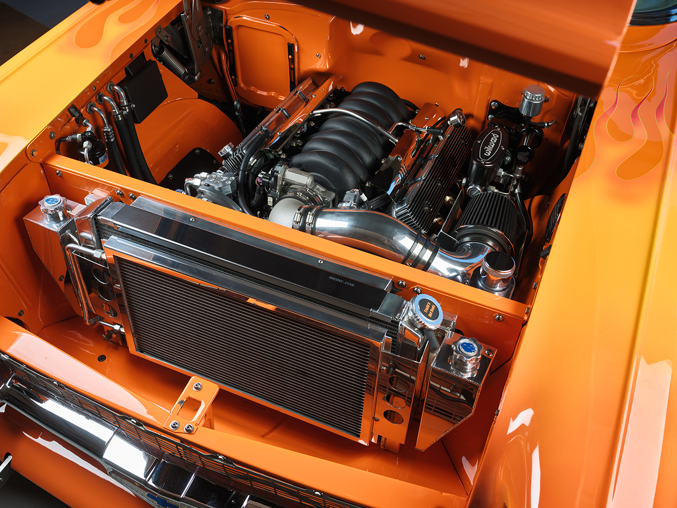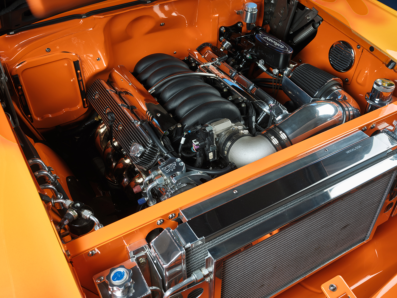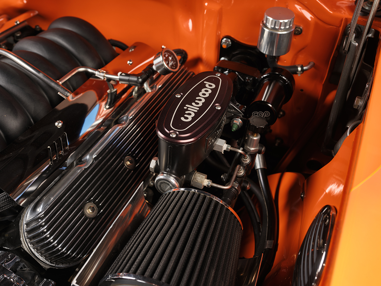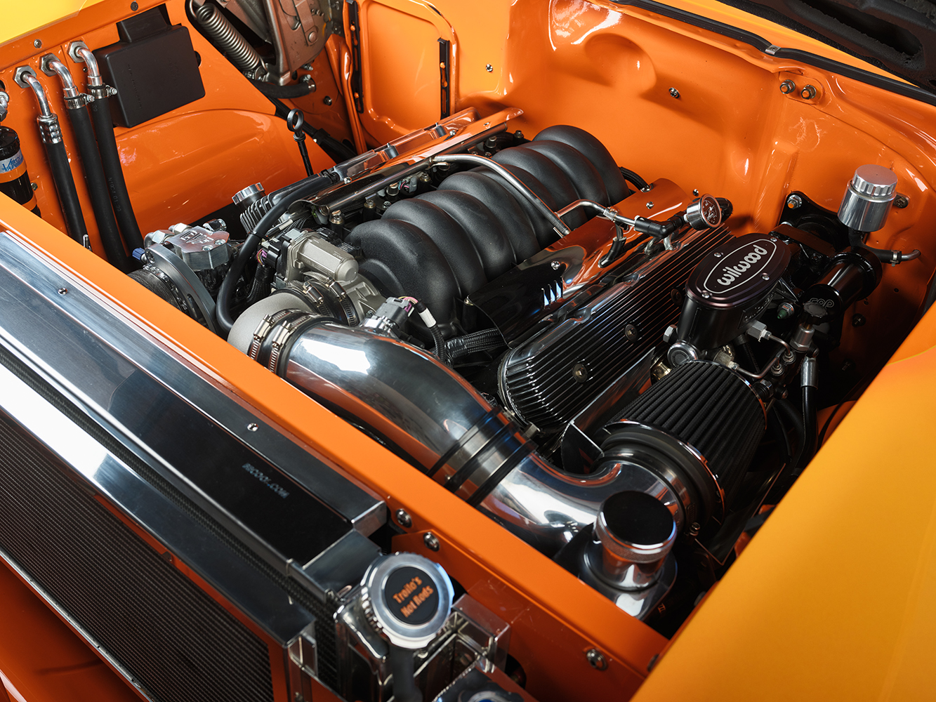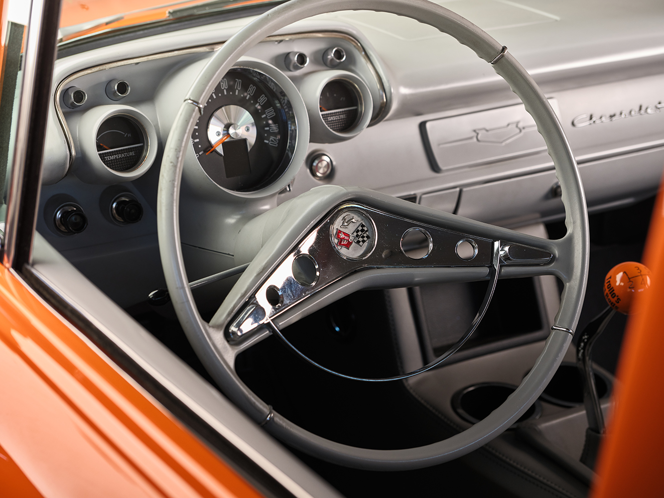 The front suspension comprises independent tubular upper and lower control arms, 2-inch dropped spindles, a hefty sway bar, and a Mustang power rack-and-pinion steering box hooked to the original Chevy column. In the back, contemporary Viking coilover shocks and a meaty sway bar anchor the rear axle. The born-again Chevy 150 stops as well as it goes, with Wilwood ventilated disc brakes in each corner and a CPP Hydra Stop hydraulic assist system. Those handsome alloy wheels are Rocket Racing Booster 18×7 in front and 20×8.5 in back, shod with beefy Uniroyal Tiger Paw 215/50R18s and 245/45R20s.