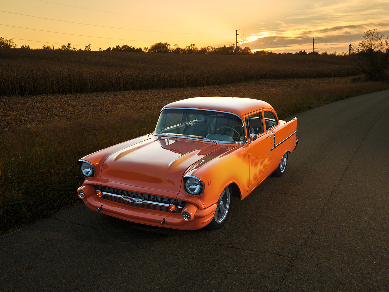 As a junior in high school, Jason was riding his BMX bike when he saw this 1957 Chevy under a carport. He told his dad about it. “We literally got up from dinner, drove over, and bought the car. It turned quickly from looking at it to, let’s go knock on the door and see if they will sell it.” The derelict Chevy had three wheels and no floor, but all the parts and pieces were there. For two years, he drove it to high school. Jason saw Scott Sullivan’s “Cheese Whiz” 1955 Chevy at the NSRA Nationals in Louisville that summer. “We came home and painted the car PPG single-stage orange.”