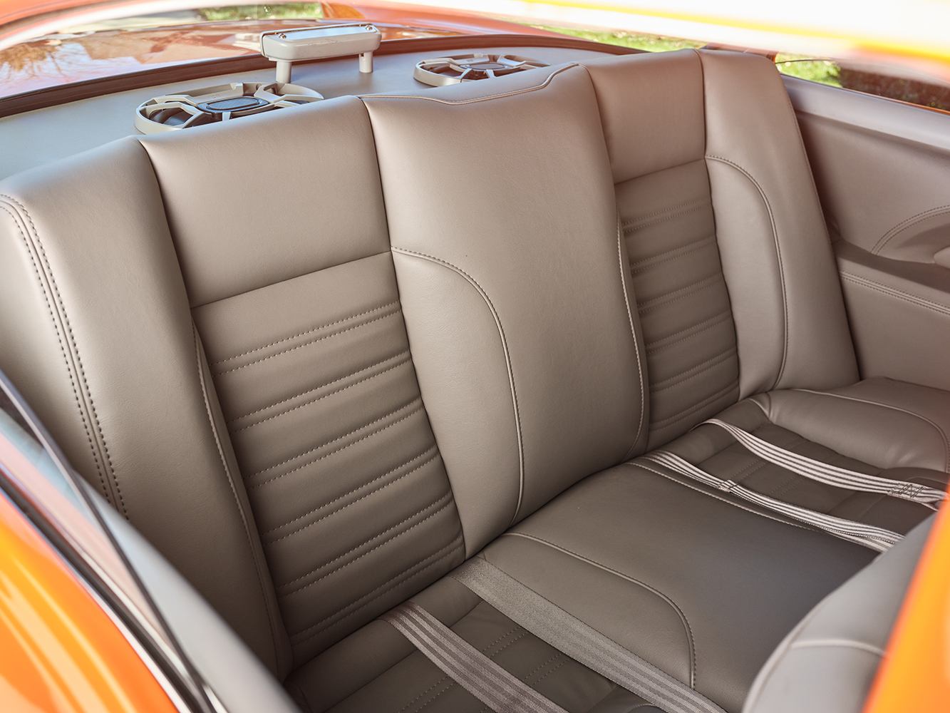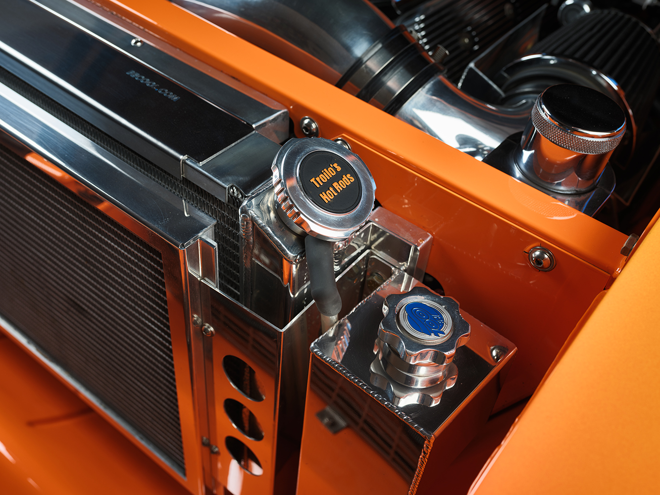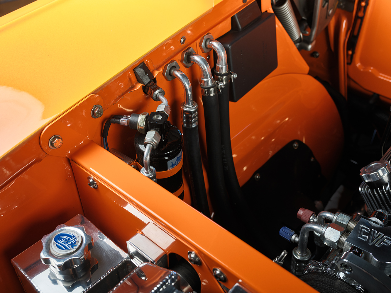 The new platform is a state-of-the-art, JW Rod Garage, mandrel bent, 2×4 tube frame chassis, “… so the car would be much more driveable.” Underhood is a 535-bhp BluePrint Engines crate motor, a 376-cid, LS3 aluminum block V-8 with DBW throttle body fuel injection, a K&N air filter, a hydraulic roller cam, and finned Holley vintage valve covers. It was dyno’d at 420 bhp at the rear wheels. The oversized exhaust system, built by Quality Enterprises, consists of Tru-Ram headers and MagnaFlow mufflers. The driveline is a TREMEC TKX, five-speed manual, a Mcleod Street Pro Twin Disc clutch and pressure plate, an Inland Empire driveshaft, and a sturdy Currie Ford 9-inch 3.70:1 rear with positraction.