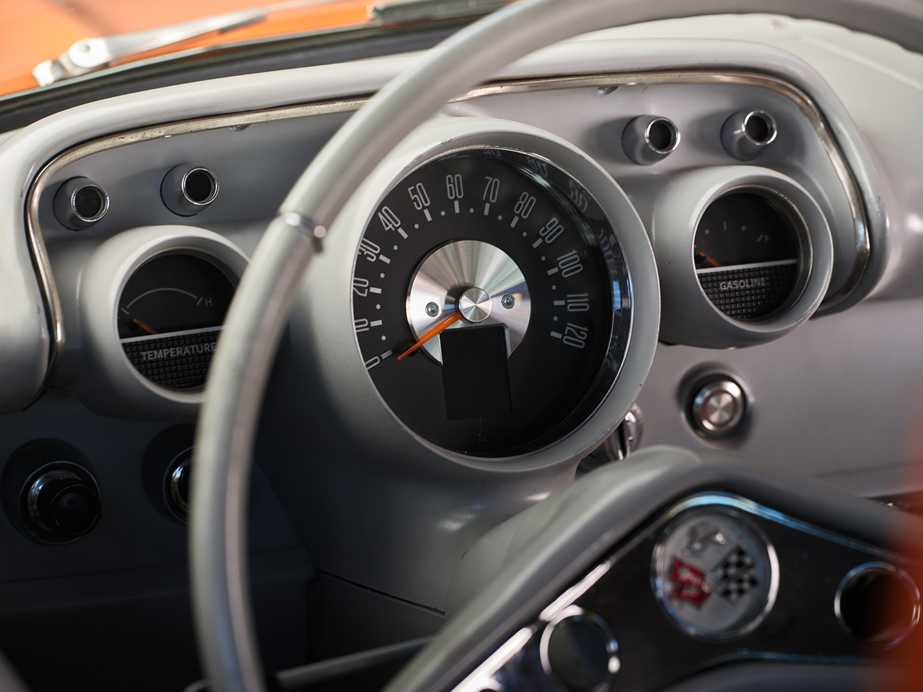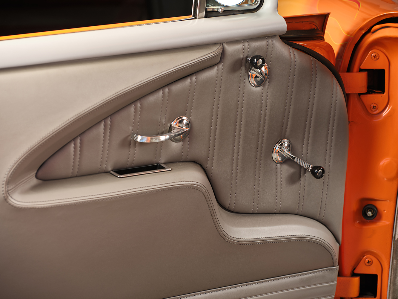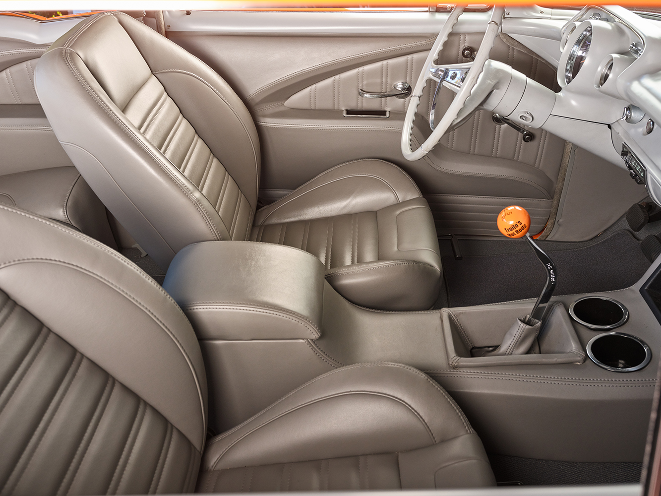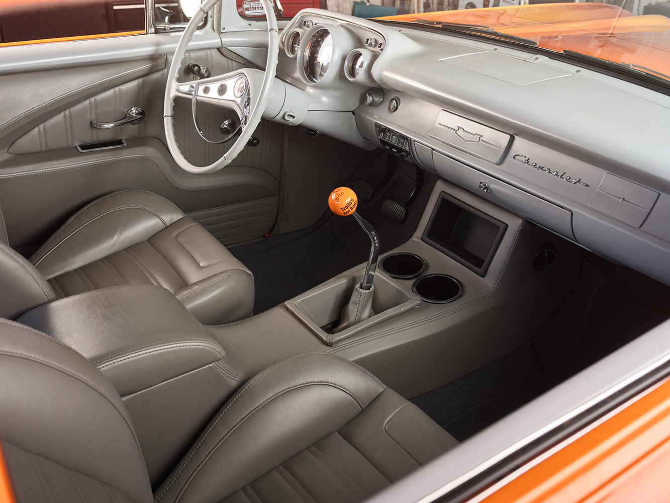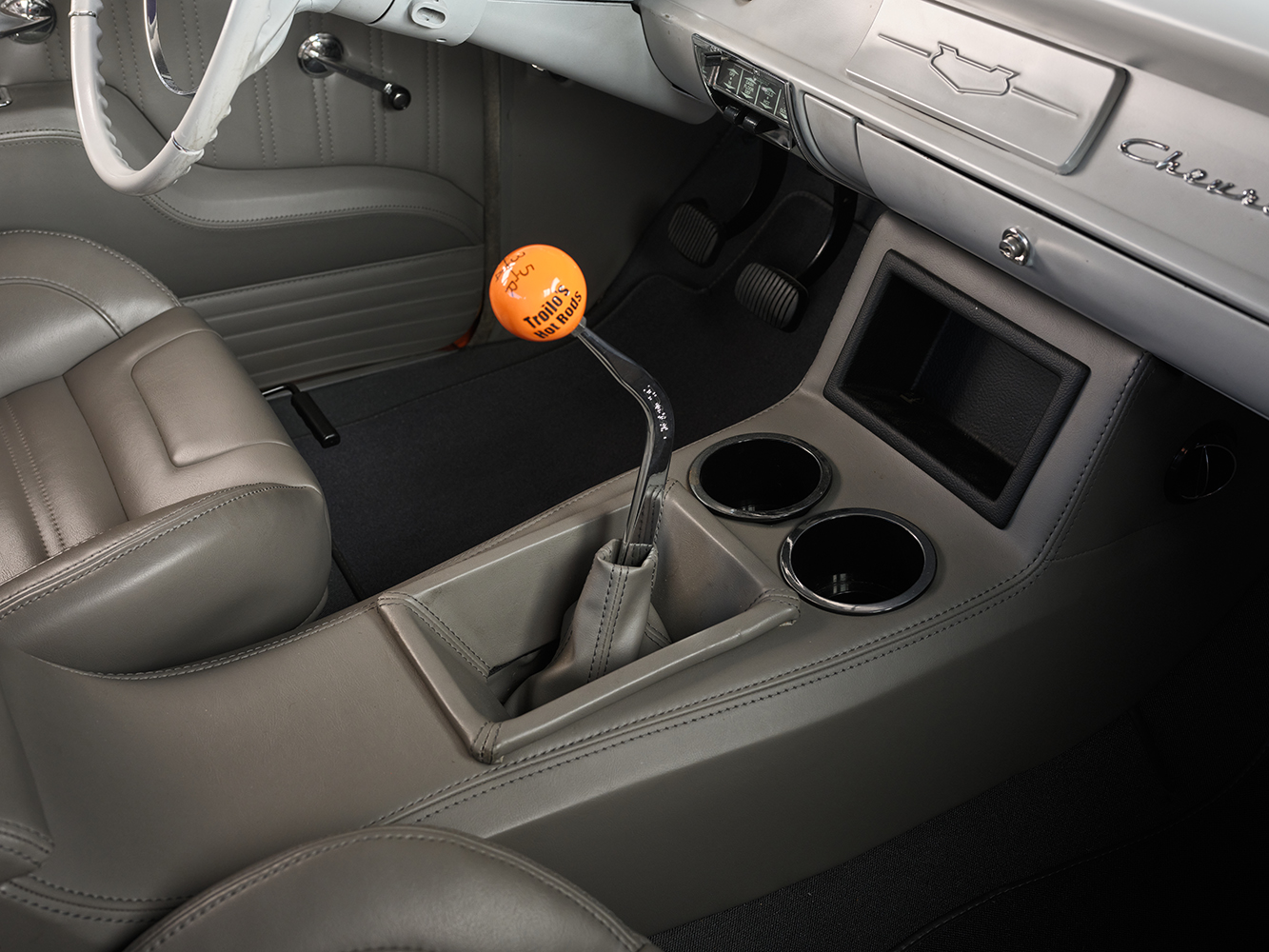 Inside, there’s an entire TMI interior with gray leather and vinyl, Daytona gray carpeting, Juliano’s shoulder and lap belts, and a 1959 Chevy Impala steering wheel. Dakota Digital sourced the RTX instrumentation, Ron Francis supplied the wiring, and the dashboard is a stock 1957 Chevy with a factory 150 clock and radio block-off plate.