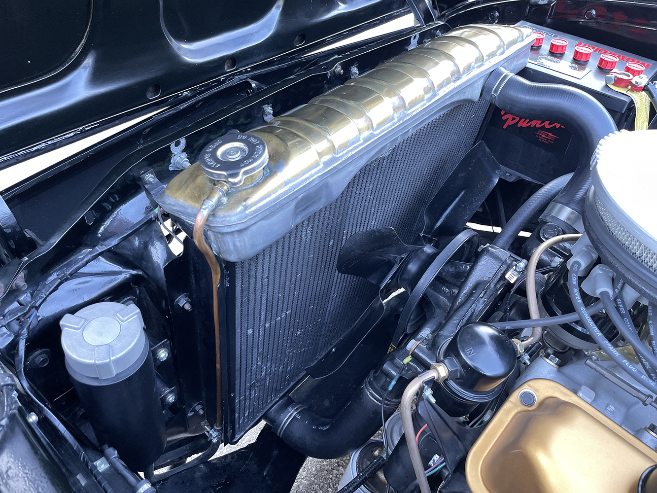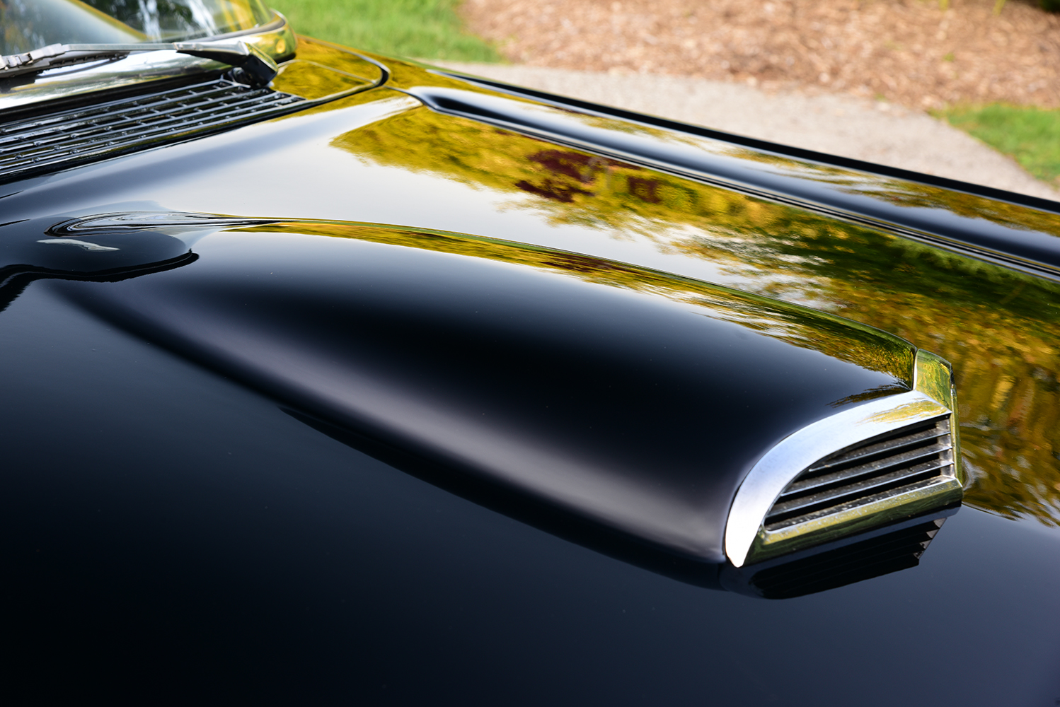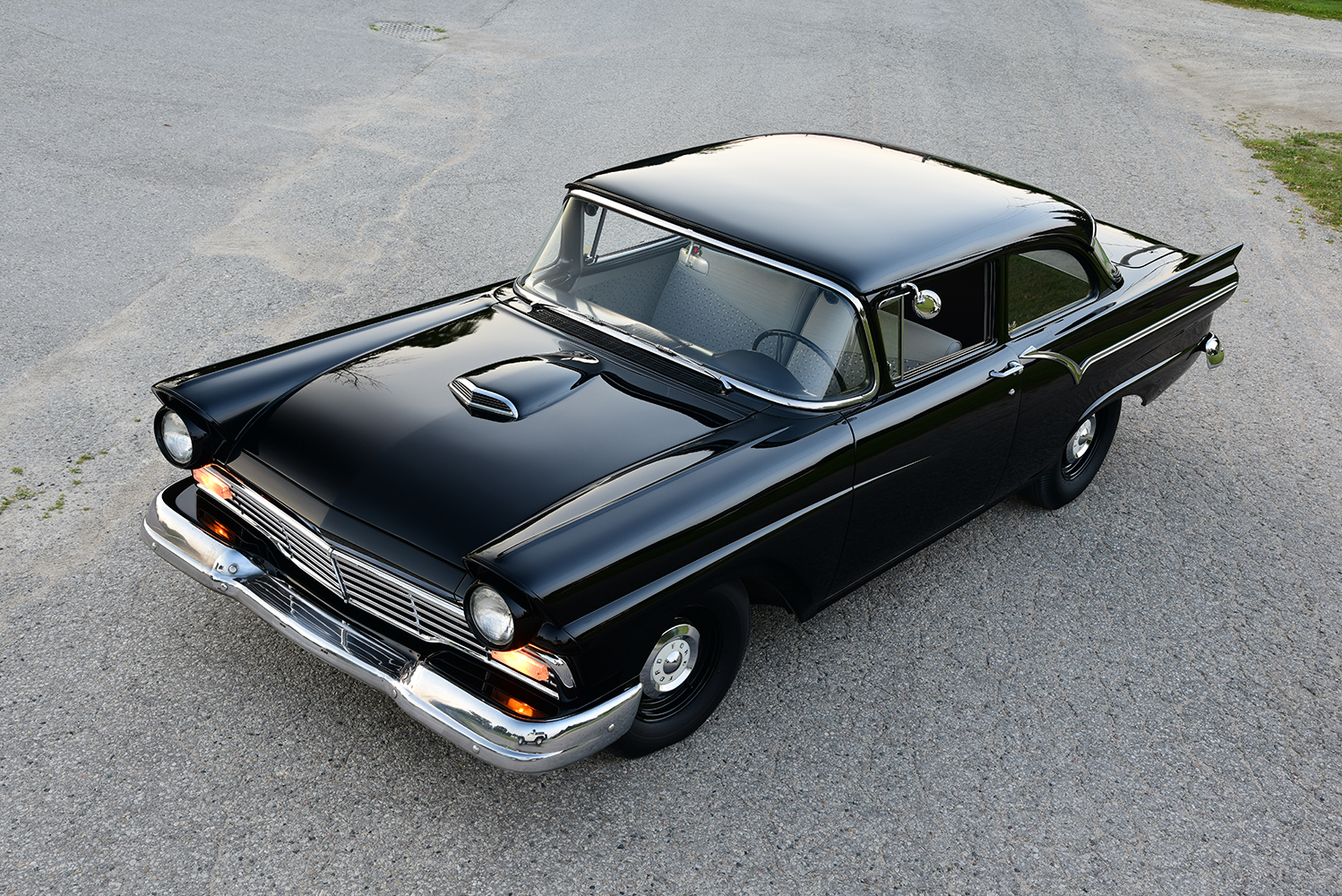 Originally built at Ford’s production facility in Dallas, the years of abuse took its toll on the vintage steel, making it obvious that it was time for an entire strip down to determine where attention was needed to bring it back to life. Purcell identified all the weak points and started the rebirth with freshly struck panels from EMS Automotive, including lower quarter-panels, lower fenders and doors, inner and outer rockers, and fabricating custom dogleg replacement panels. Wanting to give the car a signature look, Jeff had Purcell add a fully functional 1957 Ford Thunderbird air scoop to complete the transformation. To bring it to the next level, club member Tom Bedo and his team at Bodymotive Services in Arthur, Ontario, Canada, completely metal-finished the body while setting all the gaps to perfection. Bedo then laid down the dramatic coating of PPG Midnight Black vibe.