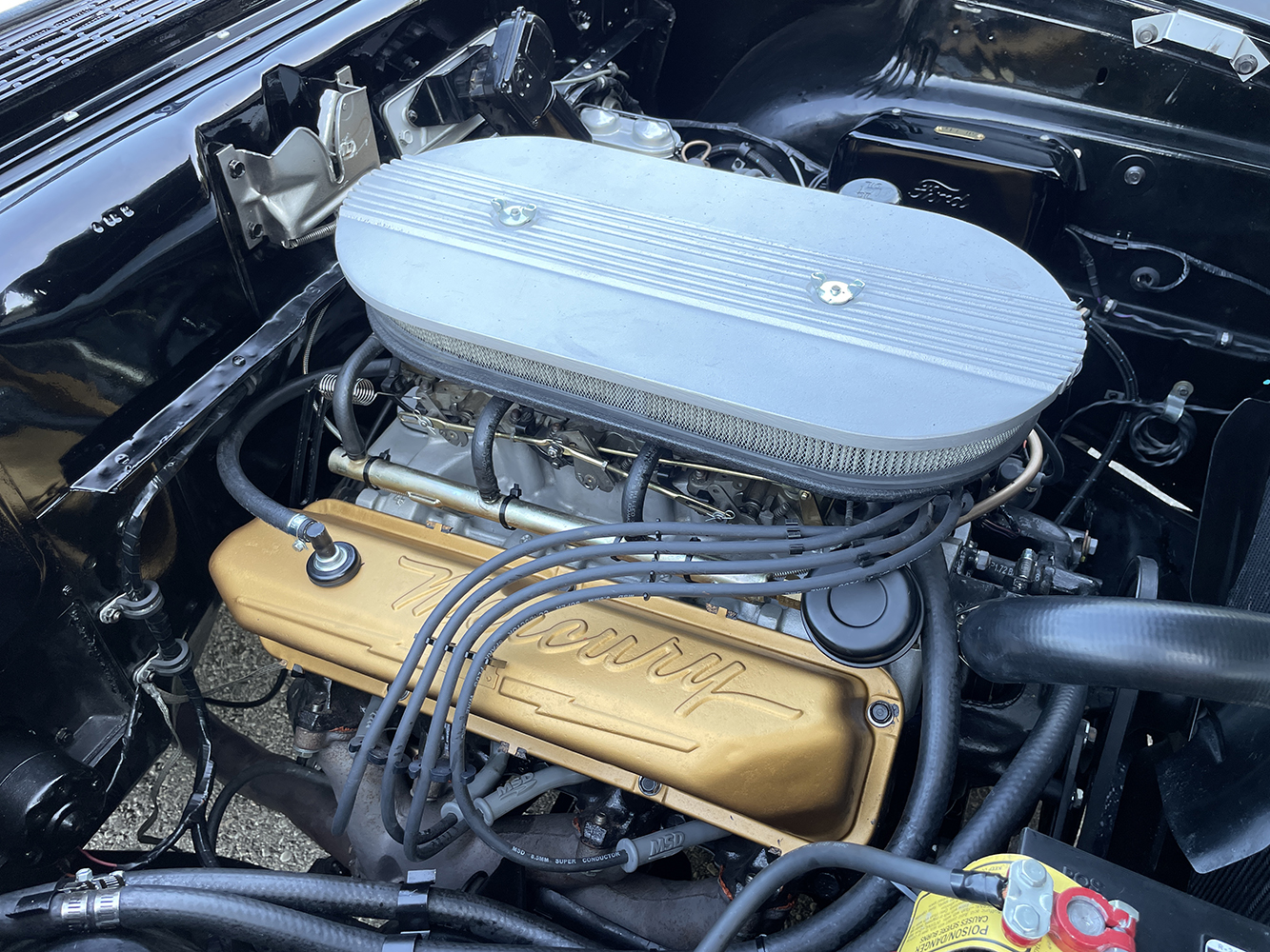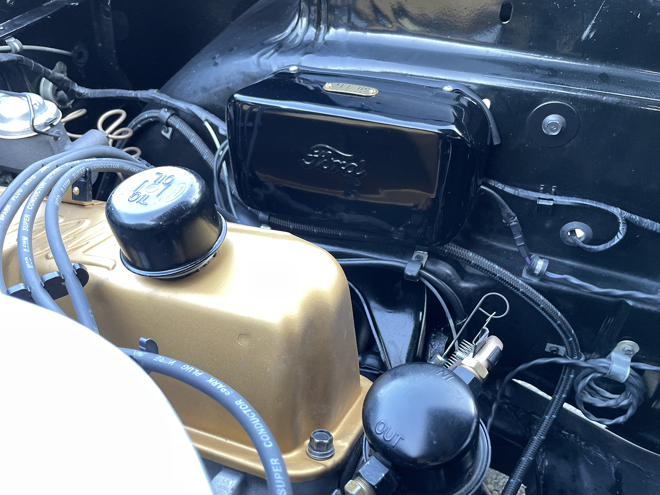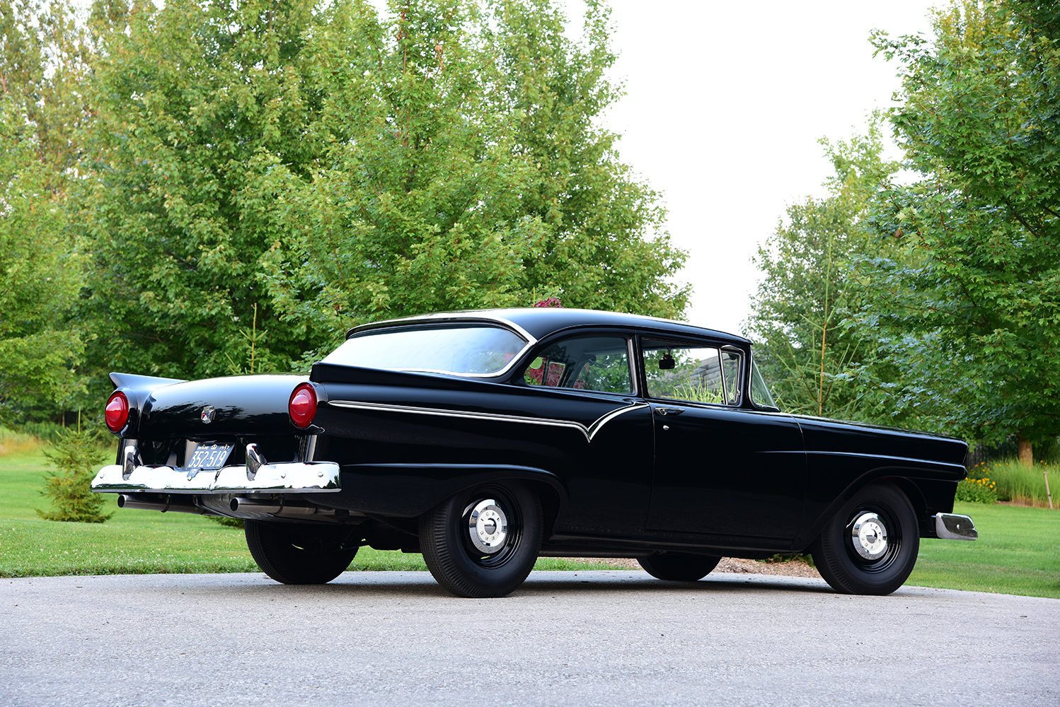 The body was separated from the chassis to get started, with the base being disassembled and the frame blasted clean. After inspection, it was determined to be rock solid, with the only update being a slight notch to accept the addition of factory shorty-style headers later. From there, it was coated in chassis black and prepped for reassembly. Out back, the original Ford 9-inch rear was refreshed and packed with 3.50:1 gears, spinning 28-spline forged axles. To get the correct stance, the original four-leaf rear springs were tossed in favor of a set of fresh six-leaf Police-Special springs from McVeigh Truck Springs and 1956 Ford heavy-duty shocks with longer overall length from Dennis Carpenter. The factory IFS was rebuilt for crisp handling, including a set of factory heavy-duty 1-inch dropped coil springs from Eaton Detroit Spring and tube shocks from Dennis Carpenter combined with a heavy-duty 1-1/8-inch sway bar from Southwest T-Bird Parts. When it comes time to tame the beast, a Mustang dual master moves fluid through Ni-Cop lines to Ford drum brakes fore and aft. In keeping with the sleeper theme, 1956 Ford 15×5.5 steel wheels wear Firestone/Coker Deluxe Champion bias-ply blackwall tires sized 7.10×15 at each corner. A set of 1957 Ford dog dish caps is the perfect icing to tie it together.