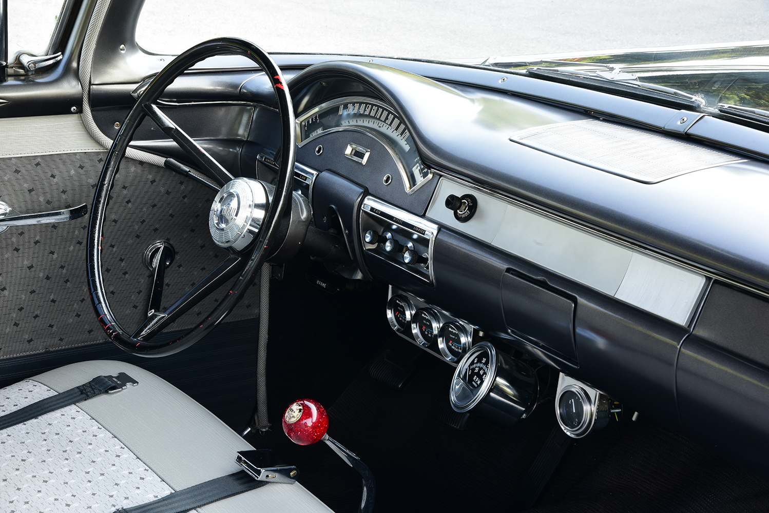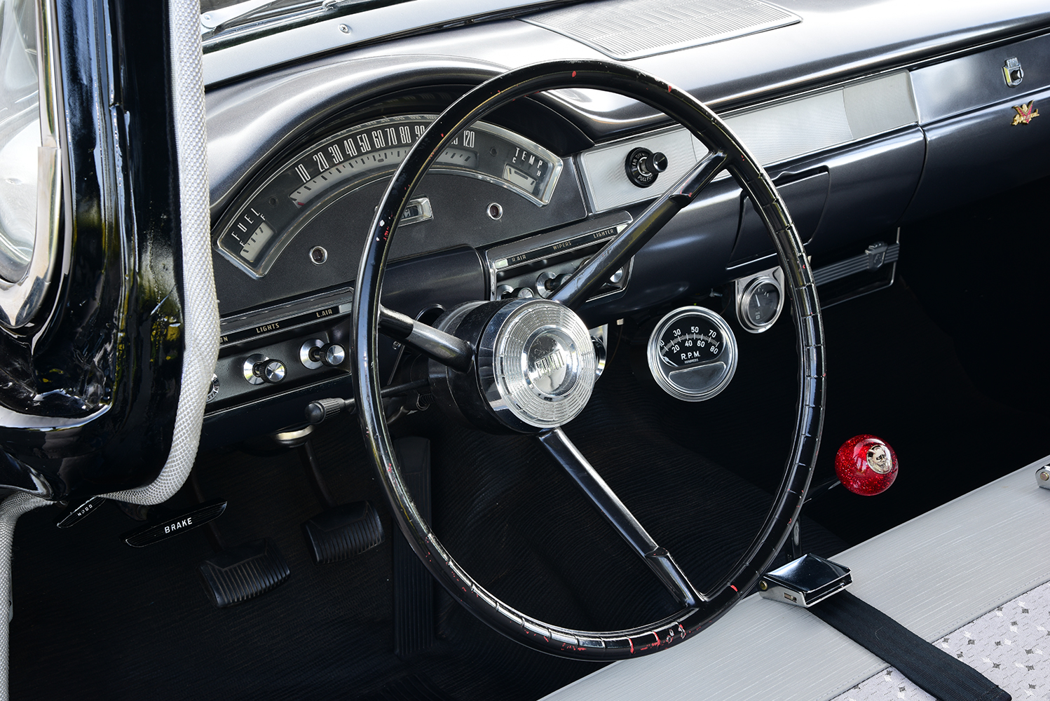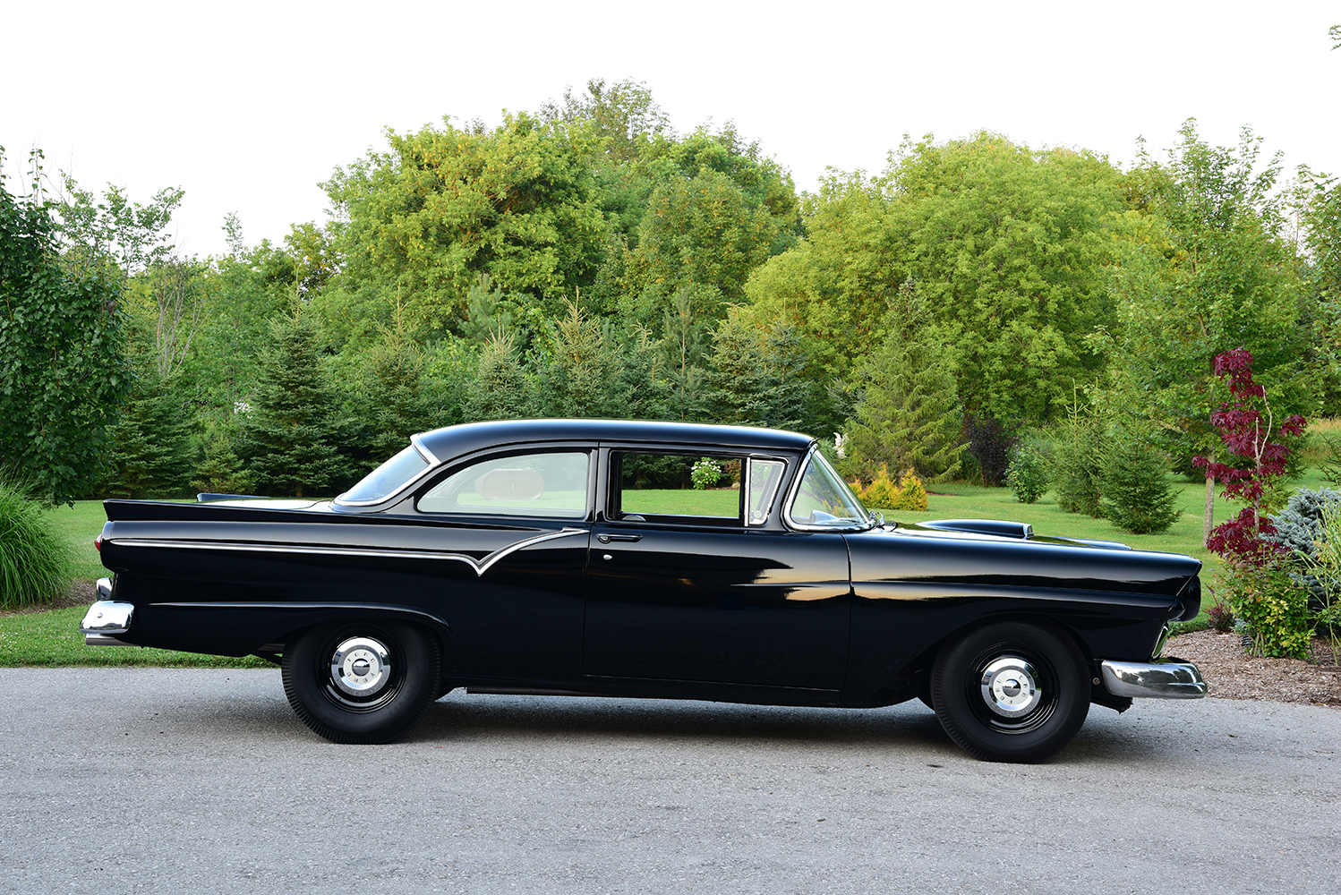 When it came time to address the business office, it was a matter of maintaining simplicity with a twist. The factory dash was restored with its original instruments complemented by underdash dials from Sunpro and Stewart-Warner, accented by a Bosch tachometer. The original Custom steering wheel carves a course through a stock 1958 Ford column to a matching steering box with shifts clicking through a Hurst Competition-Plus Shifter. To kill the chill on cold days, a dealer-installed aftermarket heater does the trick, while an EZ Wiring kit installed by Jeff and Redmond brings it all to life. To keep with the base theme of the car, Jesse Richardson Upholstery of Listowel, Ontario, Canada, recovered the factory bench with N.O.S. 1957 Ford Custom material from SMS Auto Fabrics and all related panels, installing the headliner and rubber floor coverings. The final twist of the build was to recreate the rare rear seat delete where no reproduction parts can be found. Jeff made the trip to Massachusetts to meet with good friend Jay Arrow, who just so happens to own an original restored Business sedan. Jeff was able to create templates to hand off to Purcell to work on his fabrication magic and recreate the tray area, which was complemented by the basic side panels crafted by Jeff. The completed car has a truly unique presence, blending factory high performance with an edge of simplicity, making it the ultimate 1950s-era hot rod sleeper waiting to take on anyone who dares.