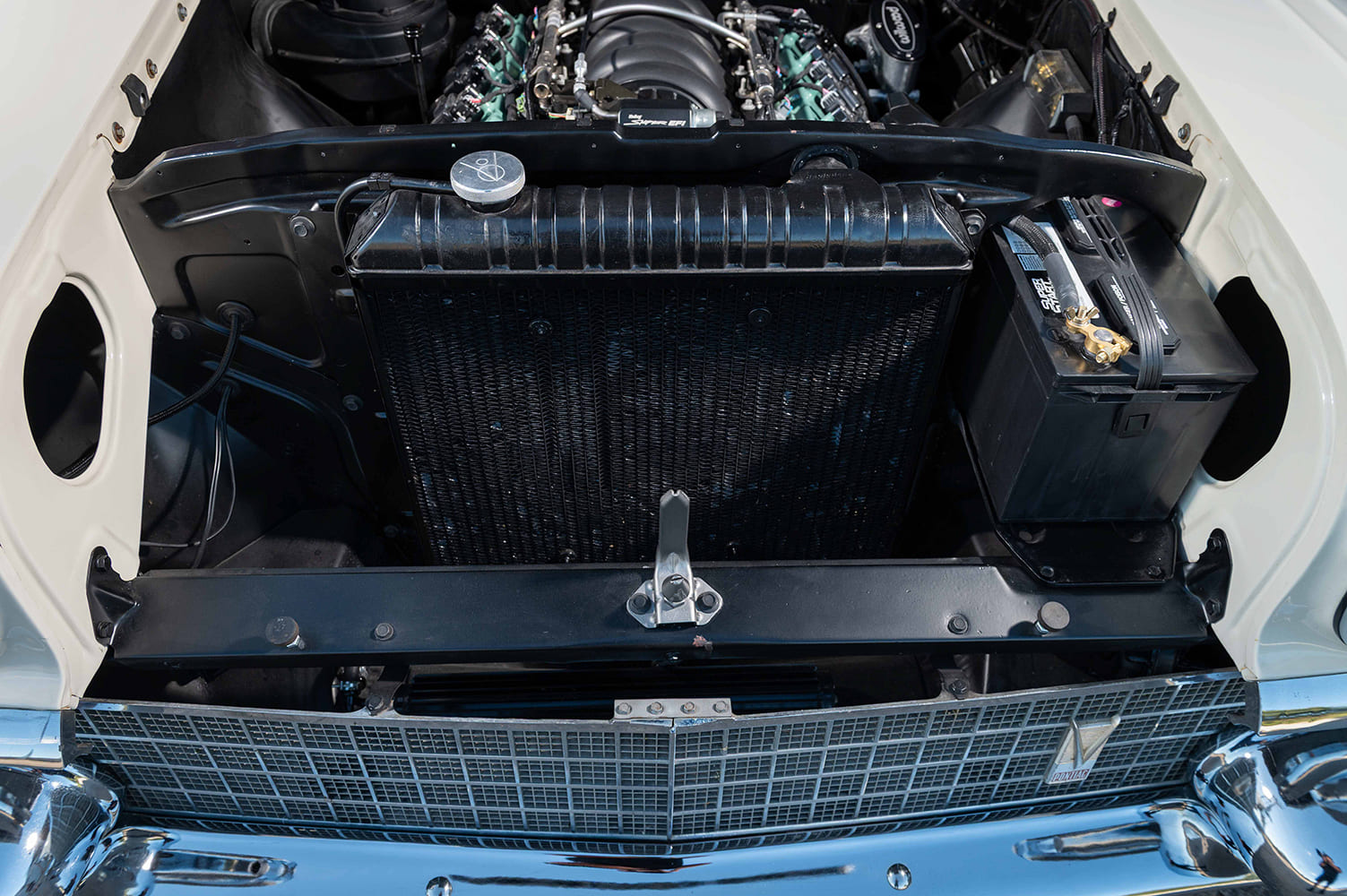 That’s when the plan for a modern drivetrain swap took shape with Tony and the crew at Downtown Auto Body (DTAB) in Shawnee, Oklahoma, leading the charge. The Bonneville’s original Tri-power engine was removed and replaced with an iron-block 5.3L LS powerplant. The build was far from stock. Tony added several performance upgrades to ensure the car performed as well as it looked. The upgrades included a Brian Tooley Racing Truck Norris camshaft, LS2 aluminum heads from a 2005 GTO, Wiseco 10.1:1 flat-top pistons, Holley aluminum valve covers, a Holley 92mm throttle body paired with a GTO LS2 intake, and 2-1/2-inch Hooker headers for improved exhaust flow. Supporting the engine is a 4L70E transmission built by DannahShay Transmissions, providing reliable performance for highway cruising and show drives. The original gauge cluster was upgraded to work with its new LS powerplant.