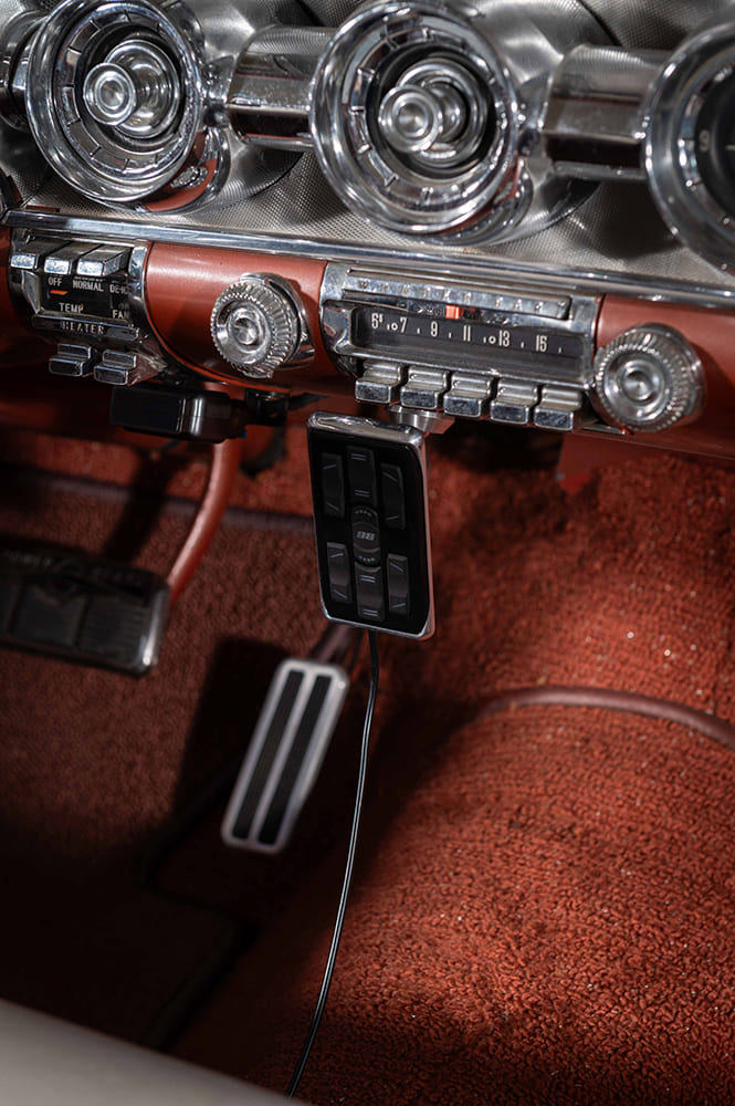 Once the car returned to DTAB, it was time to find the right rolling stock to complement its classic lines. After some searching, Candice found a truly special set of 15×7 one-off Colorado Custom billet wheels, originally built for Rick Dore’s SEMA project in 2001. Wrapped in Diamond Back 215/70R15 tires with 2.5-inch whitewalls, the look achieved that perfect blend of vintage luxury and custom flair.