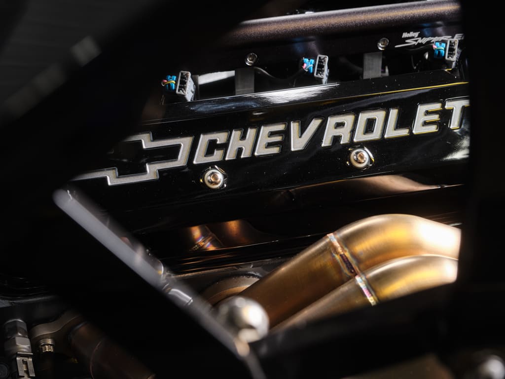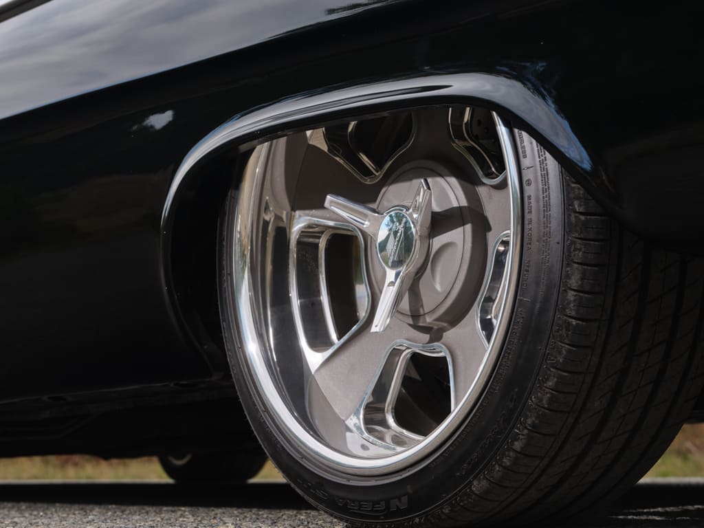 Massive Baer 14-inch rotors and six-piston calipers reside behind a set of Billet Specialties Legacy 2 wheels (19×8.5 front, 20×10 rear) and take orders from a Master Power Brakes electric booster for effortless pedal pressure, while a Baer proportioning valve ensures proper braking bias.