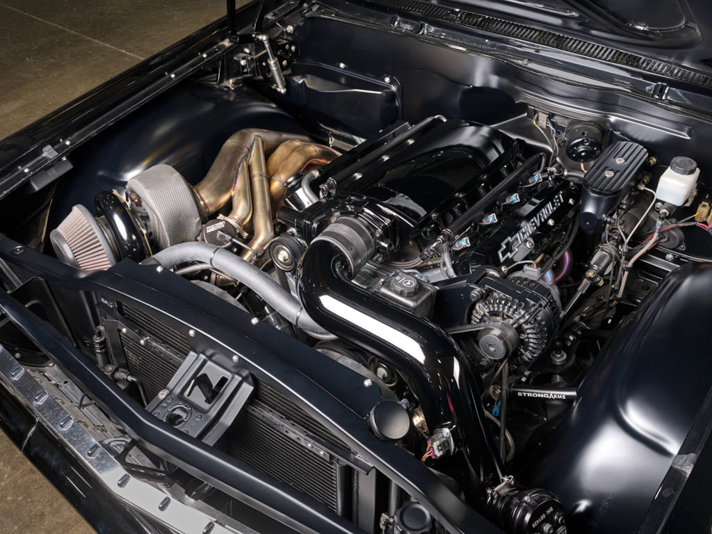 From there, the J-Rod crew snazzed up the LS with black Proform Parts valve covers and treated the Holley Sniper intake and custom intake tube to a deep gloss black for a brilliant, custom appearance. That dark demeanor is complemented by custom-built inner fenders and smoothed firewall offset by a pair of stainless custom J-Rod 1 7/8-inch headers. Black Widow Neighbor Haters top off the custom 3-inch stainless exhaust.