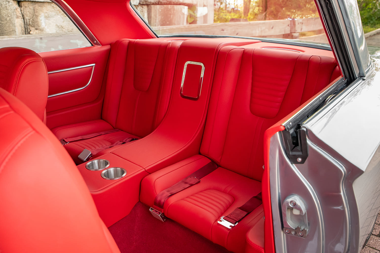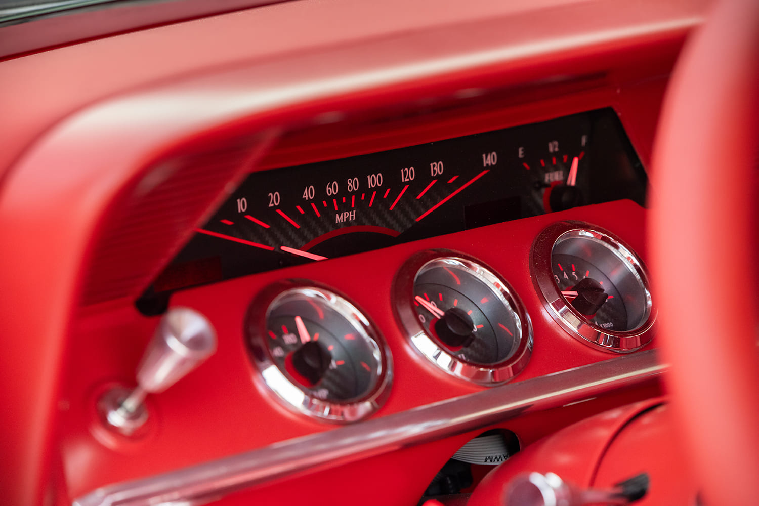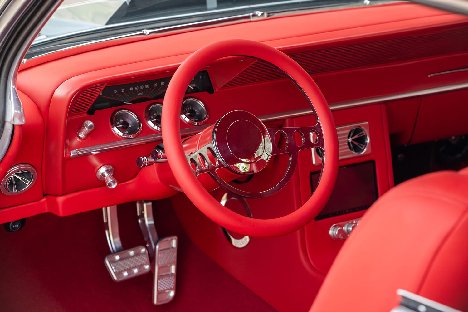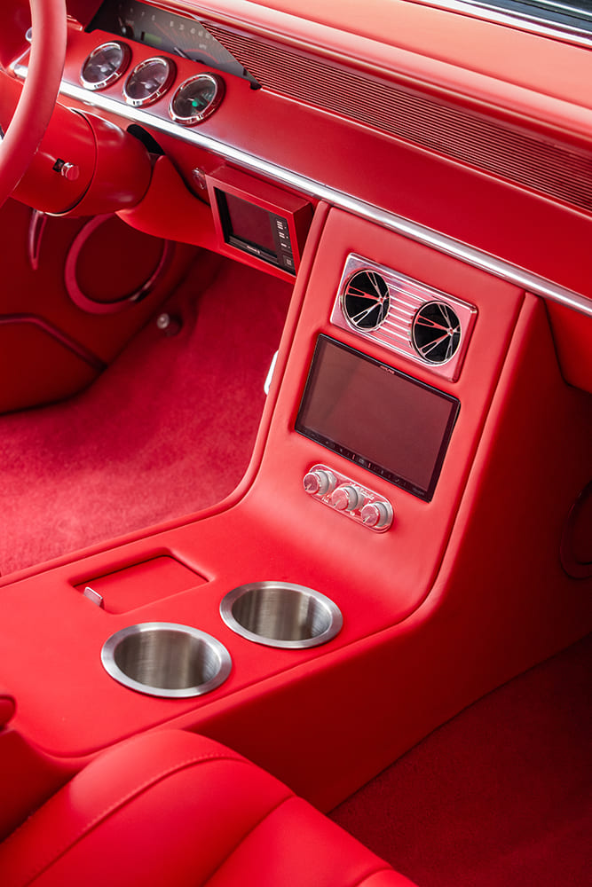 A look inside reveals what one expects, but there is more than meets the eye. While it appears to be a 1962, the dash is made from two 1962 dashes combined into one and is now equipped with Dakota Digital gauges. A new lower dashboard panel also houses the Speedway Motors tilt column and a custom half-wrapped red leather Forever Sharp two-spoke wheel. The center console extends from the lower panel between the bucket seats, reaching back between the rear buckets and up to the rear deck area. The center console holds air registers, the Vintage Air A/C controls, cup holders, GSM, electric e-brake, and a Sony touch screen stereo system supplemented with Skar Audio amplifiers and speakers. The e-brake is conveniently hidden in the center console and operated by a custom-fabricated electronic actuator. The pedal assembly (brake and throttle) is sourced from Scott’s Hotrods, featuring its drive-by-wire gas pedal. Bringing all the hot rod’s electrical needs together is a Painless Performance Products wiring system by Yarusinsky. The bucket seating was originally from a 2006 GTO, retaining only the power mechanism and framework, while the seats were then custom-built and covered in red leather by Javier, who handled all the interior stitchwork that includes the one-piece leather headliner, door and kick panels, and carpeting. The trunk is also fully detailed through upholstery and now houses the mechanics for the Ridetech system and the OPTIMA battery.