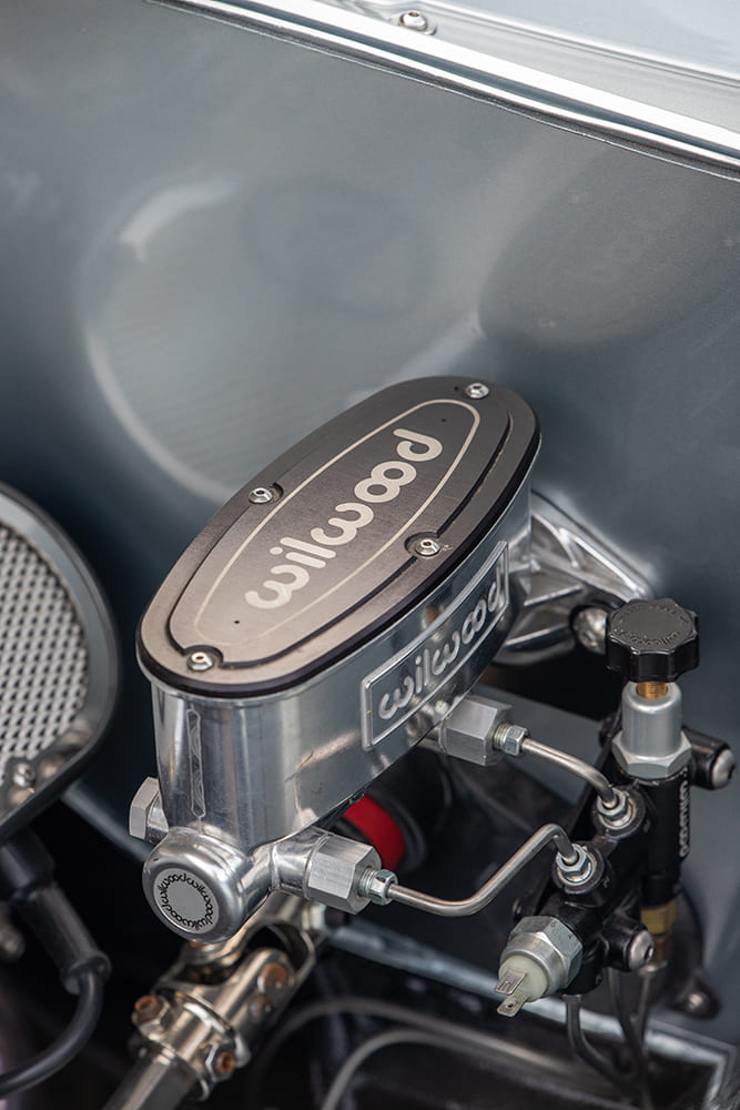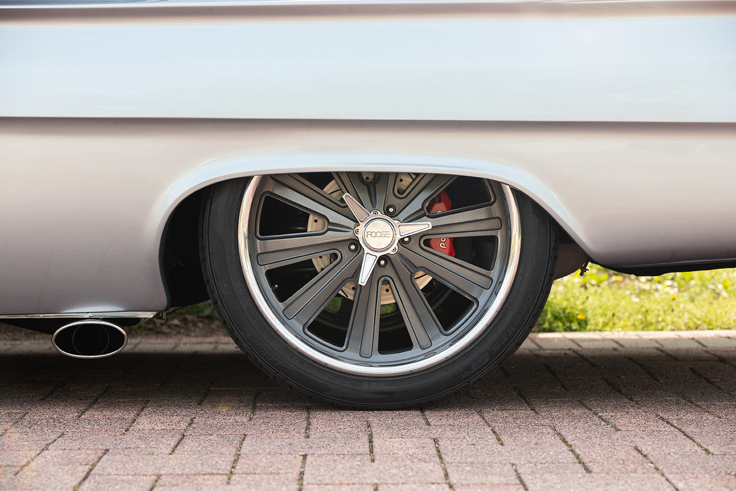 The 1962 body retains much of its ’60s appeal, but the bumpers have been brought closer (tucked) to the body, along with custom-matched grille work on both the front and rear bumpers. The quarter-panels (wheelwell openings) were modified to accommodate the oversized tire and wheel combination. Yarusinsky hand-fabricated all the inner fenders, firewall, and radiator cover. The locks on the door and trunklid were shaved to enhance the car’s exterior appearance. A 2-inch rise cowl hood is now in place. All the metalwork, followed by the bodywork and application of the 2023 Toyota silver with tint, was handled by Yarusinsky.