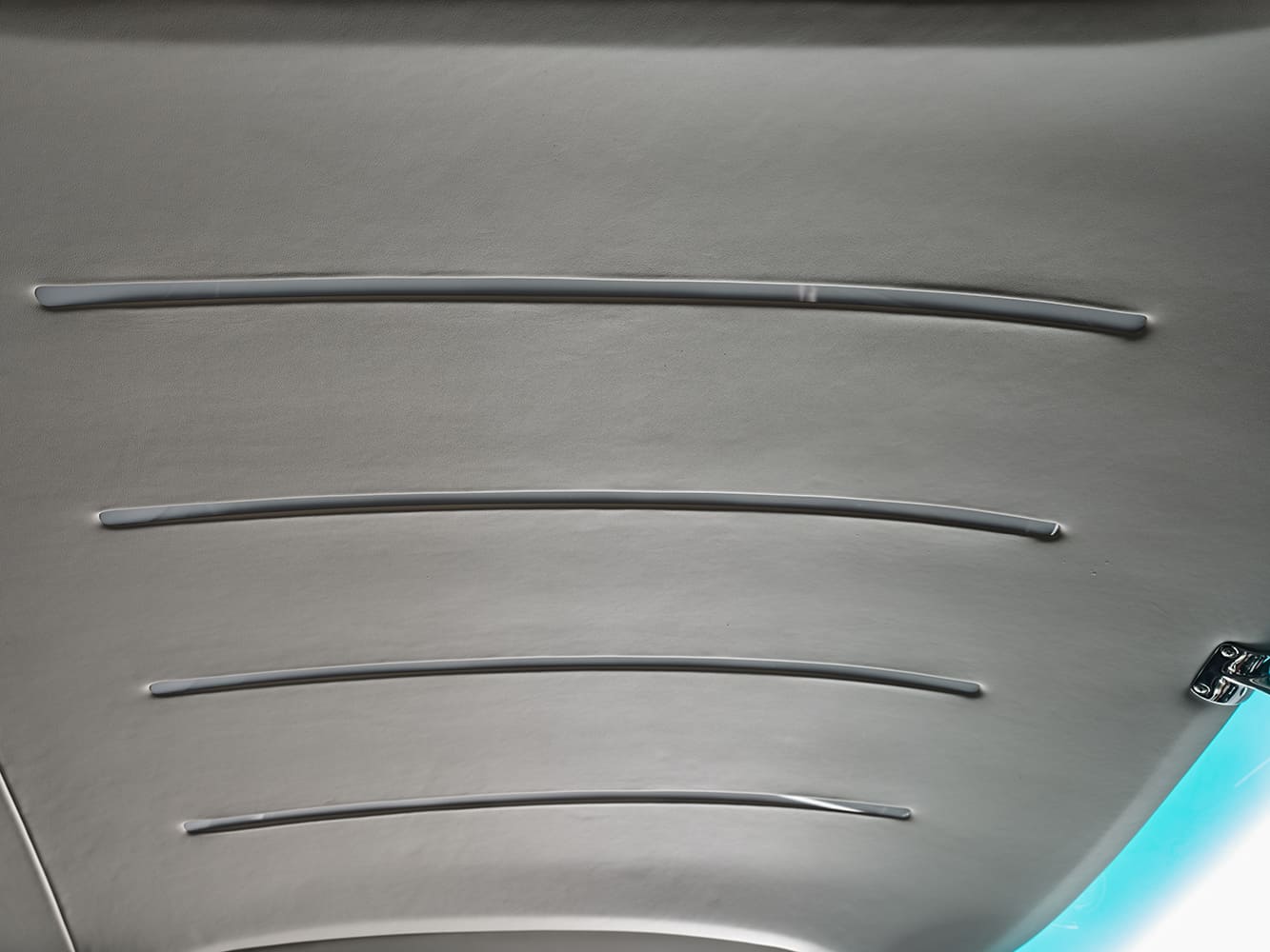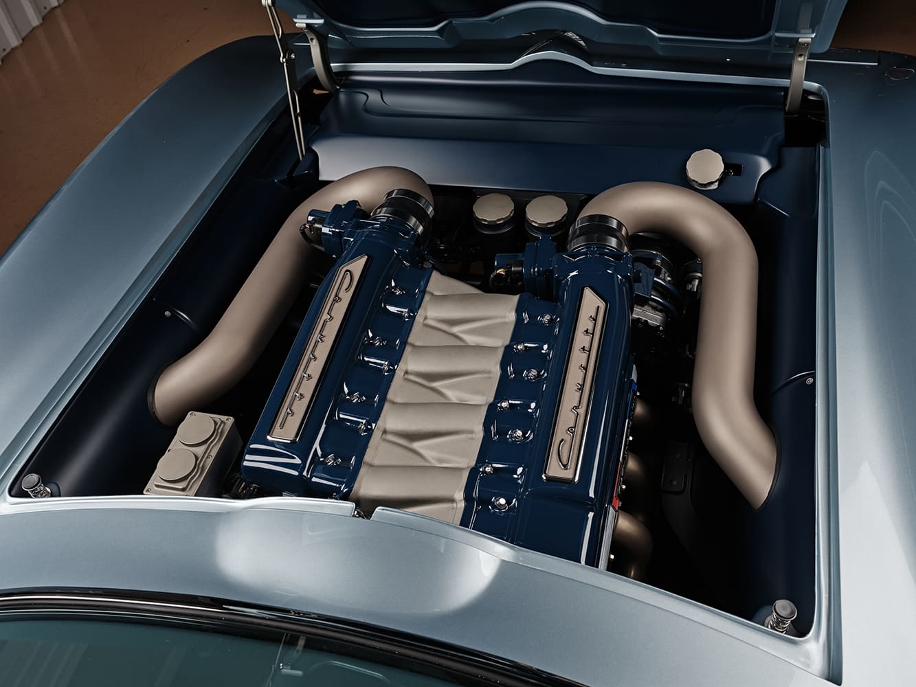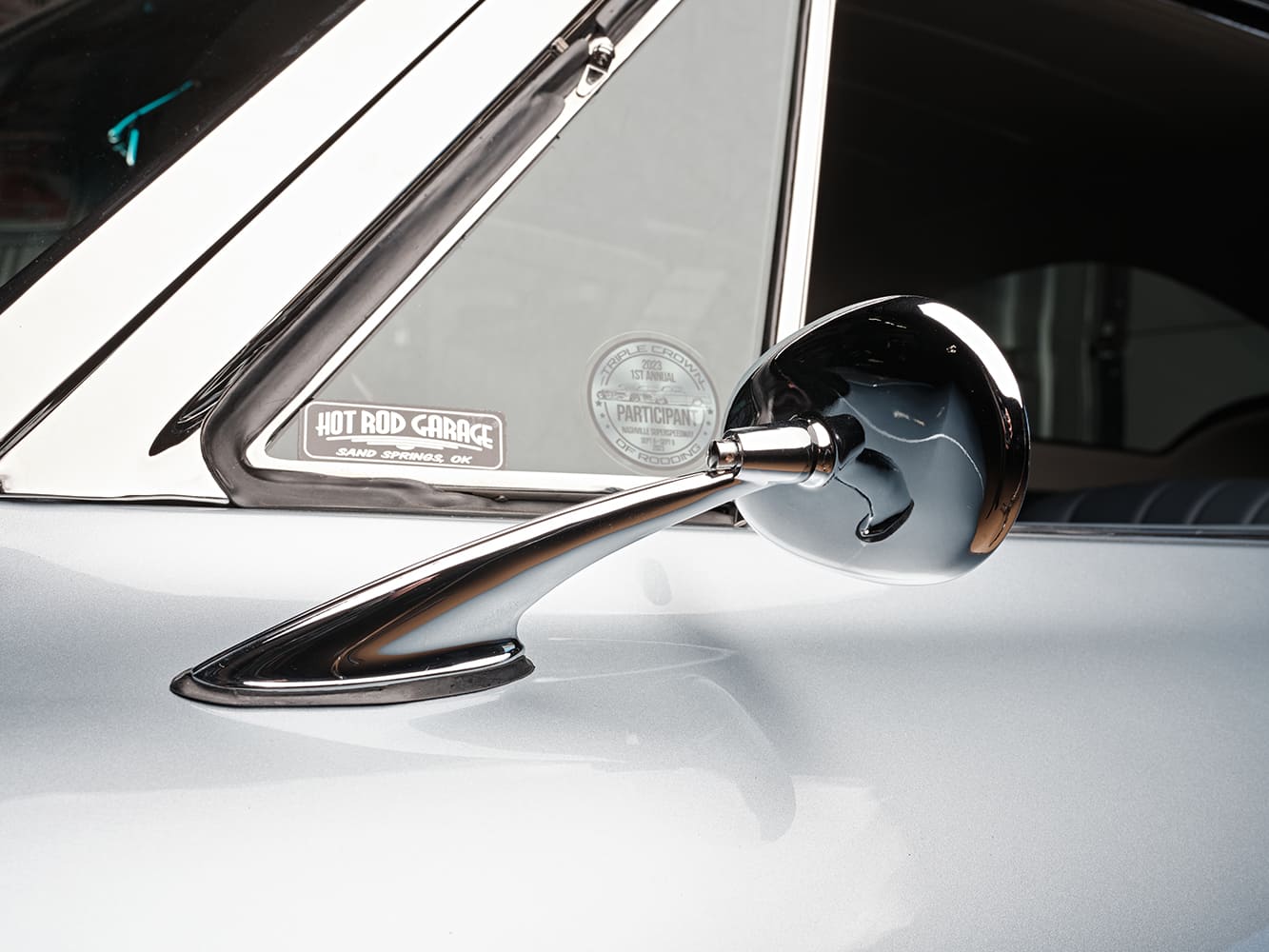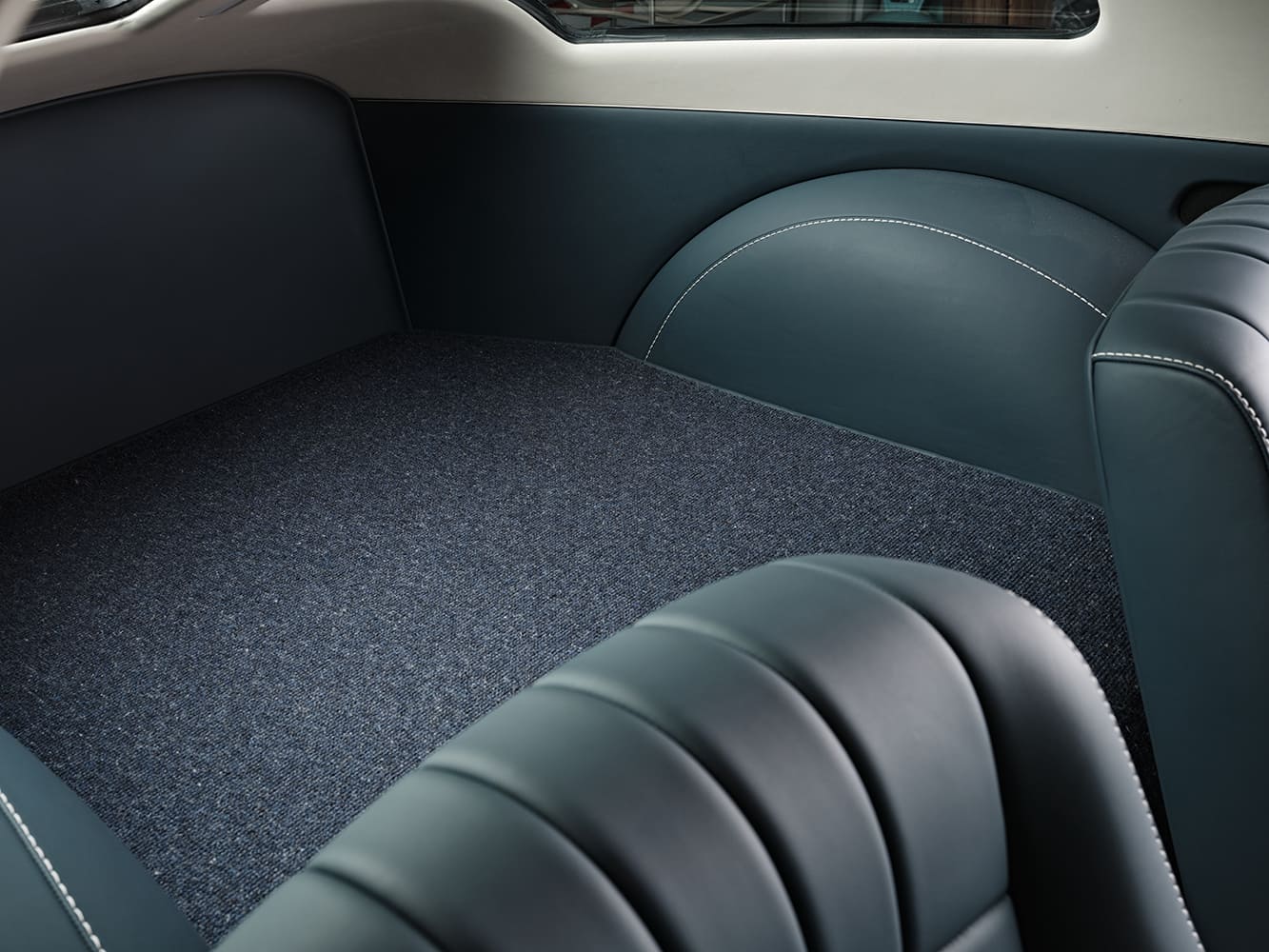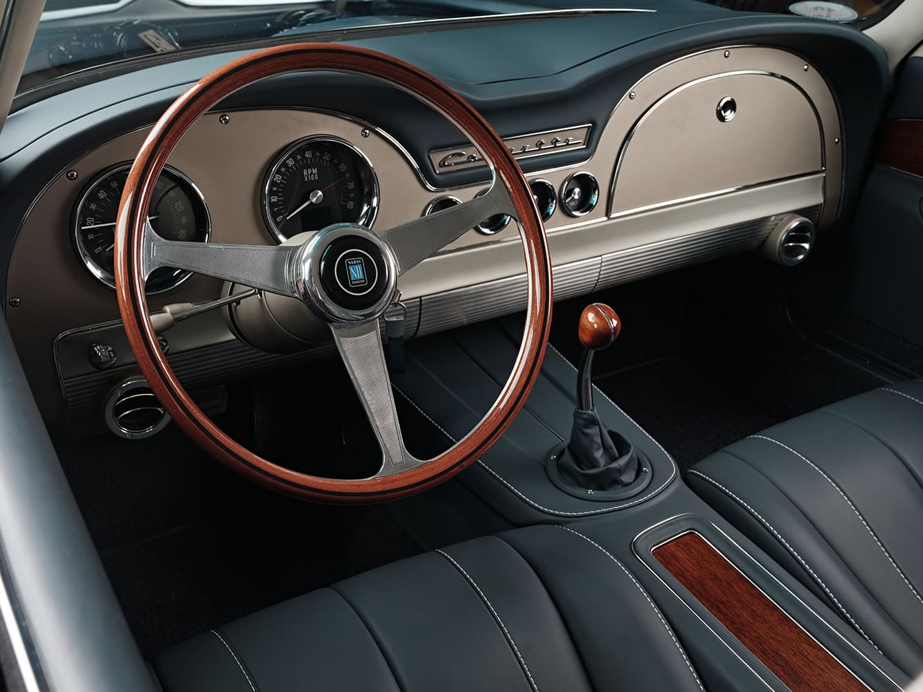Next, Jaguar door handles, Porsche 356 side mirrors, and custom-built 16-gauge stainless steel rockers find their new place. While maintaining their original appearance, the front and rear bumpers have been thinned and now fit more snugly to the body. The hood was enhanced by removing the faux twin vents, improving its appearance, while custom hood hinges and latch mechanisms are now utilized.
