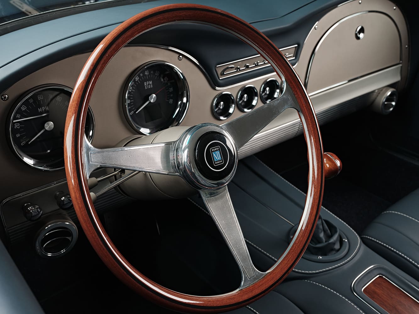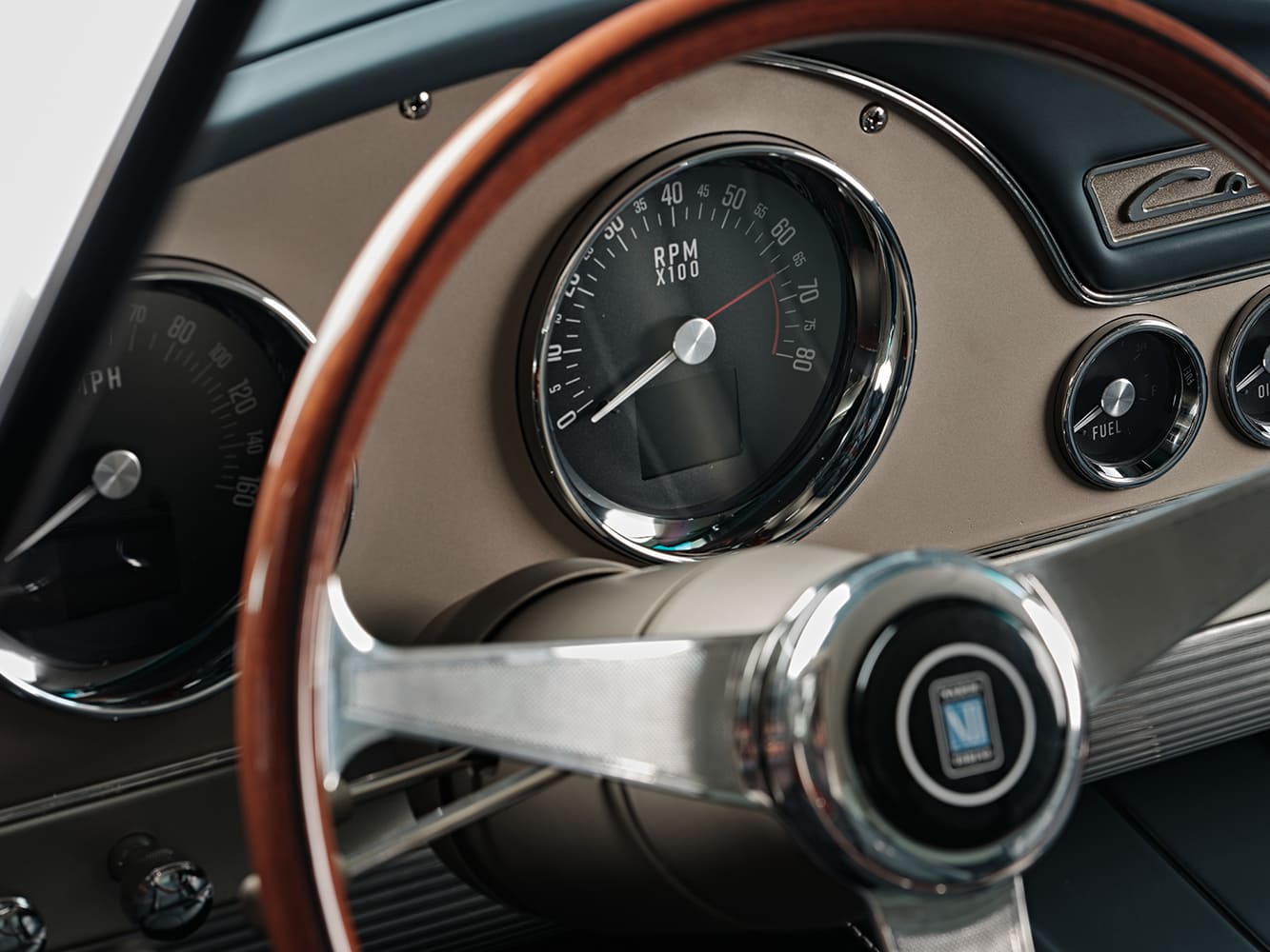 Other interior features include the Ididit tilt steering column, a Nardi three-spoke sporty wheel, and a Vintage Air A/C system. The necessary wiring is based on an American Autowire system that HRG’s own Gene Anderson installed. The custom front bucket seats were made by Chuck Rowland, who also managed the upholstery featuring Navy Blue leather on the seats, doors, and kick panels. The carpeting is made of blue German wool. The headliner is a unique one-piece fiberglass shell covered in cream-colored leather, complete with custom LED light strips.