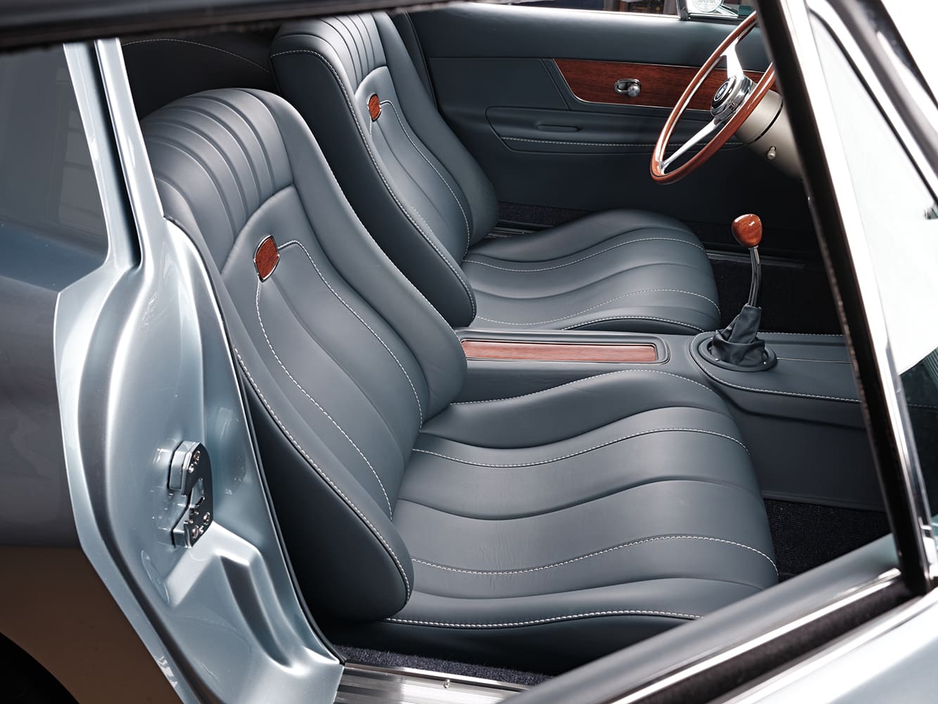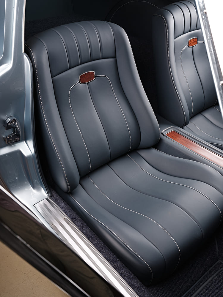 Beneath the leading edge of the modified hood lies a 1967 Corvette grille: initially subtle but a significant and noteworthy modification. HRG redid the rear wheeltubs and flooring. From this point, Kenny Small of HRG performed the necessary bodywork. Tom McDonald, also from HRG, applied the PPG two-stage basecoat/clearcoat in Ferrari Grigio Alloy Metallic (paint code 750). Grigio Alloy is a very light gray with distinct blue undertones. It can appear pale blue in certain lighting, particularly when the sun hits it. It’s often described as a silver metallic with a light blue undertone, creating a unique mix of gray and blue. Corvettes, particularly this one, showcase minimal brightwork, but Jon Wright’s CustomChrome Plating expertly crafts the existing elements.