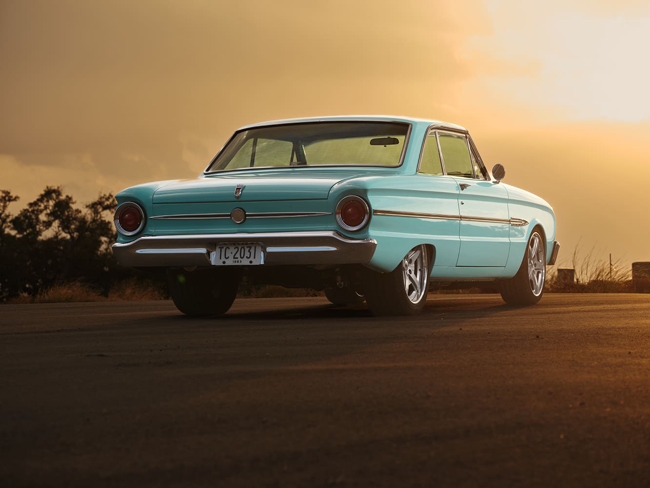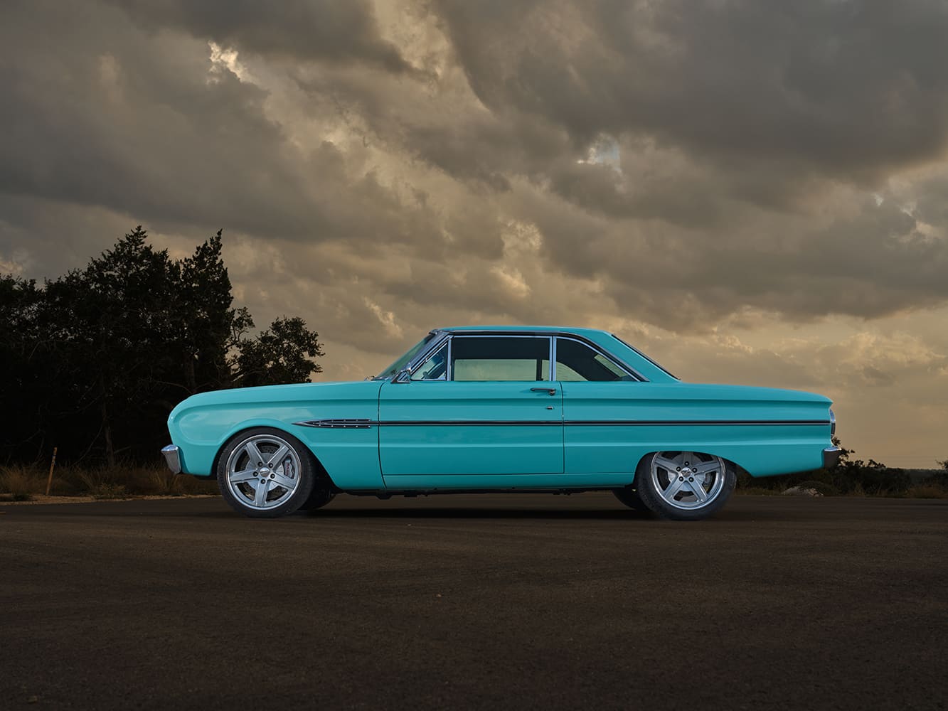 The Falcon’s body has also undergone numerous refinements, including a shaved cowl vent, reshaped bumpers tucked closer to the body, and 4-inch-wider rear wheeltubs. Holley LED headlights and digital taillights are in place. When we asked Smith about the paint, he told us an interesting story about the color selection.