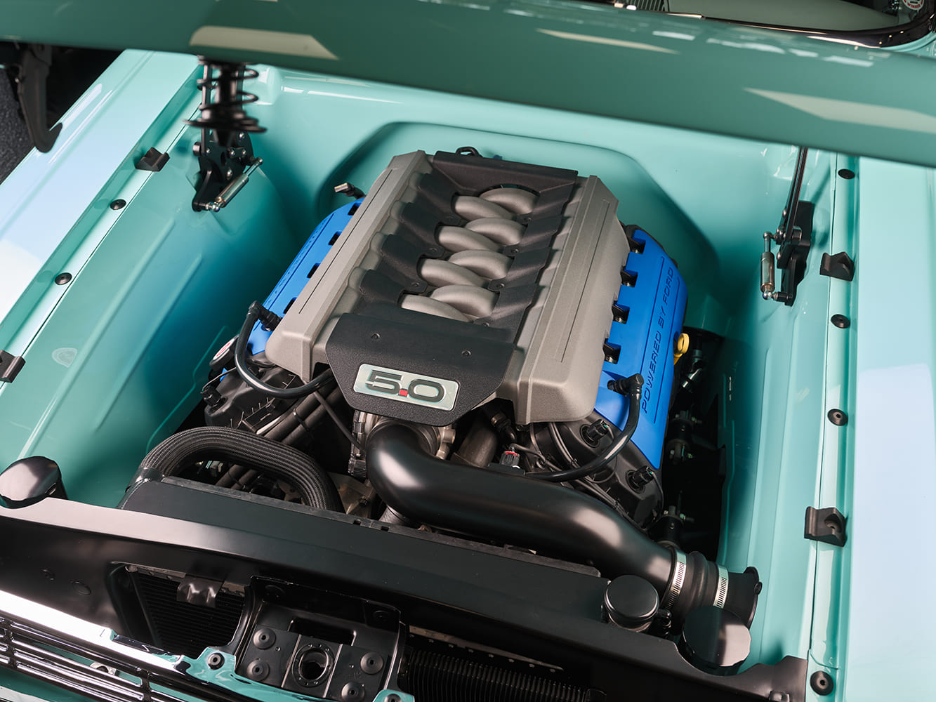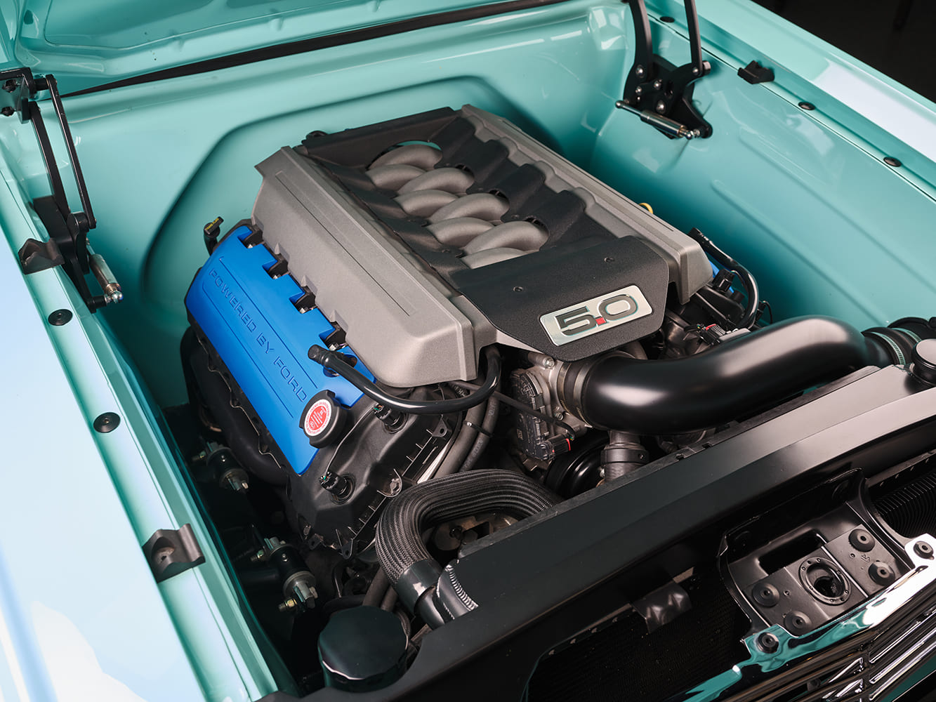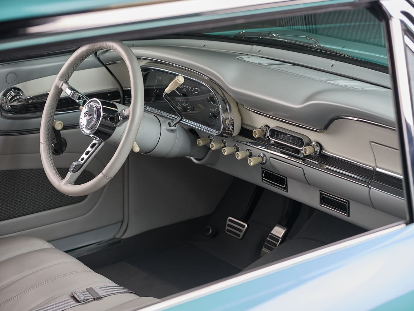 The 5.0L Ford Performance Coyote delivers 450 hp and features an aluminum block and heads, breathing through a custom intake system designed and fabricated by the CC team built on top of a factory EFI system utilizing MSD plug wires and an XS battery. To expel the spent gases, a set of Ultimate headers with 1-7/8-inch primary tubes is used, eventually connecting to a custom exhaust system made from stainless steel 2-1/2-inch pipes that lead to a pair of MagnaFlow mufflers. The entire exhaust system is largely CC’s handiwork. A Vintage Air Front Runner serpentine belt system manages the accessory drive for the A/C, water pump, power steering, and charging system. At the same time, the cooling combo is provided by C&R Radiator, including the radiator and a separate transmission cooler. Additional engine accessories include the SPAL electric fan, a Mechman alternator, and a factory starter. A Bowler Performance Transmissions–prepped 4R70W overdrive automatic with a 2,400-rpm stall speed converter transmits all this power to the rear, while an Ididit column-shift mounted lever handles the gear selection.