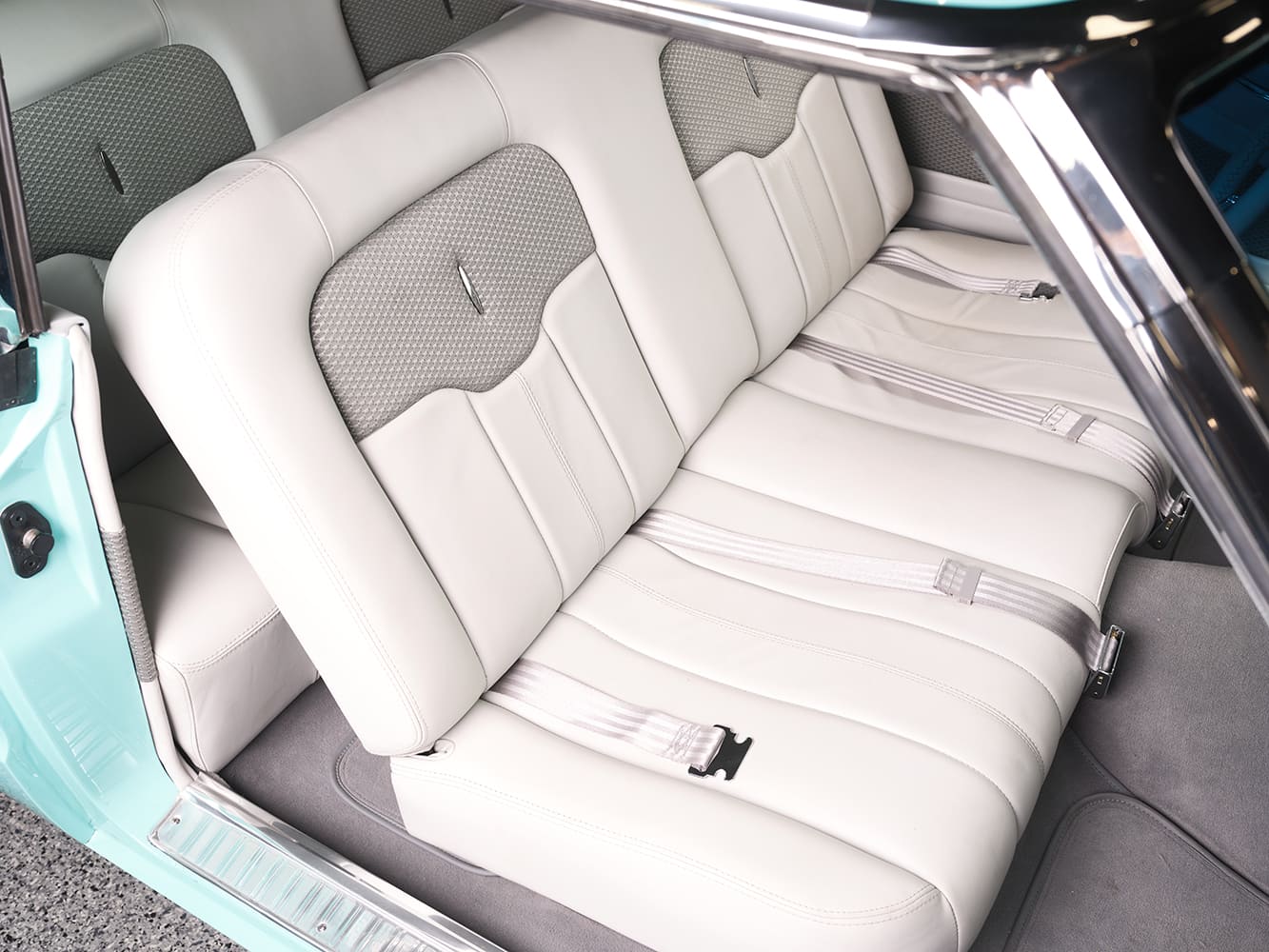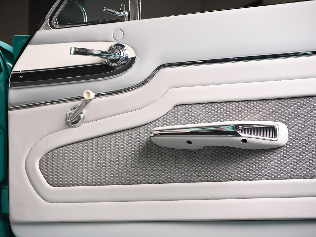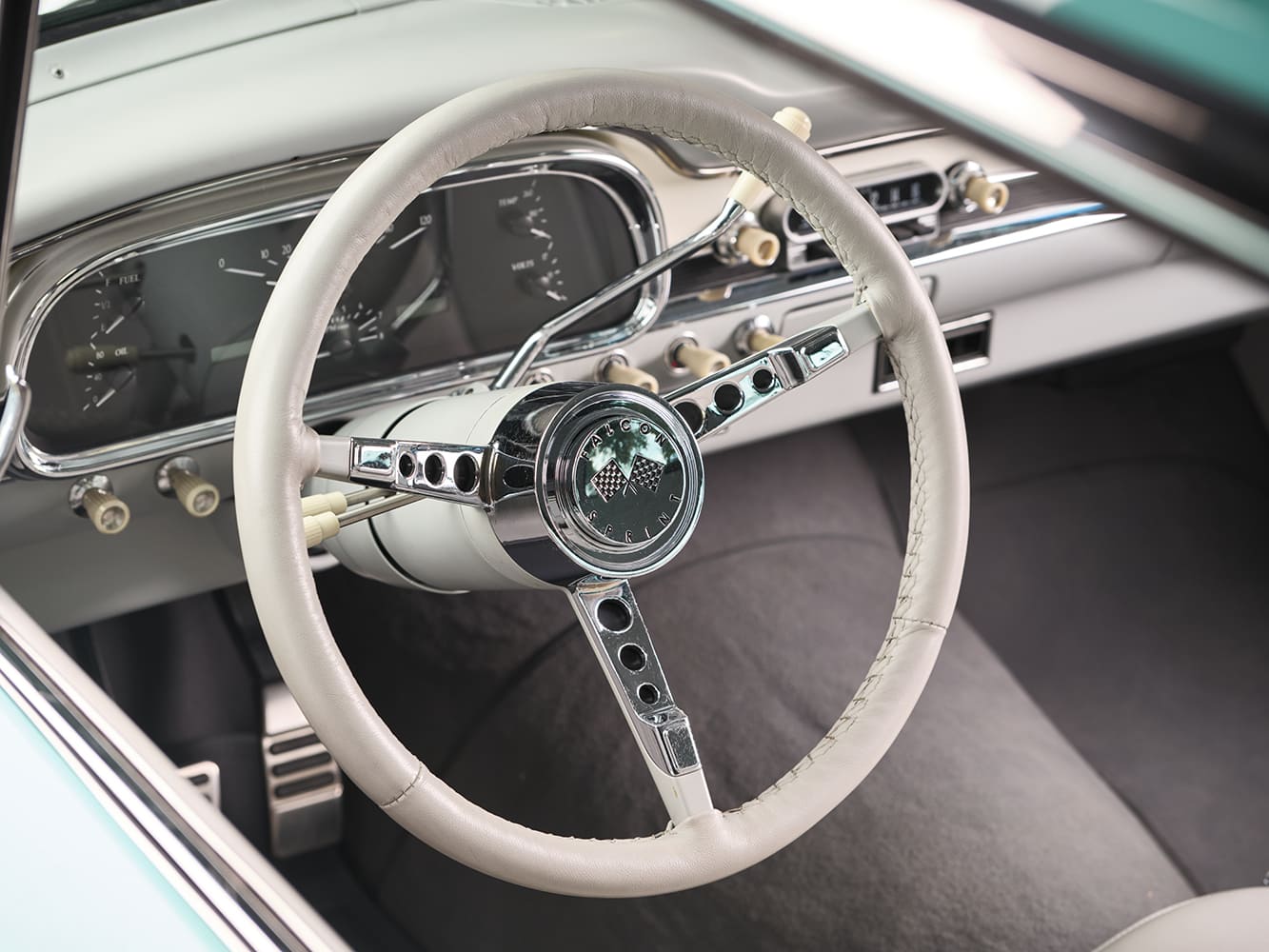 The 5.0L Ford Performance Coyote delivers 450 hp and features an aluminum block and heads, breathing through a custom intake system designed and fabricated by the CC team built on top of a factory EFI system utilizing MSD plug wires and an XS battery. To expel the spent gases, a set of Ultimate headers with 1-7/8-inch primary tubes is used, eventually connecting to a custom exhaust system made from stainless steel 2-1/2-inch pipes that lead to a pair of MagnaFlow mufflers. The entire exhaust system is largely CC’s handiwork. A Vintage Air Front Runner serpentine belt system manages the accessory drive for the A/C, water pump, power steering, and charging system. At the same time, the cooling combo is provided by C&R Radiator, including the radiator and a separate transmission cooler. Additional engine accessories include the SPAL electric fan, a Mechman alternator, and a factory starter. A Bowler Performance Transmissions–prepped 4R70W overdrive automatic with a 2,400-rpm stall speed converter transmits all this power to the rear, while an Ididit column-shift mounted lever handles the gear selection.