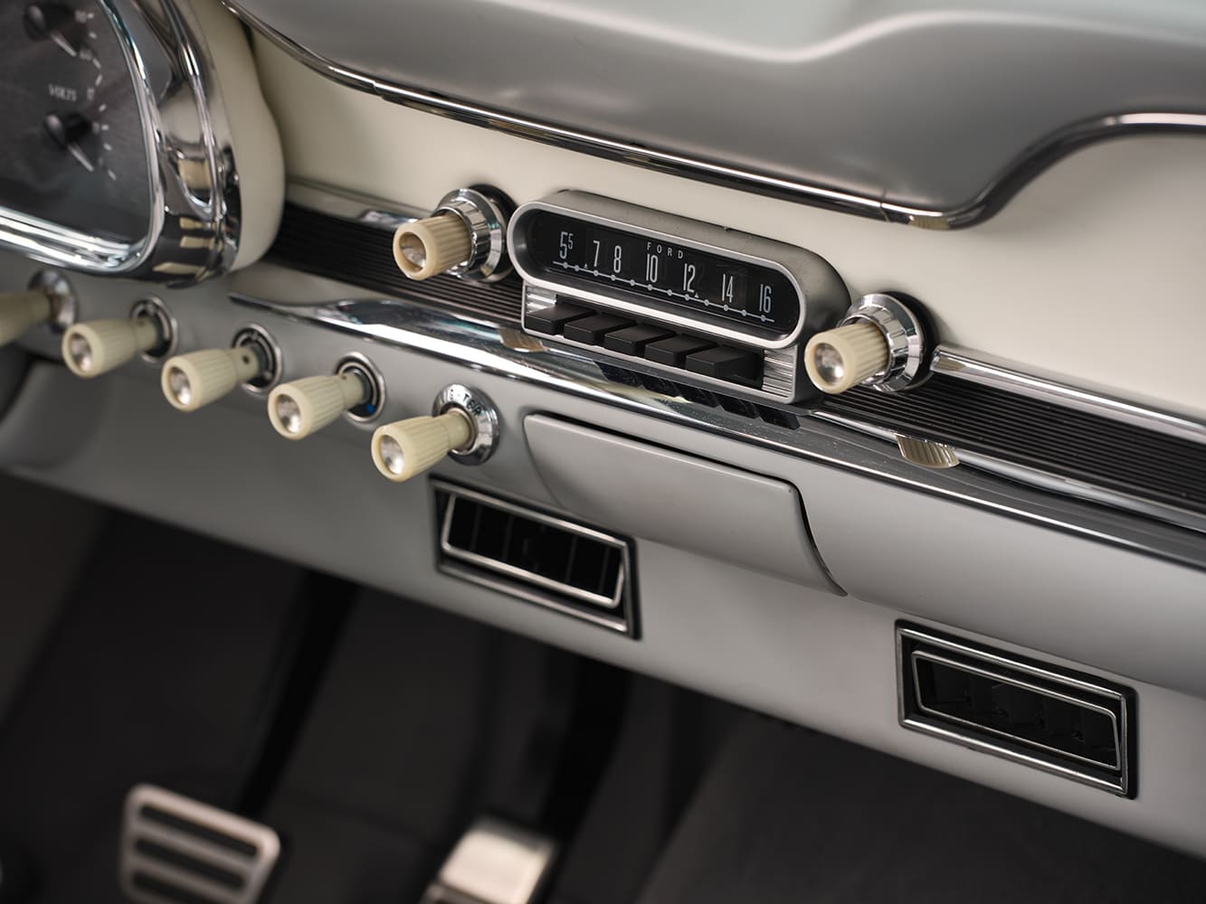 The Falcon’s factory dashboard is retained and painted light gray and off-white. From here, a Dakota Digital instrument cluster is utilized. The shortened Ididit steering column with column shift and an EVOD steering wheel are now attached to the dashboard. Note the column was shortened to accommodate the demands within the engine compartment. A new subpanel houses the A/C vents, while the A/C controls are mounted in the dash alongside the standard factory controls. There is also the genuine factory push-button AM radio.