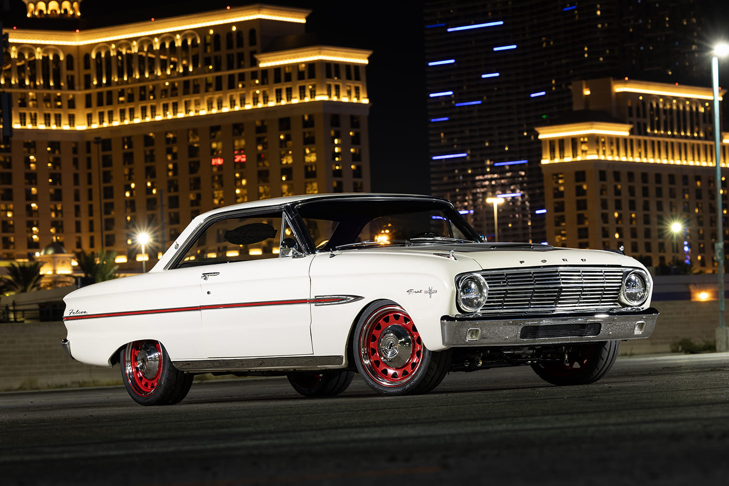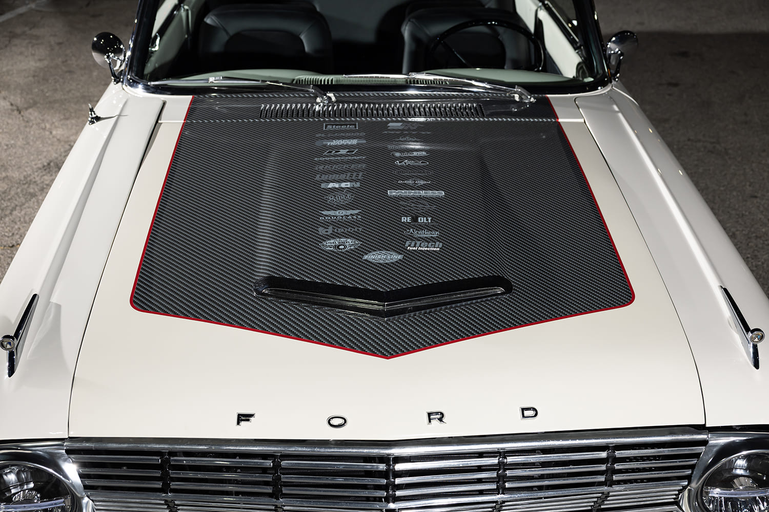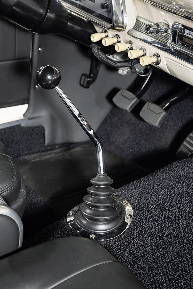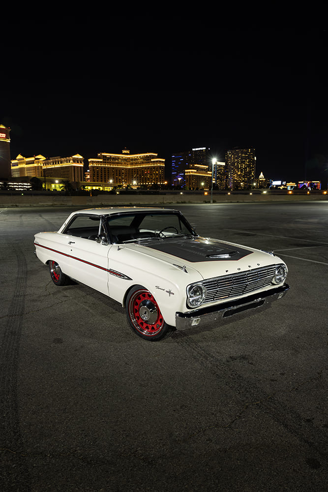 Next, the FLSS crew began working on the Falcon’s exterior by modifying the stock Sprint hood, moving the center bulge section forward by ¾ inch and raising the center by ½ inch. To contrast the stark white paint and give the car a sporty look, the hood (as well as the trunk) received carbon-fiber detailing and red pinstriping. It’s just enough carbon to still let the Falcon’s classic character shine through. New Auto Metal Direct bumpers freshen up each end, and United Pacific LED headlights and tails further update the 1963’s appeal.