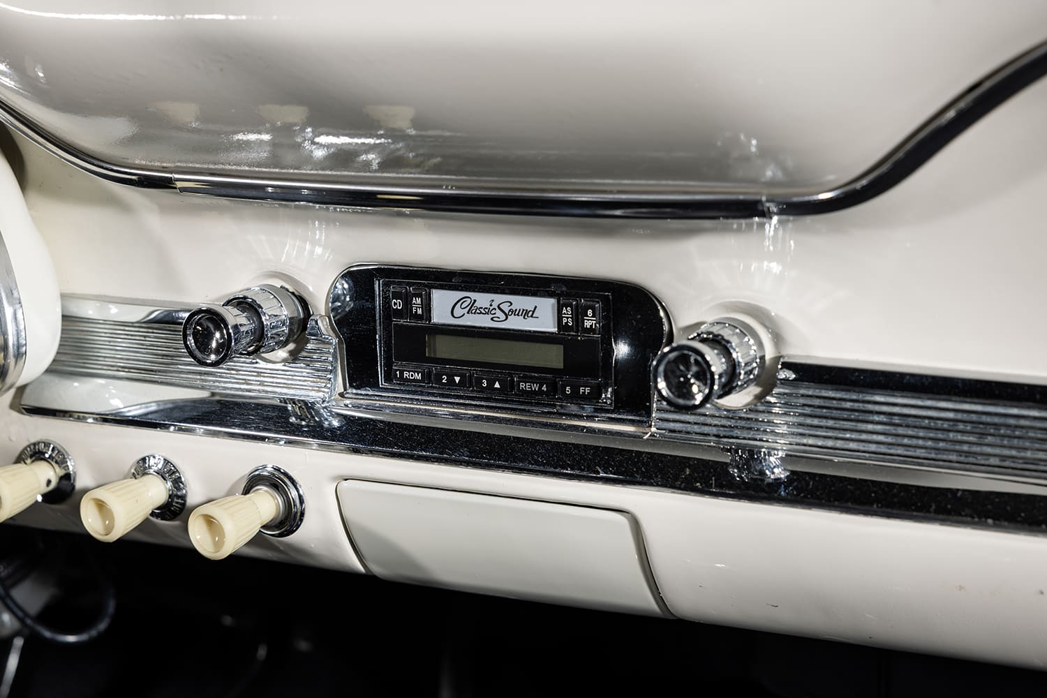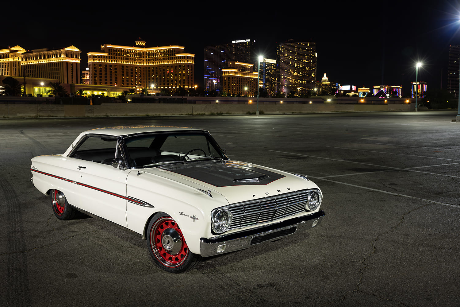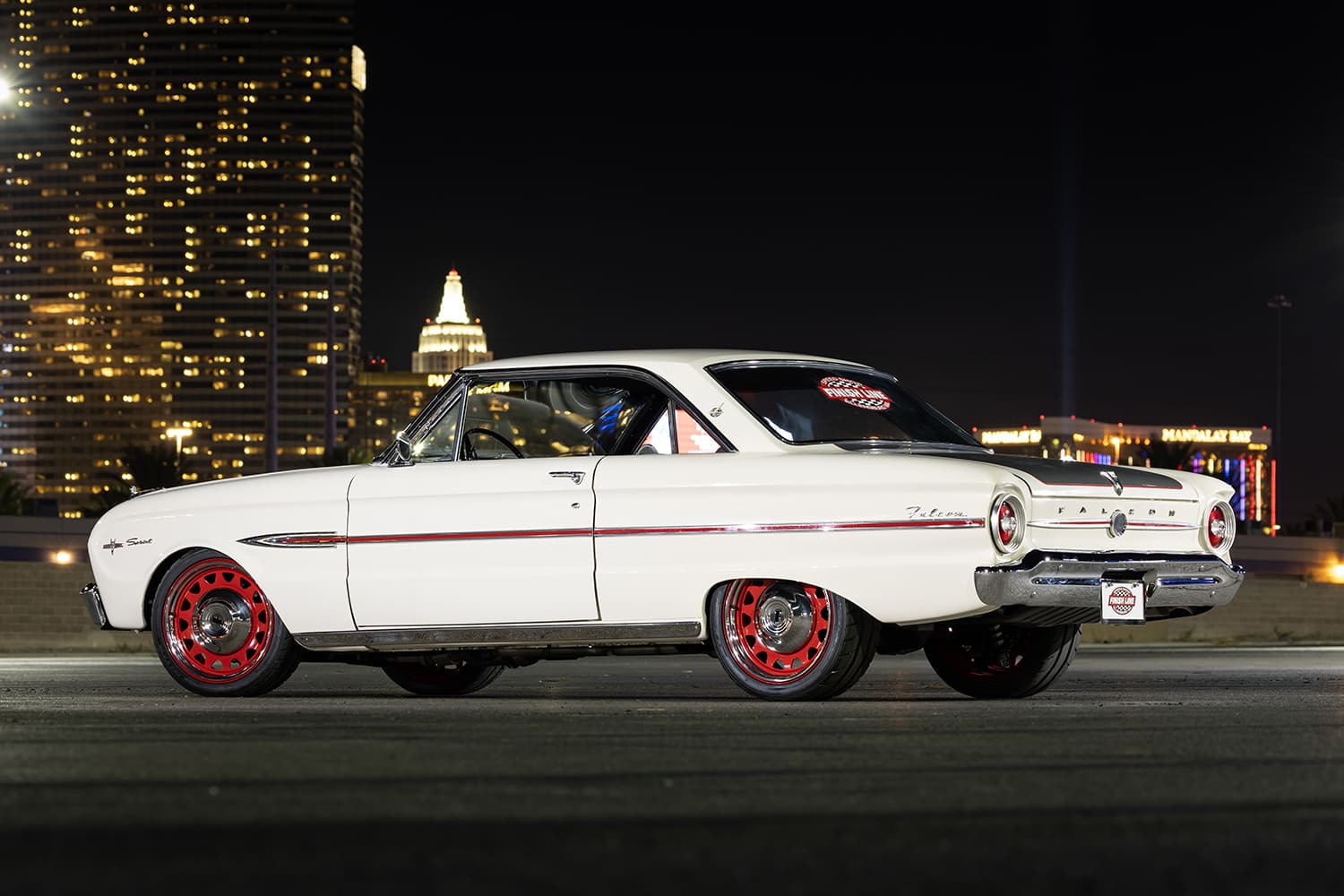 Next, the FLSS crew began working on the Falcon’s exterior by modifying the stock Sprint hood, moving the center bulge section forward by ¾ inch and raising the center by ½ inch. To contrast the stark white paint and give the car a sporty look, the hood (as well as the trunk) received carbon-fiber detailing and red pinstriping. It’s just enough carbon to still let the Falcon’s classic character shine through. New Auto Metal Direct bumpers freshen up each end, and United Pacific LED headlights and tails further update the 1963’s appeal.