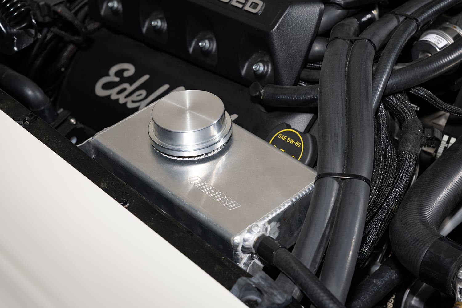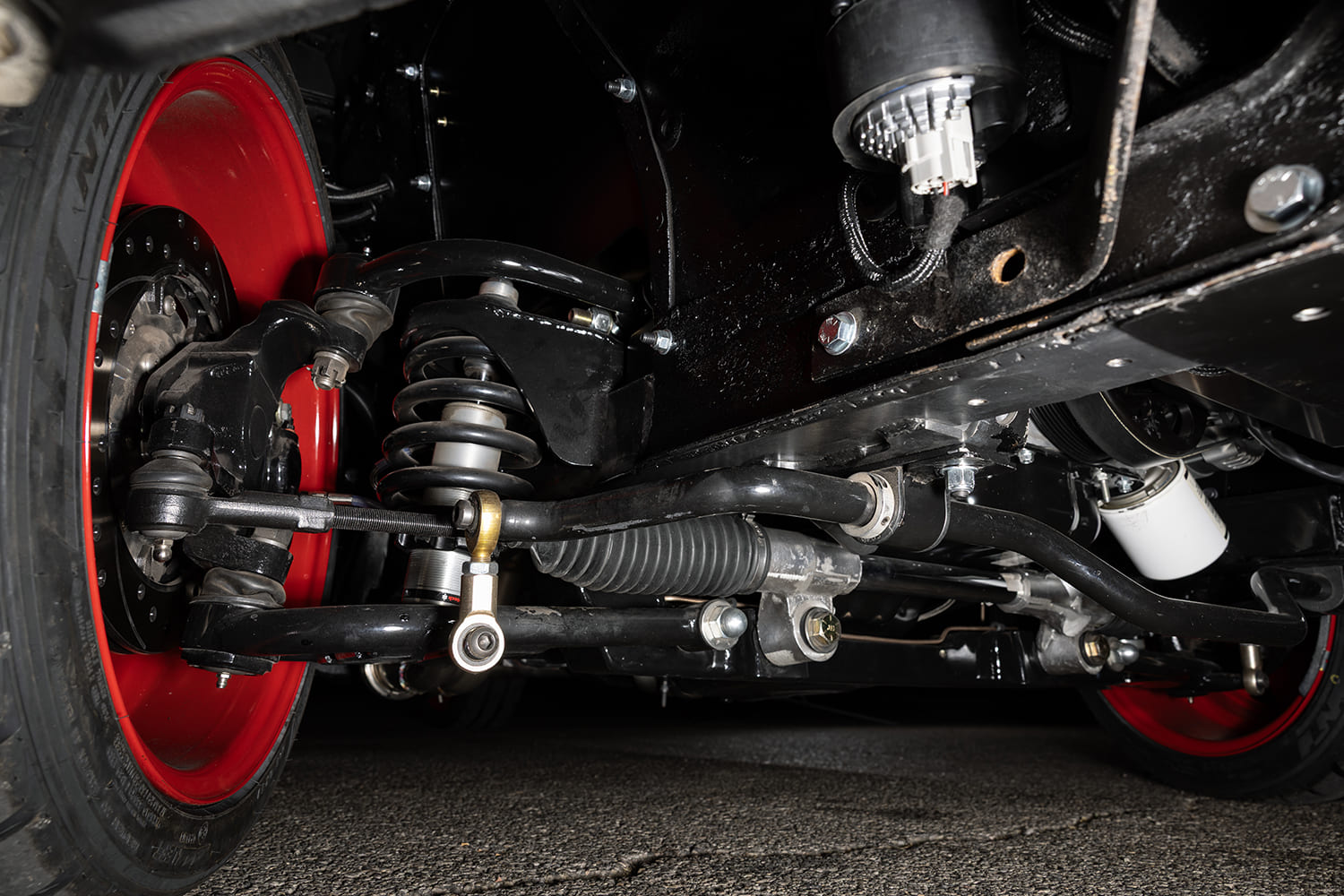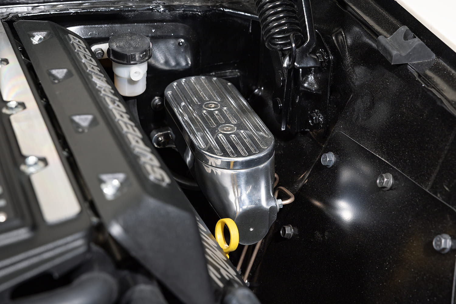 Once the chassis work was finished, the crew properly installed the 5.0 engine and began adding accessories, including custom long-tube headers built in-house and a full 3-inch oval-pipe exhaust system featuring four Black Widow mufflers to control the engine’s rumble. Naturally, the Coyote received an Edelbrock TVS 2650 blower, along with a 4-inch aluminum Spectre air intake kit, a K&N air filter, and a Northern Radiator with a brushless electric fan to keep the Coyote running at optimal temperatures.