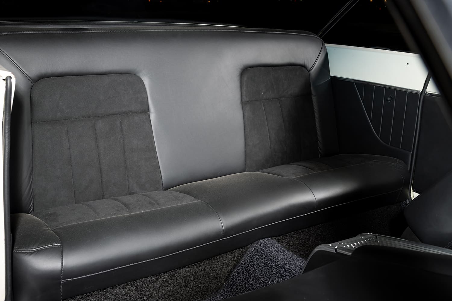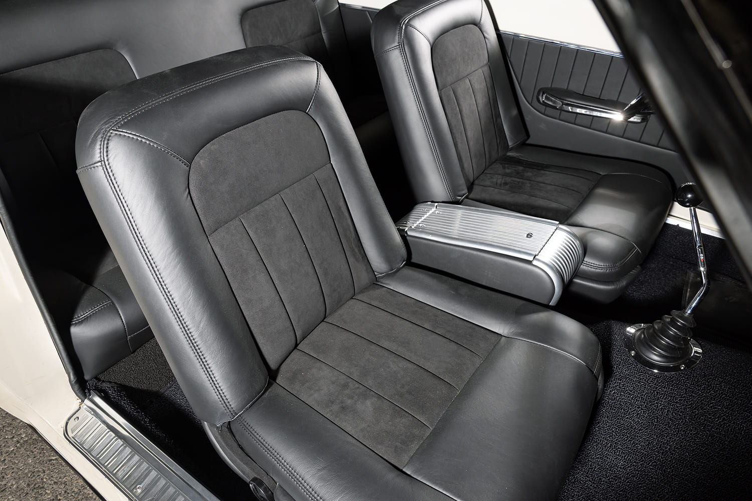 The car’s interior was the last to be fully renovated, starting with DEI Boom Mat underneath new carpeting and the upgraded stock bucket seats and rear bench, which were covered in high-end Douglass Interior Products Caledonian Scottish leather. Bidle Upholstery in Pullman, Washington, handled the stitching on the seats, as well as the front center console and matching door panels. The Falcon’s cockpit was also upgraded with Dakota Digital VHX gauges, Vintage Air A/C, and sleek paintwork to unify the look.