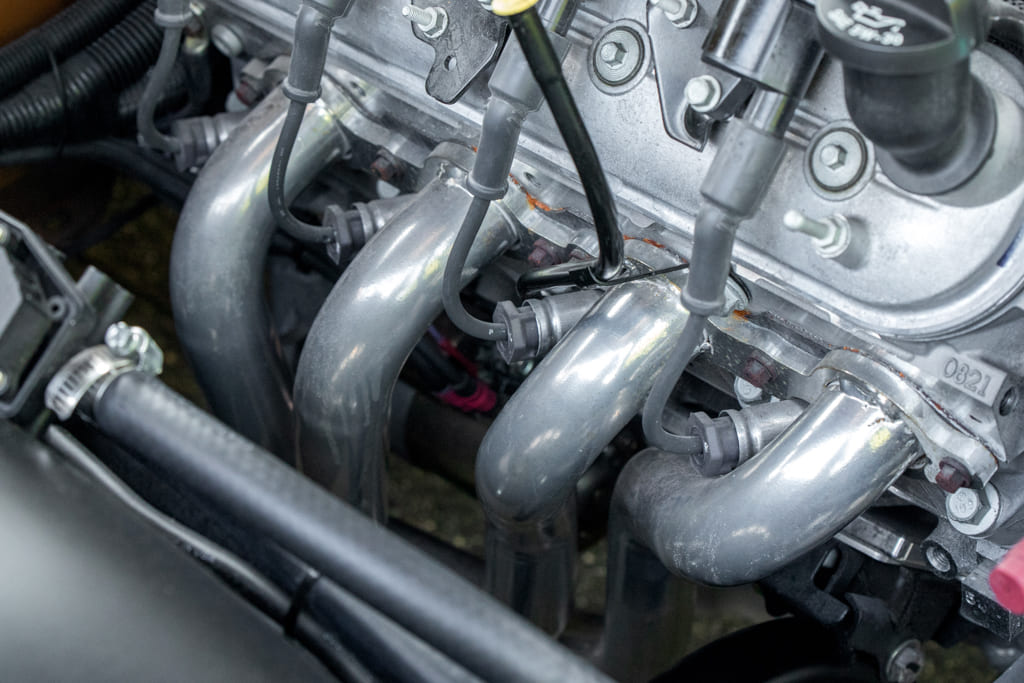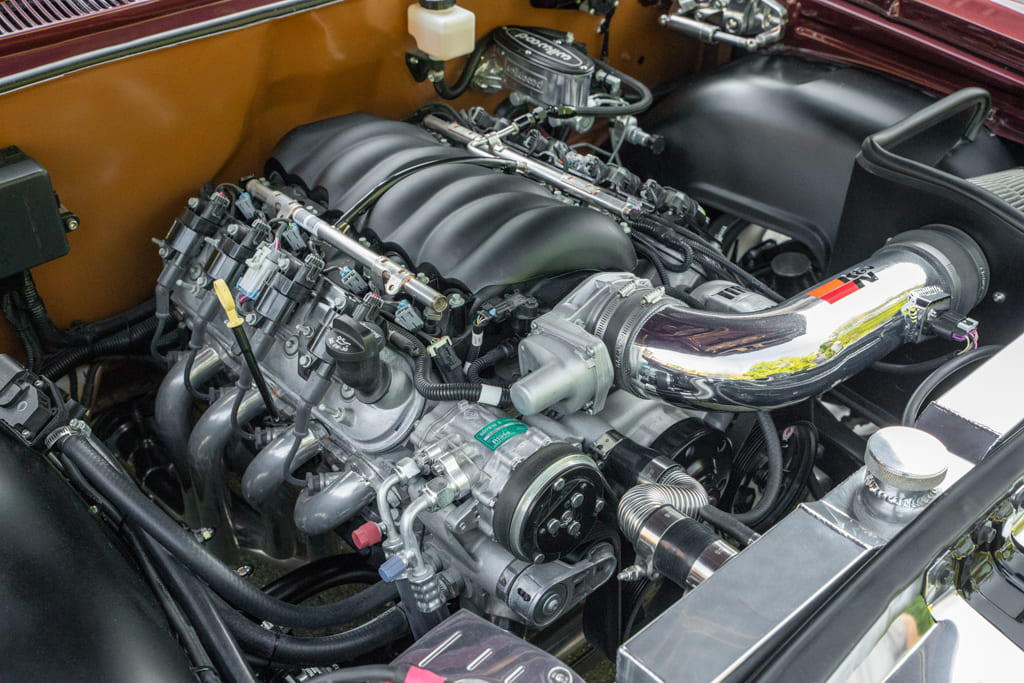 007 Engine bay of a classic car featuring a modern V8 engine swap