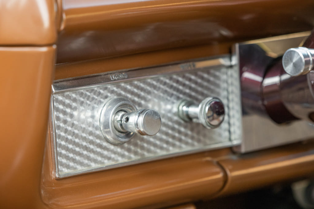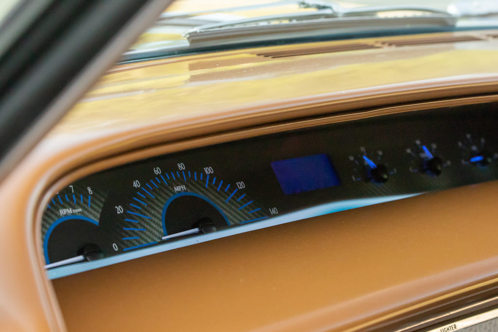 With the exterior completed, Benjamin from Joe’s team installed the Classic Industries factory interior bits. “I wanted the interior to give off a grandpa sleeper theme,” Montie explains. “The only upgrades inside are the Dakota Digital dash insert and VHX gauges, ididit steering column, and the Vintage Air HVAC system. With those modern elements, the car still carries that old-school demeanor.”