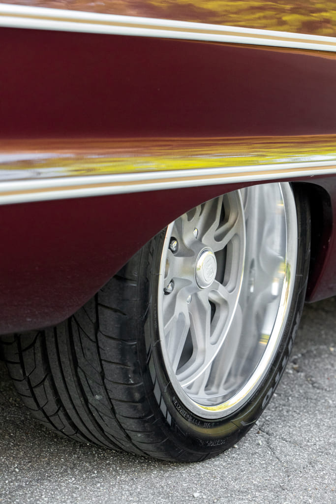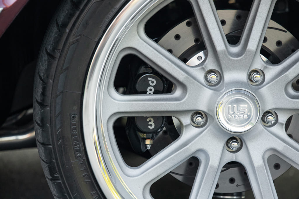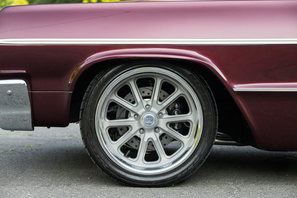 U.S. Mags Rambler wheels with matte gunmetal machined finish wrapped in Nitto rubber keep the car in the proper era while providing a touch of modern flair. The ensemble offers a great look that accents the Impala’s timeless, classic style.
