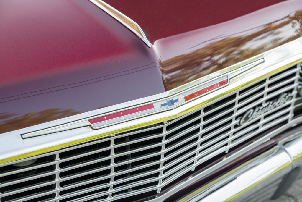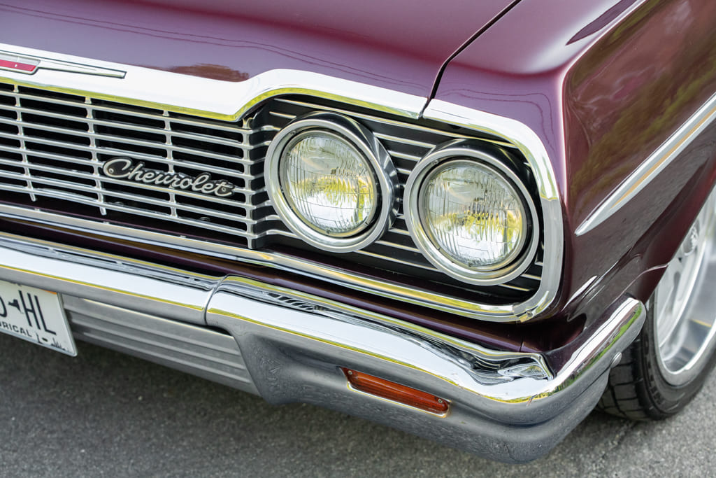 005 Frontal view of a vintage Chevrolet Impala showcasing grille and headlights