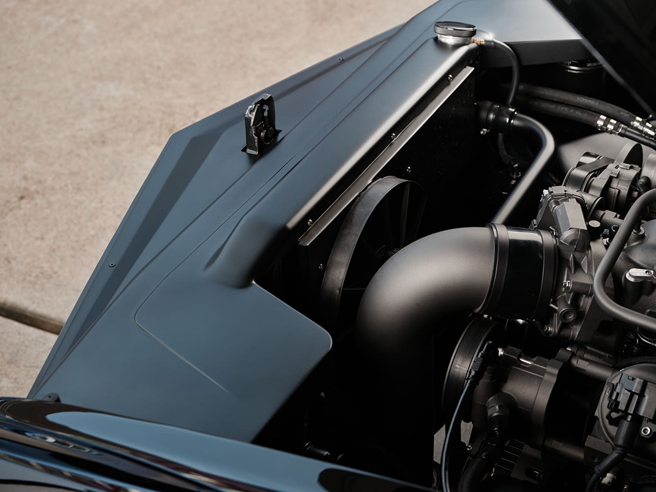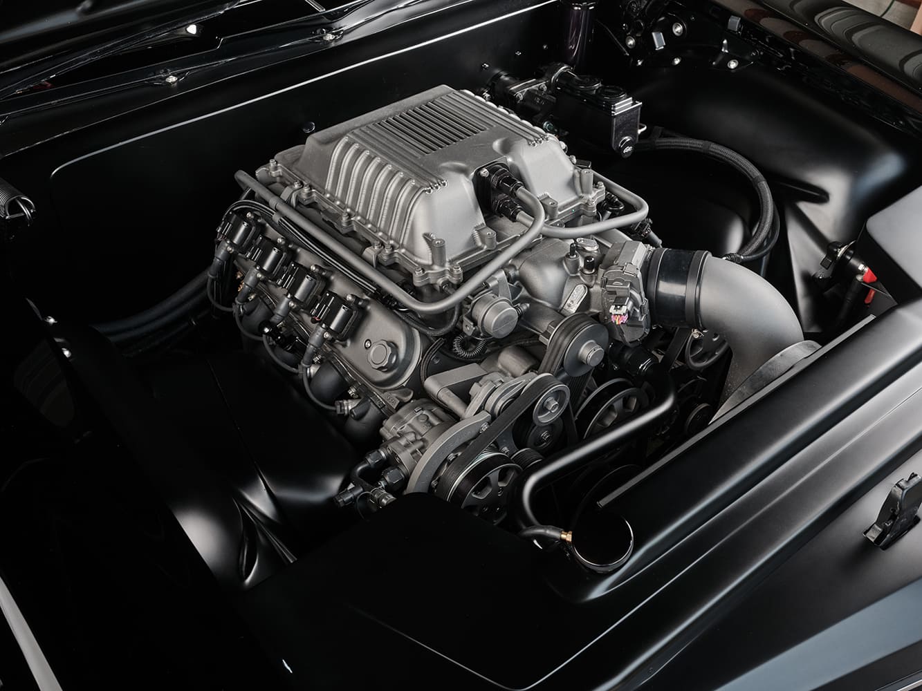 Much of the original factory sheetmetal was retained and painted with a two-stage basecoat/clearcoat PPG black while at HRG. Emblems, rockers, the antenna, lower front grille trim, and the “R” gunsight on the hood spear were removed and filled. The vertical bars and “fangs” on the front grille and bumper were also painted black. To further enhance the smooth appearance, the individual grilles at the top of the cowl were removed in favor of a seamless transition between the cowl and hood. Bieth of HRG smoothed over the firewall and fabricated a pair of custom inner front fenders covering the upper control arms.